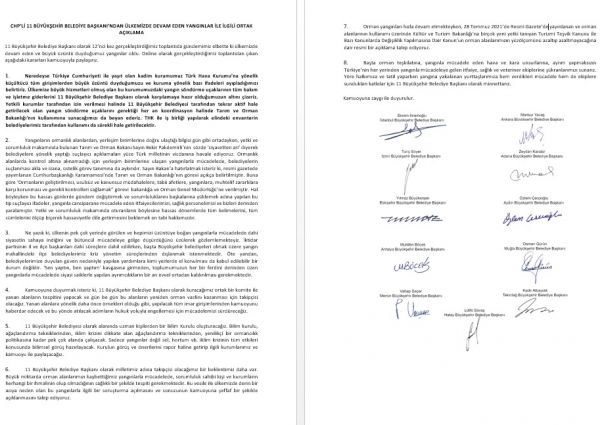 “BELEDİYELERİN SUÇLANMASI, AKLA VE İZANA AYKIRIDIR”1. Neredeyse Türkiye Cumhuriyeti ile yaşıt olan kadim kurumumuz Türk Hava Kurumu’na yönelik küçültücü tüm girişimlerden büyük üzüntü duyduğumuzu ve kuruma yönelik bazı ifadeleri ayıpladığımızı belirtiriz. Ülkemize büyük hizmetleri olmuş olan bu kurumumuzdaki yangın söndürme uçaklarının tüm bakım ve işletme giderlerini, 11 Büyükşehir Belediye Başkanı olarak karşılamaya hazır olduğumuzun altını çizeriz. Yetkili kurumlar tarafından izin verilmesi halinde 11 Büyükşehir Belediyesi tarafından tekrar aktif hale getirilecek olan yangın söndürme uçaklarını gerektiği her an koordinasyon halinde Tarım ve Orman Bakanlığı’nın kullanımına sunacağımızı da beyan ederiz. THK ile iş birliği yapılarak, elindeki envanterin belediyelerimiz tarafından kullanımı da sürekli hale getirilecektir.“SİYASETİN SAHAYA İNMESİ YANGINLA MÜCADELEYE GÖLGE DÜŞÜRÜYOR”2. Ne yazık ki, ülkenin pek çok yerinde görülen ve hepimizi üzüntüye boğan yangınlarla mücadelede dahi, siyasetin sahaya indiğini ve bütüncül mücadeleye gölge düşürdüğünü üzülerek gözlemlemekteyiz. İktidar partisinin il ve ilçe başkanları dahi süreçlere dahil edilirken, başta Büyükşehir Belediyeleri olmak üzere, yangın mahallindeki ilçe belediyelerimiz kriz yönetim süreçlerinden dışlanmak istenmektedir. Öte yandan, belediyelerimize duyulan güven nedeniyle yapılan yardımlara, kimi yerlerde el konulması da kabul edilebilir bir durum değildir. ‘Sen yaptın, ben yaptım’ kavgasına girmeden, toplumumuzun her bir ferdini derinden üzen yangınlarla mücadelede, siyasi saiklerle yapılan ayrımcılıkların bir an evvel ortadan kaldırılması gerekmektedir.“ORTAK KOMİTE KURUP, YANAN ALANLARIN TESPİTİNİ YAPACAĞIZ”3. Kamuoyuna duyurmak isteriz ki; 11 Büyükşehir Belediye Başkanı olarak, kuracağımız ortak bir komite ile yanan alanların tespitini yapacak ve gün be gün bu alanların yeniden orman vasfını kazanması için takipçisi olacağız. Yanan alanlara yönelik daha önce örnekleri olduğu gibi, yapılacak tüm imar girişimlerinden kamuoyunu haberdar edecek ve bu yönde atılacak adımların hukuk yoluyla engellemesi için mücadelemizi sürdüreceğiz.BİLİM KURULU OLUŞTURULACAK4. 11 Büyükşehir Belediyesi olarak; alanında uzman kişilerden bir Bilim Kurulu oluşturacağız. Bilim Kurulu, ağaçlandırma tekniklerinden, yangın takip süreçlerine kadar pek çok alanda çalışacak. Kurulun görüş ve önerilerini rapor haline getirip ilgili kurumlarımız ve kamuoyu ile paylaşacağız.“THK KONUSUNDA İŞ BİRLİĞİNE HAZIRIZ” 5. 11 Büyükşehir Belediyesi olarak alanında uzman kişilerden bir Bilim Kurulu oluşturacağız. Bilim kurulu, ağaçlandırma tekniklerinden, iklim krizini dikkate alan ağaçlandırma tekniklerinden, yenilikçi bir ormancılık politikasına kadar pek çok alanda çalışacak. Sadece yangınlar değil sel, hortum vb. iklim krizinin tüm etkileri konusunda bilimsel görüş hazırlayacak. Kurulun görüş ve önerilerini rapor haline getirip ilgili kurumlarımız ve kamuoyu ile paylaşacağız.“İHMALİ OLANLARIN TAKİPÇİSİ OLACAĞIZ”6. 11 Büyükşehir Belediye Başkanı olarak; milletimiz adına takipçisi olacağımız bir beklentimiz daha var. Büyük miktarda orman alanlarımızı kaybettiğimiz yangınlarla mücadelede, sorumluluk sahibi kişi ve kurumların herhangi bir ihmalinin olup olmadığının sağlıklı bir şekilde tespiti gerekmektedir. Bu vesile ile ülkemizde derin bir acıya neden olan bu yangınlarla ilgili bir soruşturma açılmasını ve sonucunun kamuoyuna şeffaf bir şekilde açıklanmasını talep ediyoruz.