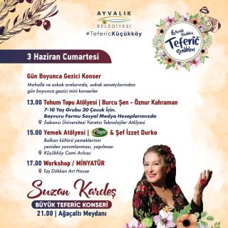 Balkan şarkılarının sevilen yorumcusu Suzan Kardeş, 3 Haziran Cumartesi saat 21.00’de Ağaçaltı Meydanı’nda Teferic Şenlikleri’nde hayranlarıyla buluşacak. Verdiği her konserde ayrı bir hikâye anlatan ve dinleyicileri büyülü yolculuklara çıkaran Kardeş, Ayvalık Belediyesi’nin ev sahipliğinde bu yıl Büyük Teferic Konseri’nde, ‘Balkan Şenliği’ adını verdiği bir konseptle Balkan kültüründe Teferic’in karşılığı olan Hıdırellez’in coşkusunu binlerce kişiyle yaşayacak.
