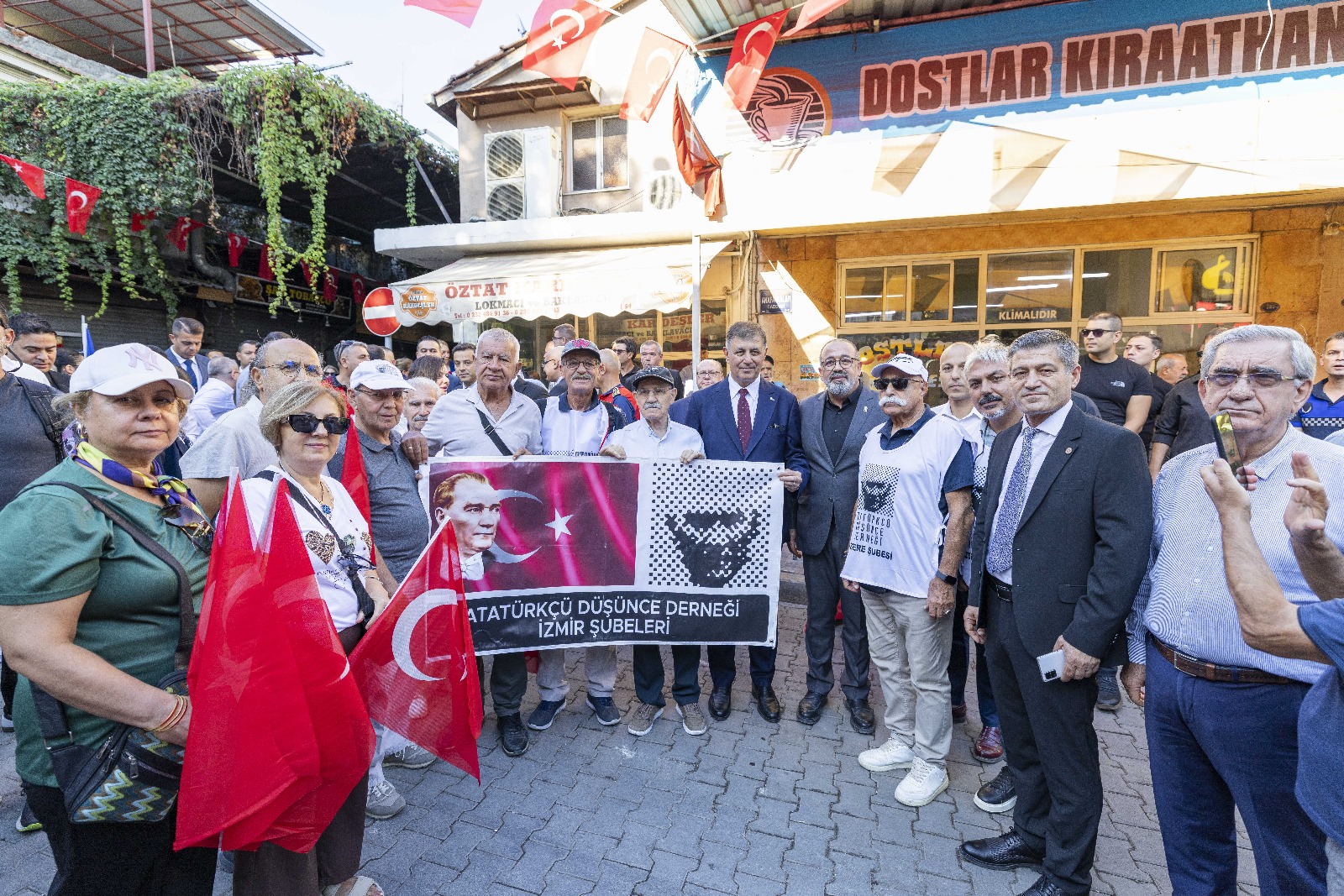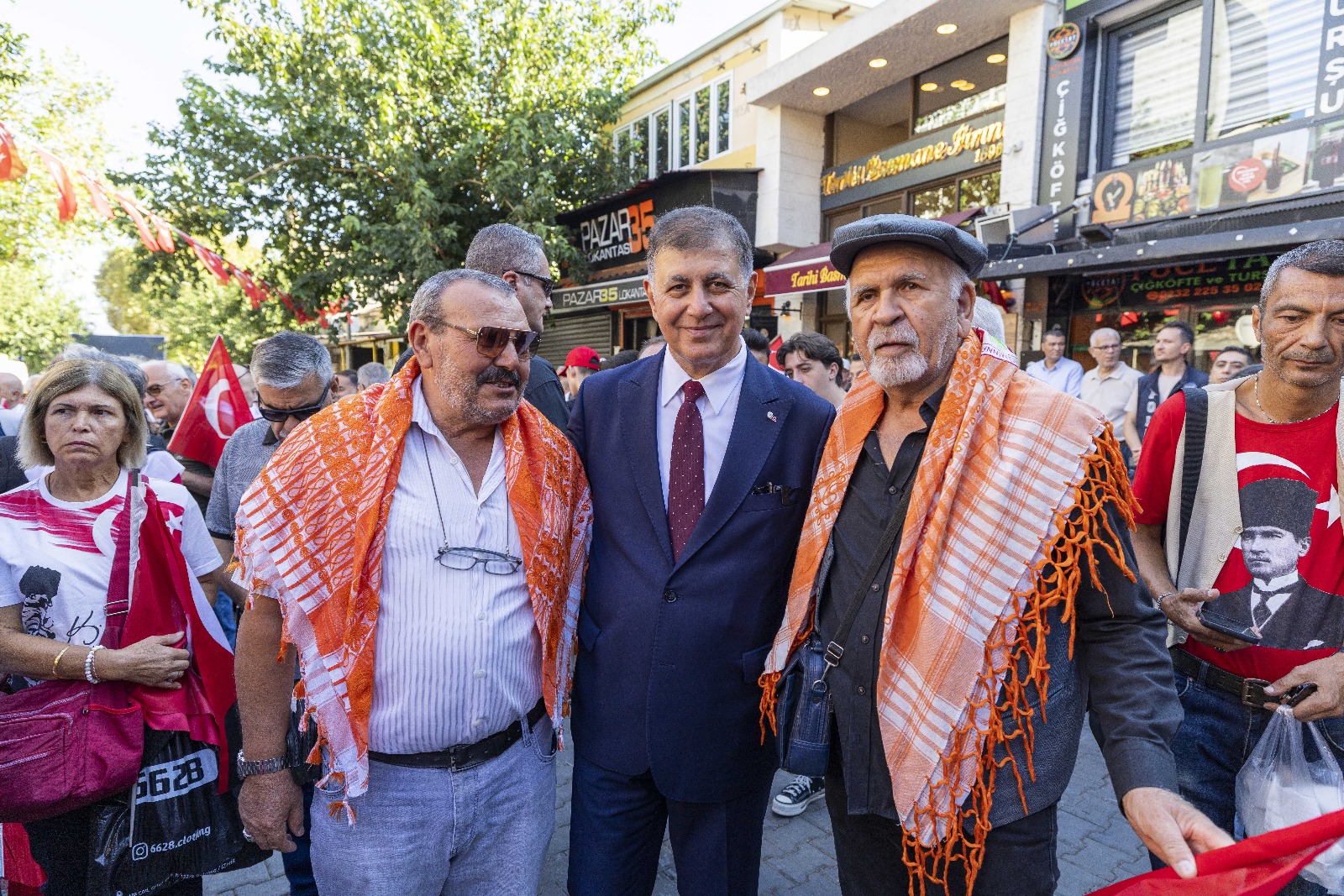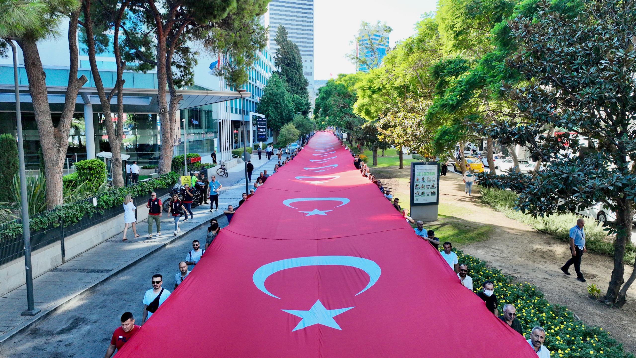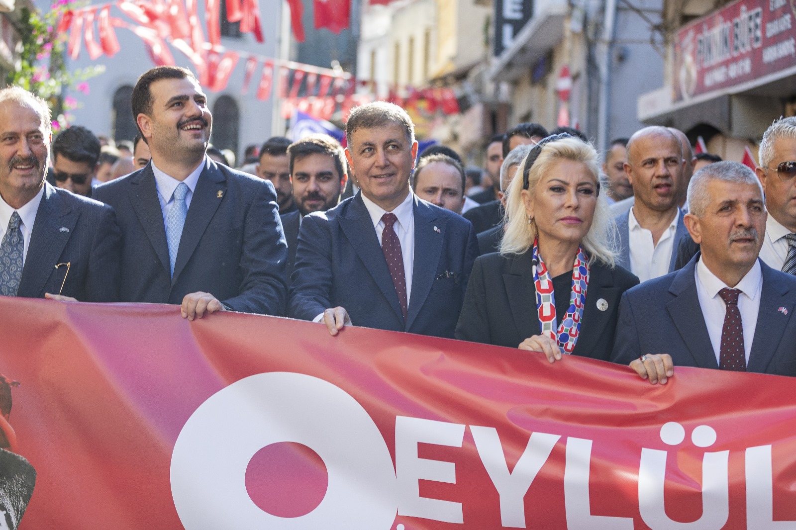 EGEMENLİK - İzmir’de kurtuluşun 103’üncü yıl dönümü kutlamaları kapsamında Türk ordusunun 9 Eylül 1922'de kente girerken kullandığı güzergâh üzerinde 9 Eylül Zafer Yürüyüşü düzenlendi. İzmir Büyükşehir Belediye Başkanı Dr. Cemil Tugay’ın katıldığı yürüyüş, Basmane Karakolu önünden Cumhuriyet Meydanı’na kadar devam etti. Kortejde milletvekilleri, siyasi parti temsilcileri, ilçe belediye başkanları, meclis üyeleri, bürokratlar, iş dünyası, sivil toplum örgütlerinin temsilcileri ve binlerce İzmirli yer aldı. Yürüyüşte 350 metre uzunluğundaki dev Türk Bayrağı taşındı. İzmirliler marşlar eşliğinde yürüyenlere alkışladı. Zafer Yürüyüşü Cumhuriyet Meydanı’nda noktalandı. Program kapsamında İzmir Valisi Dr. Süleyman Elban, Ege Ordusu ve Garnizon Komutanı Orgeneral İrfan Özsert ve İzmir Büyükşehir Belediye Başkanı Dr. Cemil Tugay, Cumhuriyet Meydanı’nda bulunan Atatürk Anıtı’na çelenk sundu. Tören, saygı duruşunda bulunulması ve İstiklal Marşı’nın okunmasının ardından son buldu.Bando takımı eşlik etmedi Dün Balçova’daki polis merkezine yapılan saldırıda birinci sınıf emniyet müdürü polis başmüfettişi Muhsin Aydemir ve polis memuru Hasan Akın’ın şehit olması nedeniyle yürüyüşe bando takımı eşlik etmedi. İzmir Büyükşehir Belediyesi 8-9 Eylül tarihlerinde İEF kapsamında yapılacak konser ve eğlence etkinliklerini de iptal etmişti.