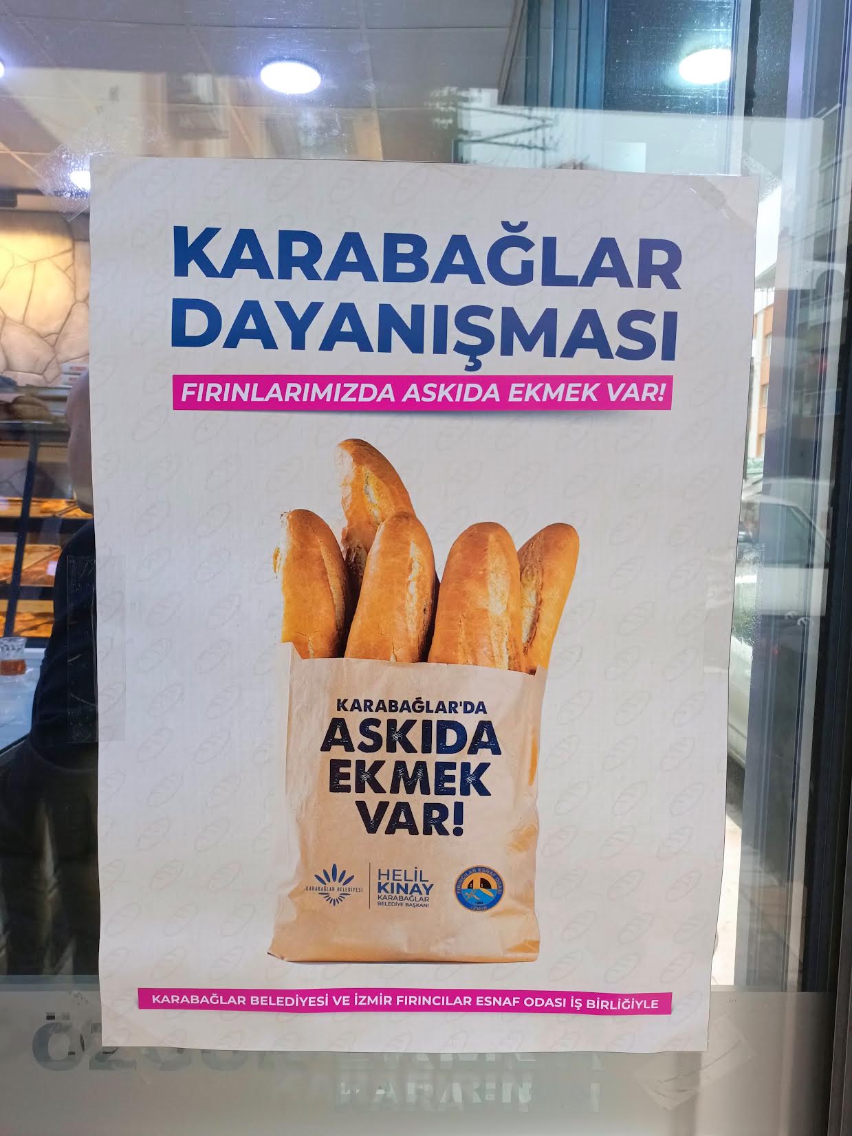Karabağlar Belediye Başkanı Helil Kınay ve İzmir Fırıncılar Esnaf Odası Başkanı Kemal Sırtı, projenin startını ilçedeki fırınları ziyaret ederek verdi. Kınay ve Sırtı, fırınların camlarına “Karabağlar Dayanışması” yazılı afişleri astı.