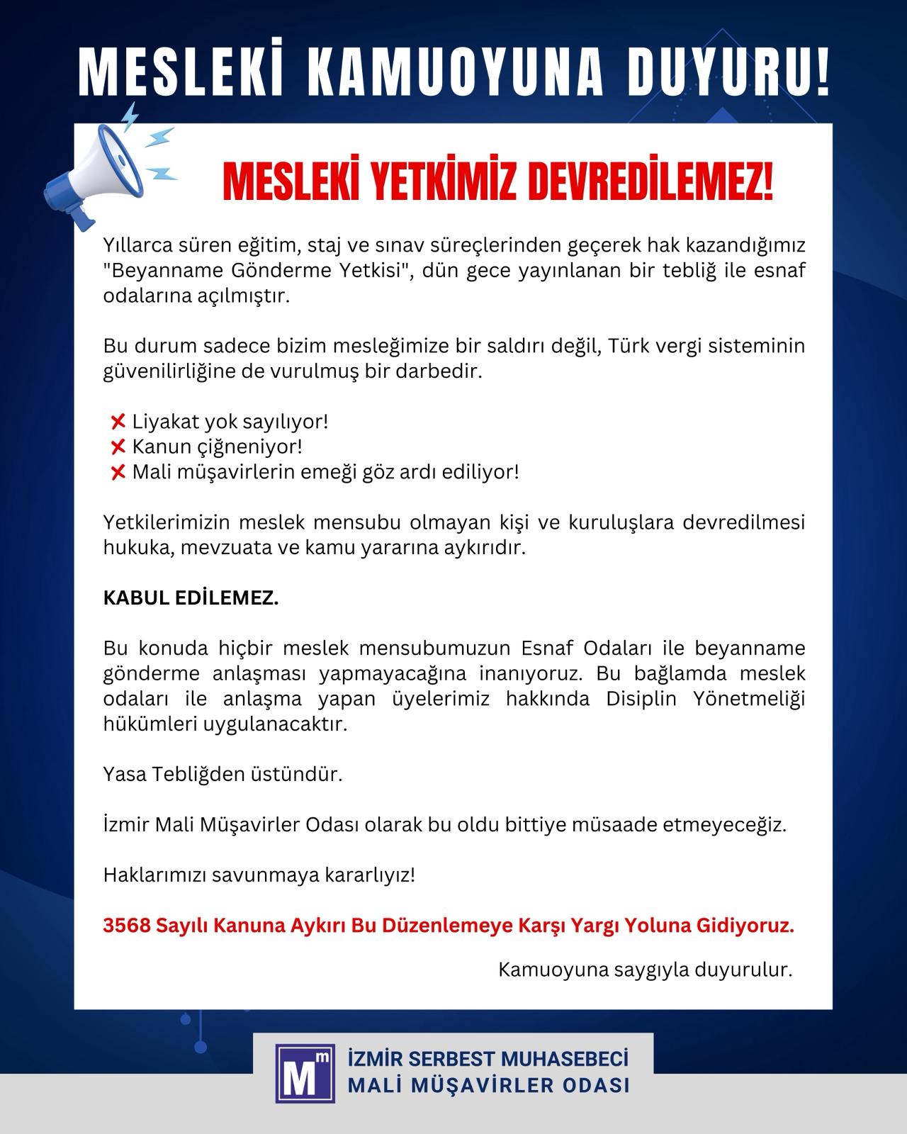 HABER: LEVENT HAMURCUOĞLUEGEMENLİK - Büyükşehirlerin nüfusu 30 bini geçen ilçelerinde bazı basit usuldeki esnafın gerçek usule 1 Ocak 2026’da geçmesi kararlaştırılırken deftere geçen esnafın defterlerini oda ve birliklerin tutmasına izin verilmesine mali müşavirlerden tepki geldi.Resmi Gazete'de yayımlanan tebliğ kapsamında, 1 Ocak 2026'dan itibaren gerçek usulde vergilendirilecek mükelleflerin, kayıt ve beyanname verme gibi işlemlerinin yürütüldüğü Defter-Beyan Sistemi kapsamındaki işlemleri, bağlı oldukları meslek odaları ve birlikler tarafından da yapılabilecek.Mali müşavirlerin yıllarca süren eğitim, staj ve sınav süreçlerinden geçerek elde edilen “Beyanname Gönderme Yetkisi”, 13 Aralık 2025 gecesi yayımlanan bir tebliğ ile esnaf odalarına da açıldı. Bu gelişme, mali müşavirler arasında geniş yankı bulurken, esnaf camiasında da çeşitli tartışmalara neden oldu.YENİ DÜZENLEME NELERİ KAPSIYOR?Tebliğ ile birlikte, esnaf odaları artık vergi beyannamelerini entegre bir sistem üzerinden gönderebilecek. Bu değişiklik, küçük işletmelerin ve esnafın vergi süreçlerini kolaylaştırmayı hedefliyor. Ancak, mali müşavirler, bu durumun beraberinde bazı endişeleri de getirdiğini belirtiyor.MALİ MÜŞAVİRLERDEN SERT TEPKİMali müşavirler, yıllarca süren eğitim ve tecrübe gerektiren bu yetkinin esnaf odalarına verilmesini eleştiriyor. İzmir Serbest Muhasebeci Mali Müşavirler Odası tarafından yapılan açıklamada, “Bu yetki, yıllarca süren bir süreçle elde edilmiş bir hak. Esnaf odalarına verilmesi, vergi beyan süreçlerinde uzmanlık gerektiren konularda hatalara yol açabilir” denildi. Ayrıca, yetkinin yanlış kullanılmasının mükellefler için ciddi sorunlar doğurabileceği vurgulandı.Beyanname gönderme yetkisinin esnaf odalarına açılması, Türkiye'deki vergi sisteminin dinamiklerinde önemli bir değişiklik olarak öne çıkıyor. Yeni düzenlemenin ileriye dönük etkileri ve uygulama süreçlerinin nasıl işleneceği ise merakla bekleniyor.TEBLİĞ GERİ ÇEKİLMELİKonu ile ilgili bir açıklama yapan İzmir Serbest Muhasebeci Mali Müşavirler Odası (İZSMMMO) Yönetim Kurulu Başkanı Mehmet Kuzu, esnafın defterlerini oda ve birliklerin tutmasına izin verilmesine tepki göstererek “Mesleğimiz yok sayılamaz. Taleplerimiz, tebliğin ilgili maddeleri derhal geri çekilmelidir. Meslek mensuplarının emeğini yok sayan bu anlayıştan derhal vazgeçilmelidir” dedi.Kuzu konuşmasında, “Mesleğimiz yok sayılamaz! 13 Aralık 2025 tarihli Resmî Gazete’de yayımlanan Vergi Usul Kanunu Genel Tebliği (Sıra No: 586) ile işletme hesabı esasına göre defter tutan mükelleflerin defter ve beyan işlemlerinin meslek odaları ile birlikler aracılığıyla yapılmasının önü açılmıştır. Bu düzenleme, 3568 sayılı Kanunla tanımlanmış Serbest Muhasebeci Mali Müşavirlik mesleğinin yetki, sorumluluk ve emeğini açıkça görmezden gelmektedir. Kabul edilemez. Defter tutma ve beyanname düzenleme faaliyeti, meslek mensuplarının asli ve münhasır görevidir. Meslek odaları; temsil, eğitim ve disiplin amacıyla kurulmuştur. Muhasebe hizmeti sunan birimler değildir. Bu tebliğ ile muhasebe hizmeti, kurumsal bir yapıya devredilerek meslek mensubu değersizleştirilmektedir” dedi.“SESSİZ KALMAYACAĞIZ”3568 Sayılı kanunun açık olduğunu vurgulayan Kuzu, “Muhasebe, defter tutma ve beyanname düzenleme yetkisi yalnızca yetkili meslek mensuplarına verilmiştir. Bir tebliğ ile kanunun dolanılması hukuken de vicdanen de kabul edilemez. Taleplerimiz, tebliğin ilgili maddeleri derhal geri çekilmelidir. Meslek mensuplarının emeğini yok sayan bu anlayıştan vazgeçilmelidir. Meslekle ilgili düzenlemeler, meslek örgütlerinin görüşü alınmadan yapılmamalıdır. Muhasebe hizmeti, ticari veya kurumsal yapılar üzerinden değil, meslek mensubu eliyle yürütülmelidir. Mali müşavirler sadece defter tutan değil, vergi sisteminin temel direği, kamu yararının teminatıdır. Mesleğimizi itibarsızlaştıran, emeğimizi değersizleştiren hiçbir düzenlemeye sessiz kalmayacaklarını” söyledi.ESNAF DA ŞAŞKINBeyanname gönderme yetkisinin esnaf odalarına açılması, Türkiye'deki vergi sisteminin dinamiklerinde önemli bir değişiklik olarak öne çıkıyor. Yeni düzenlemenin ileriye dönük etkileri ve uygulama süreçlerinin nasıl işleneceği ise merakla bekleniyor.