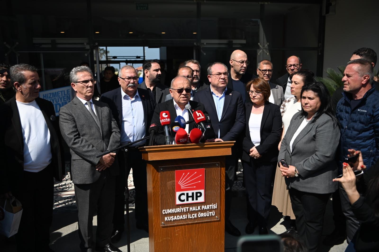 Kuşadası Belediye Başkanı Ömer Günel’in İstanbul’da gözaltına alınmasına tepkiler çığ gibi büyüyor. Bu kapsamda Kuşadası Belediyesi Ana Hizmet Binası önünde çevre il ve ilçelerden gelen milletvekilleri, CHP’li yöneticiler ve belediye başkanlarının katılımıyla bir basın açıklaması düzenlendi. Basın açıklamasında konuşan CHP Aydın il Örgütü Başkanı Hikmet Saatçı, “Bizi bu kumpaslarla yıldırmazlar” derken CHP Aydın Milletvekili Süleyman Bülbül ise , “Ömer Günel başkanımız yalnız değildir” dedi.