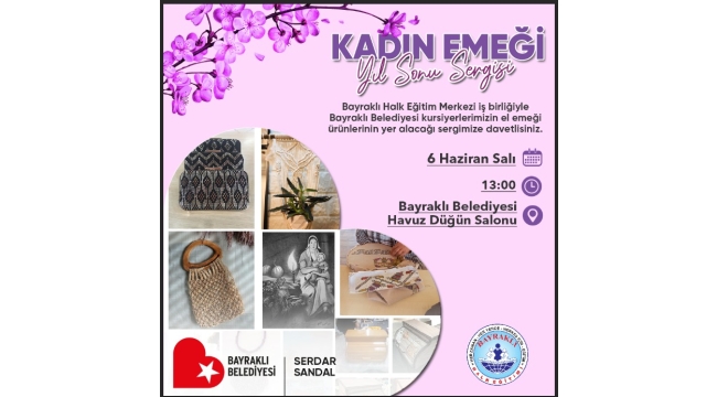 Bayraklı Belediyesi ve Halk Eğitim Merkezi iş birliğiyle açılan beceri ve hobi kurslarına katılan kadınlar, sezon boyunca ürettikleri el emeği ürünleri görücüye çıkarıyor. Bu kapsamda 6 Haziran Salı Bayraklı Belediyesi Havuz Düğün Salonu’nda yıl sonu sergisi açılacak. Ziyaretçiler, gün boyunca birbirinden değerli takı-tasarım ve ev aksesuarlarını uygun fiyatlara alabilecek.