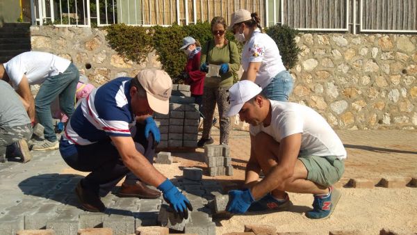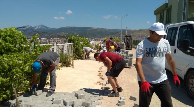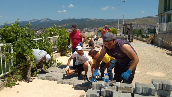 Güzelbahçe Belediyesi personeli Koronavirüs salgını nedeniyle idari izinlerin bitmesinden sonra normal mesai saatlerinde çalışmasına başladı. İşlerin aksamaması ve hizmetin sağlanması için Müdürler, memurlar ve büro personelleri şantiye de çalışan arkadaşlarıyla taş döşedi, park bahçelerde çim biçti.