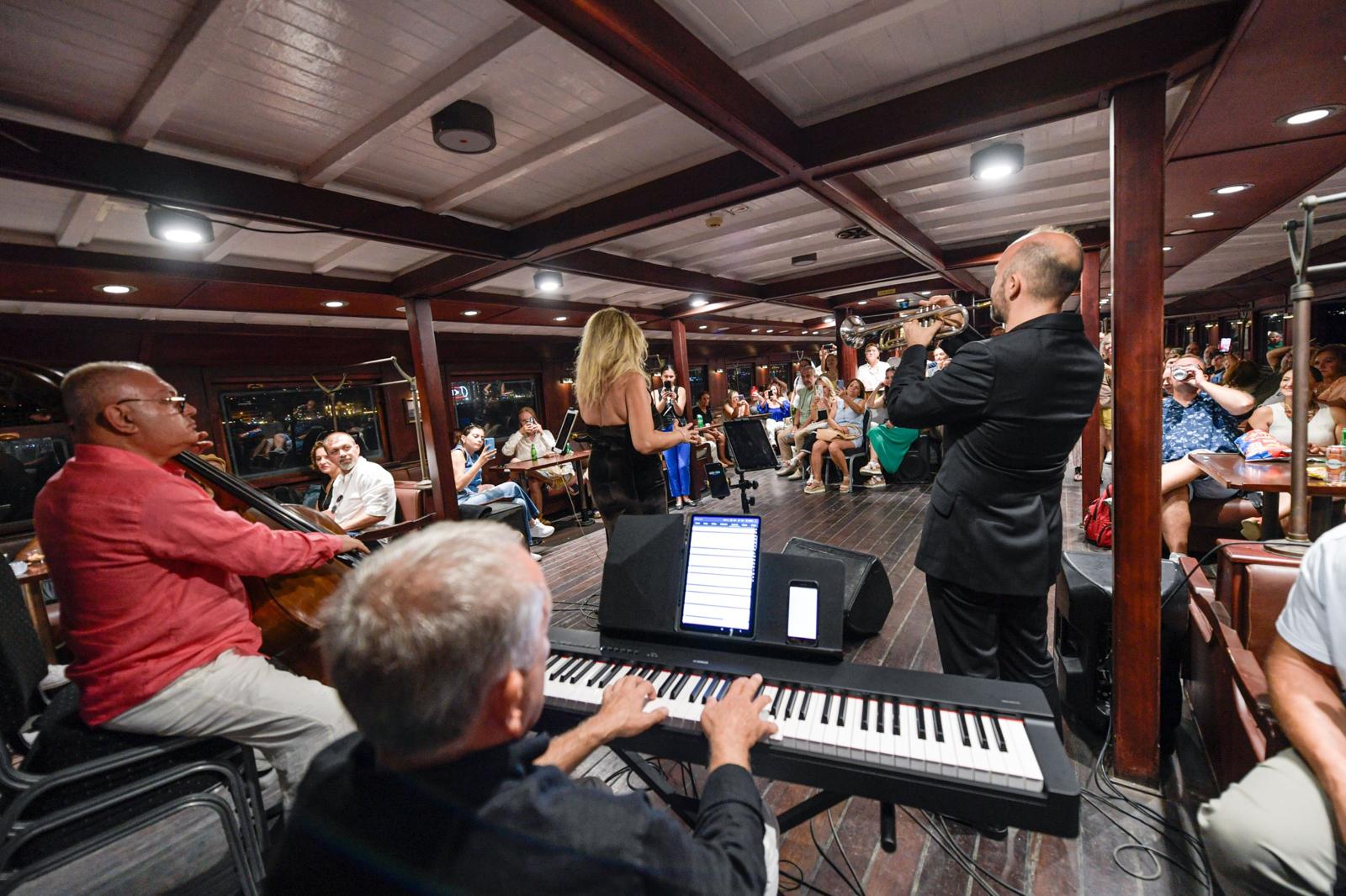 EGEMENLİK - Tarihi Bergama Vapuru, bu kez çok renkli ve coşkulu bir konsere ev sahipliği yaptı. Yerli ve yabancı çok sayıda sanatseverin katıldığı Caz Gecesi etkinliğinde Nükhet Yalçın Jazz Quartet’in melodileri yankılandı. Konser sırasında İzmir Körfezi turu yapan tarihi vapur, dinleyicilere unutulmaz bir akşam yaşattı. Bazı sanatseverler, cazın ritmine kapılarak sahnede dans etti. Nükhet Yalçın, müzikseverlere caz ve Latin müziğin klasiklerinden Türk Hafif Müziği’nin unutulmaz eserlerine, rock ve blues çeşitlemelerinin farklı yorumlarına kadar geniş yelpazede şarkılar seslendirdi. Nükhet Yalçın Jazz Quartet’e piyanoda Mehmet Ariç, basta Uğur Yalçın ve virtüöz trompet sanatçısı Uğur Sayınbatur eşlik etti.