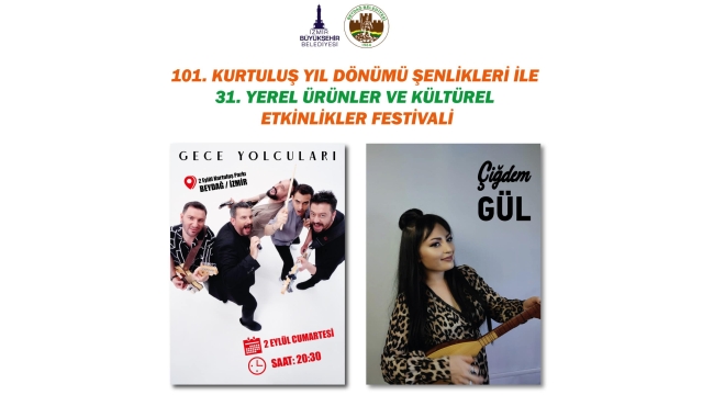 Beydağ’ın Düşman İşgalinden Kurtuluşunun 101. Yıl Dönümü Şenlikleri ile 31. Yerel Ürünler ve Kültürel Etkinlikler Festivali 02 Eylül 2022 Cumartesi günü saat 09.30’da Atatürk Anıtı’na çelenk sunulacaktır. Ardından kortej yürüyüşü 10.00’da Beydağ Belediyesi Kültür Merkezi ve Konuk Evi önünde başlayarak Atatürk Anıtı’nda tamamlanacağını ifade eden Başkan Yılmazlar, “Burada Beydağ’ımızın değerli ürünü incir yarışması yapılacak ve halk oyunları gösterileri sergilenecek. Gecenin finalinde ise önce Beydağ’ın yetenekli sesleri Çağrı Altınmakas, Kuzey Yaşar, Kayra Alp Kara ve Kerem Mercan sahne alacak. Ardından halk müziği sanatçısı Çiğdem Gül ve finalde Gece Yolcuları’nın konserini gerçekleştireceğiz” diye konuşarak 2 Eylül Cumartesi akşamı herkesi Beydağ’a davet etti.