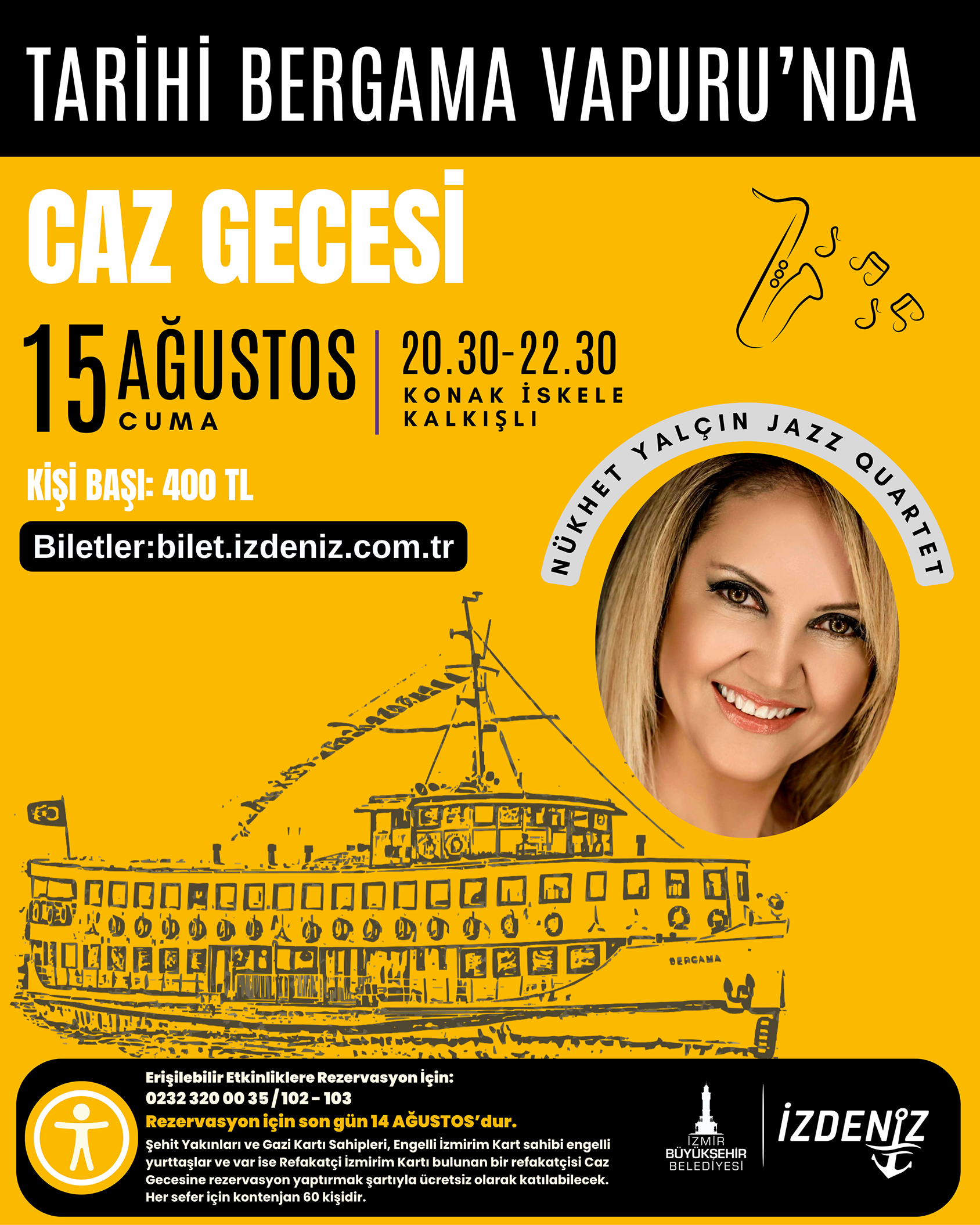 EGEMENLİK - İzmir Büyükşehir Belediyesi İZDENİZ AŞ, İzmir Körfezi’nde etkinlikler düzenlemeye devam ediyor. Tarihi Bergama Vapuru’nda 15 Ağustos Cuma günü caz gecesi etkinliği var. Nükhet Yalçın, müzikseverlere, caz ve Latin müziğin klasiklerinden Türk Hafif Müziği’nin unutulmaz eserlerine, rock ve blues çeşitlemelerinin farklı yorumlarına kadar geçmişten bugüne uzanan geniş yelpazede unutulmaz saatler yaşatacak. Nükhet Yalçın Jazz Quartet’e piyanoda Mehmet Ariç, basta Uğur Yalçın ve virtüöz trompet sanatçısı Uğur Sayınbatur eşlik edecek. Büfe hizmeti olacakSanatseverler, biletlere bilet.izdeniz.com.tr adresinden ulaşabilecek. Biletler 400 TL’den satışa sunuldu. Sanatseverler online biletleri için SMS ile iletilen linkten QR kod içeren Biniş Kartları ile gemiye biniş yapacak.Organizasyon süresince gemi içinde büfe hizmeti olacak ve dışarıdan yiyecek içecek kabul edilmeyecek. Şehit Yakınları ve Gazi Kartı sahipleri, Engelli İzmirim Kart sahibi engelli yurttaşlar ve var ise Refakatçi İzmirim Kartı bulunan bir refakatçisi caz gecesine rezervasyon yaptırmak şartıyla ücretsiz katılabilecek. Her sefer için kontenjan 60 kişi. Rezervasyon için 0 232 320 0035/102-103 aranabilir.