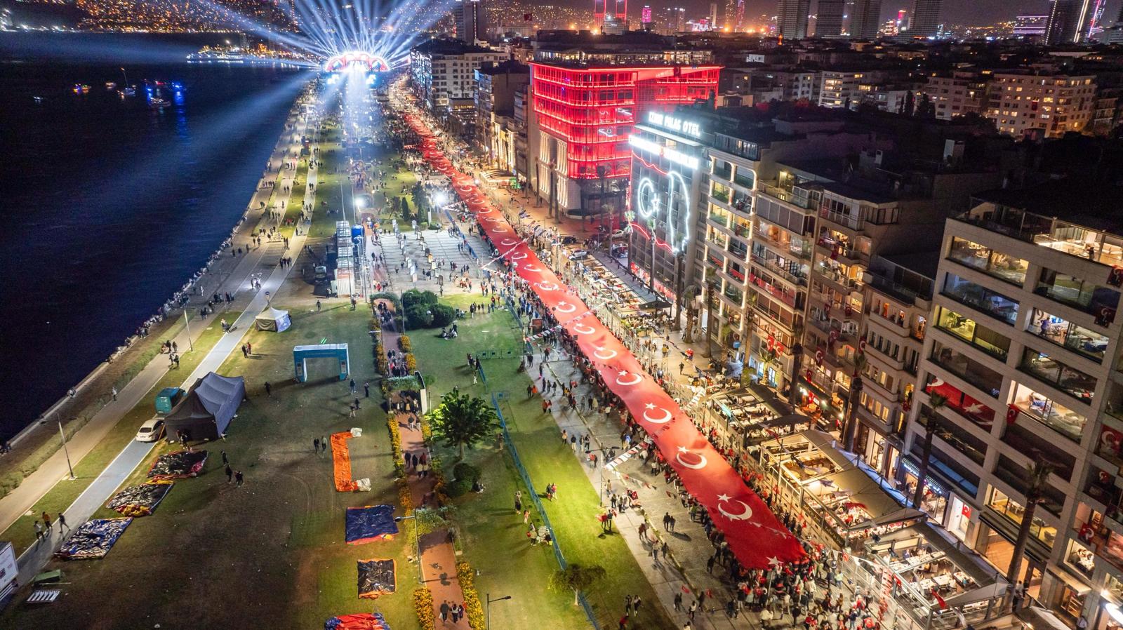 Fener alayı ve Haluk Levent konseri29 Ekim Cumhuriyet Bayramı kutlamaları ve geçit töreni ise saat 10.00’da Cumhuriyet Meydanı’nda başlayacak. Programda; protokol konuşmaları, öğrencilerin şiir okumaları, halk oyunları gösterileri ve dans gösterileri yer alacak. Ege Ordusu ve Garnizon Komutanlığı Bandosu 102. Yıl konseri ise Konak Atatürk Meydanı’nda saat 17.00’de başlayacak. Protokol ve yurttaşlardan oluşan kortej, Hükümet Konağı önünde saat 20.00’de toplanarak İzmir Büyükşehir Belediye Bandosu eşliğinde Alsancak istikametine doğru yürüyecek. Kortej, Konak Pier AVM’nin önünde 350 metrelik Türk bayrağı ve fener alayı ile birleşecek ve dev yürüyüş Cumhuriyet Meydanı'na doğru devam edecek. Cumhuriyet coşkusu, saat 21.00’de Gündoğdu Meydanı’nda düzenlenecek Haluk Levent konseri ile doruğa çıkacak.