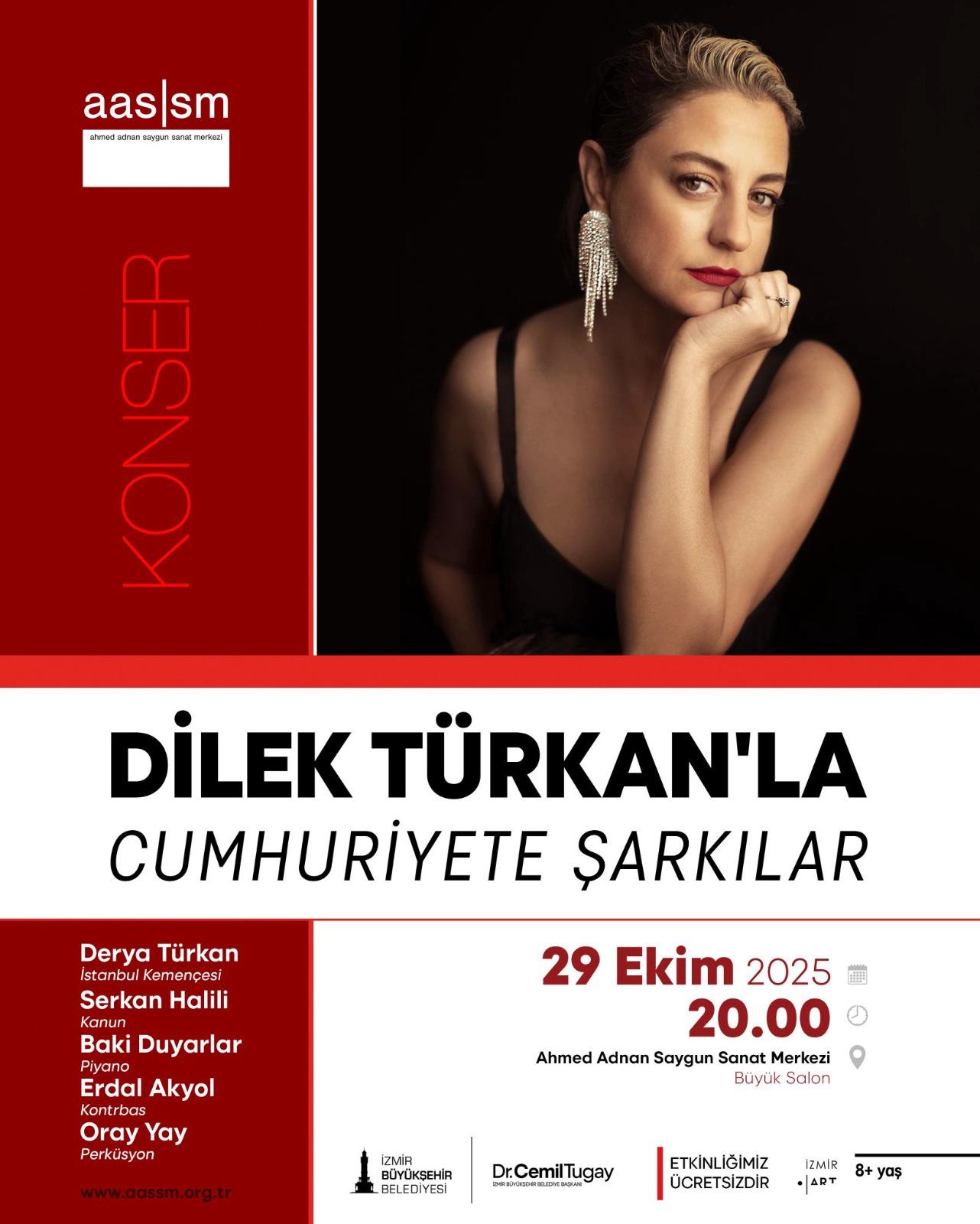 Dilek Türkan’la Cumhuriyet’e Şarkılar konseriKlasik Türk Müziği yorumcusu Dilek Türkan ile Cumhuriyet’e Şarkılar konseri, 29 Ekim Çarşamba günü saat 20.00’de Ahmed Adnan Saygun Sanat Merkezi`nde gerçekleştirilecek. Dilek Türkan’ın solist olarak yer alacağı konserde Derya Türkan (İstanbul kemençesi), Serkan Halili (kanun), Baki Duyarlar (piyano), Erdal Akyol (kontrbas) ve Oray Yay (perküsyon) seyirciyle buluşacak. Konserde, geçmişten günümüze Cumhuriyet döneminin Türk müziği eserleri seslendirilecek. Konsere katılım ücretsiz olacak.