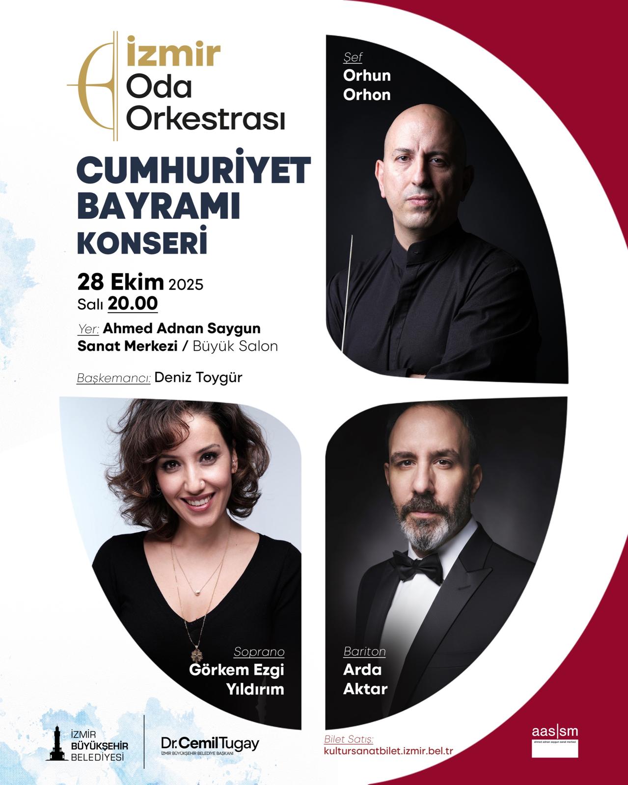 İzmir Oda Orkestrası Cumhuriyet Bayramı Konseriİzmir Oda Orkestrası Cumhuriyet Bayramı konseri, 28 Ekim Salı saat 20.00'de Ahmed Adnan Saygun Sanat Merkezi Büyük Salon'da sahnelenecek. İzmir Oda Orkestrası, Cumhuriyet’in 102. yılını coşkuyla kutlamak için sahnede olacak. Şef Orhun Orhon yönetiminde, soprano Görkem Ezgi Yıldırım ve bariton Arda Aktar’ın solistliğinde gerçekleşecek konserde, klasik batı müziğinin Türk öncü bestecilerinin eserleri ve seçkin aryalar yer alacak. Konserin bilet satışları, kultursanatbilet.izmir.bel.tr adresi üzerinden yapılıyor.