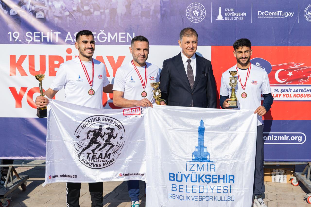 EGEMENLİK - İzmir Büyükşehir Belediyesi tarafından Menemen’de 95 yıl önce meydana gelen kanlı ayaklanmada Cumhuriyet karşıtı güçler tarafından şehit edilen Asteğmen Mustafa Fehmi Kubilay ve arkadaşlarını anmak için düzenlenen 10 kilometrelik Şehit Asteğmen Kubilay Koşusu 19’uncu kez yapıldı. Koşu, Menemen Karaağaç Yolu üzerinden başladı, Cumhuriyet Meydanı’nda noktalandı. Sporcular, bu yıl formalarının arkasında Gazi Mustafa Kemal Atatürk’ün gözleri, meşale figürü ve “Devrimlerin yılmaz bekçisiyiz” yazısıyla koşuya katıldı. Kategorilerinde ilk ona giren sporcular para ödülü kazanırken, ilk üçe girenlere para ödülünün yanı sıra kupa takdim edildi.İzmir Büyükşehir Belediye Başkanı Dr. Cemil Tugay’ın katıldığı madalya töreninde Cumhuriyet Halk Partisi (CHP) İzmir İl Başkanı Çağatay Güç, CHP Menemen İlçe Başkanı Hüseyin Özbey, Büyükşehir Belediyesi Meclis Üyesi Erdal Karagöz, siyasi partilerin temsilcileri, bürokratlar ve vatandaşlar da yer aldı. Başkan Tugay’ın yanı sıra Güç, Özbey ve Karagöz de sporculara ödüllerini verdi.