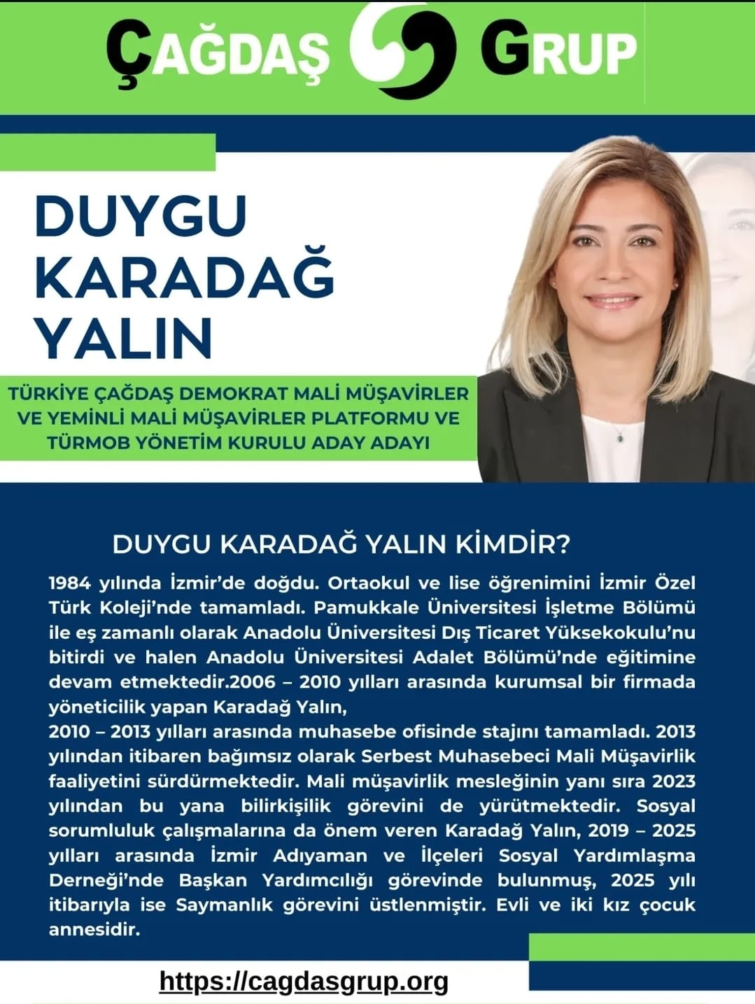 “UMUTLA YAŞAYACAĞIZ, ÇALIŞACAĞIZ VE MUTLAKA BAŞARACAĞIZ”TÜRMOB Yönetim Kurulu Üyeliği için Türkiye Çağdaş Demokrat Mali Müşavirler ve Yeminli Mali Müşavirler Platformu’ndan Aday Adayı olarak seçim çalışmalarını gece gündüz demeden tüm hızıyla sürdüren Mali Müşavir Duygu Karadağ Yalın, “Hedefleri arasında aday olup TÜRMOB’un tüm delegelerinden güvenoyu alarak, seçimi kazanmak ve İzmir’in Ege’nin hem umudu hem de sesi olmak istediğini” söyledi.Mali müşavir meslektaşlarının sorunlarını çok iyi bildiğini ve kendisininde aktif olarak mali müşavirlik mesleğini Bornova’daki bürosunda sürdürdüğünü dile getiren Yalın, “Yaptıklarımızın, yapmaya çalıştıklarımızın kıymetli mali müşavir meslektaşlarım ve değerli TÜRMOB delegeleri tarafından onaylandığını, desteklendiğini görmek beni gerçekten çok mutlu ederek, motivasyonumuzu artırıyor. Her geçen gün daha çok çalışacağız, daha çok proje üreteceğiz. Çünkü işimiz muhasebe, gücümüz muhasebe… Hep birlikte mali müşavir meslektaşlarımızı daha güzel yarınlara taşıyacağız. Birlikte yürüyeceğiz. İnancımız tam. Yolumuz açık. Umutla yaşayacağız, çalışacağız ve mutlaka başaracağız ama mutlaka kazanacağız” dedi.