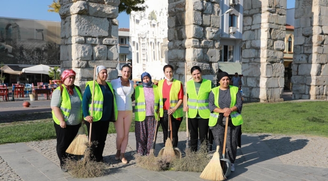 Efes Selçuk sokaklarını süpürgeleriyle temizleyecek kadınlar; “İşin kadını erkeği yoktur. Temiz bir Efes Selçuk için hep birlikte el ele çalışacağız” dediler.