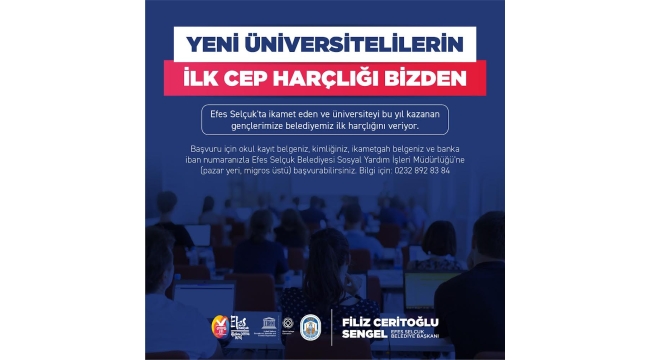 Efes Selçuk Belediyesi’nin yükseköğrenime başlayan gençlere sunduğu harçlık desteğinden yararlanmak isteyen öğrencilerin okul kayıt belgesi, kimlik, ikametgâh ve IBAN numaraları ile Efes Selçuk Belediyesi Sosyal Yardım İşleri Müdürlüğü’ne (Pazar yeri, Migros üstü) başvurmaları gerekiyor.
