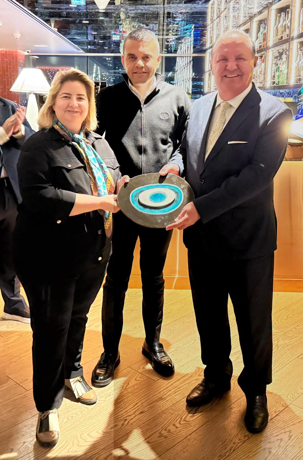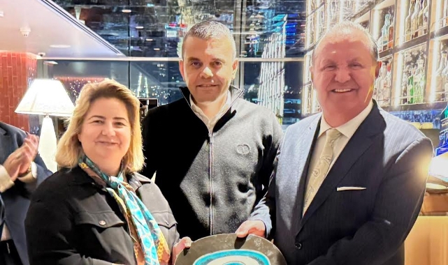 ESİAD Yönetim Kurulu Başkanı Sibel Zorlu, geceye katkıları nedeniyle Swissôtel Büyük Efes, İzmir Genel Müdürü Rıza Elibol’a nazar boncuğu hediye etti.