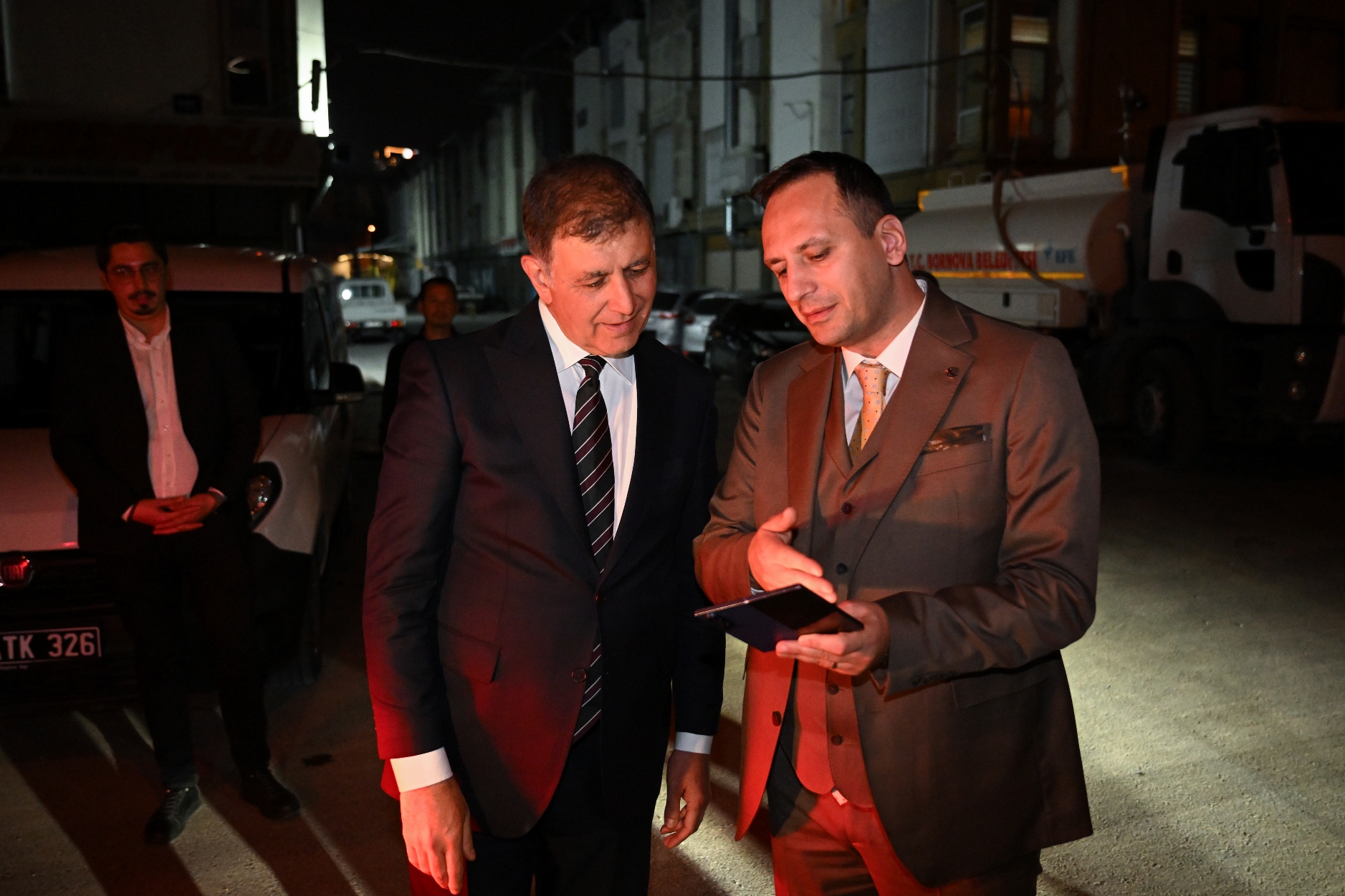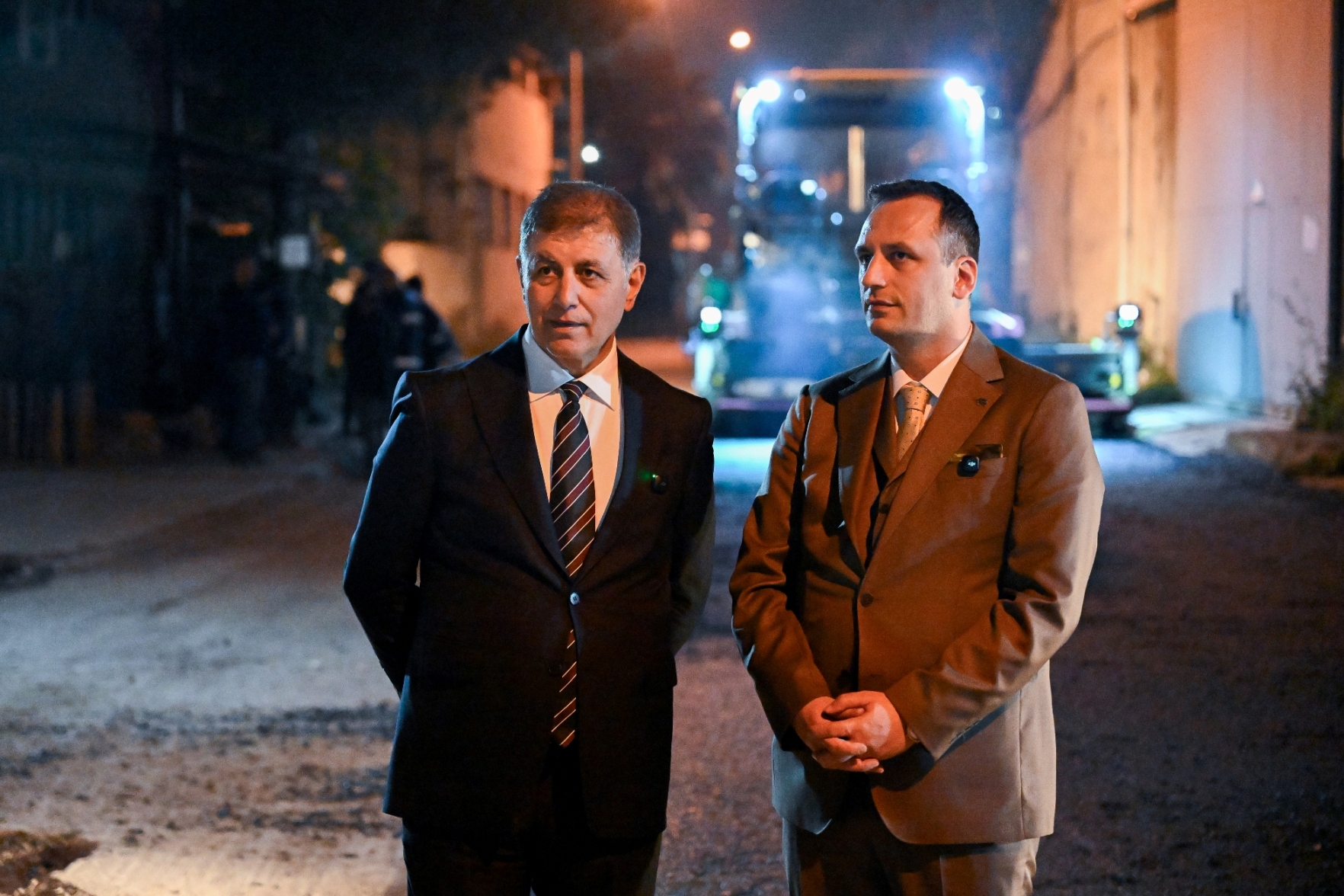 EGEMENLİK - Bornova Belediyesi’nin Tuna Mahallesi Sanat Caddesi’nde yürüttüğü gece asfalt yenileme çalışmalarını, Başkan Ömer Eşki ve İzmir Büyükşehir Belediye Başkanı Cemil Tugay yerinde inceledi. İki başkan, çalışanlarla sohbet edip baklava ikram etti.