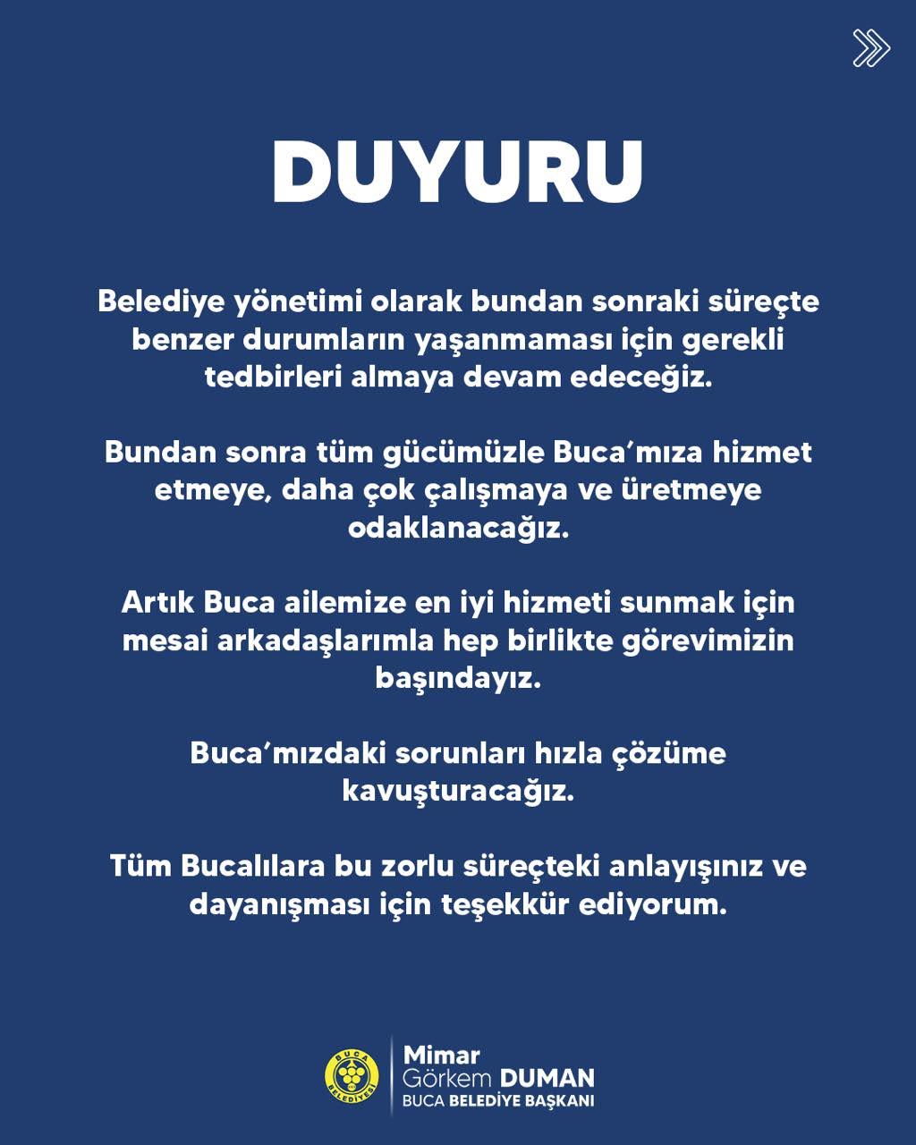 Belediye yönetimi olarak bundan sonraki süreçte benzer durumların yaşanmaması için gerekli tedbirleri almaya devam edeceğiz. Bundan sonra tüm gücümüzle Buca’mıza hizmet etmeye, daha çok çalışmaya ve üretmeye odaklanacağız. Artık Buca ailemize en iyi hizmeti sunmak için mesai arkadaşlarımla hep birlikte görevimizin başındayız. Buca’mızdaki sorunları hızla çözüme kavuşturacağız. Tüm Bucalılara bu zorlu süreçteki anlayışınız ve dayanışması için teşekkür ediyorum.”