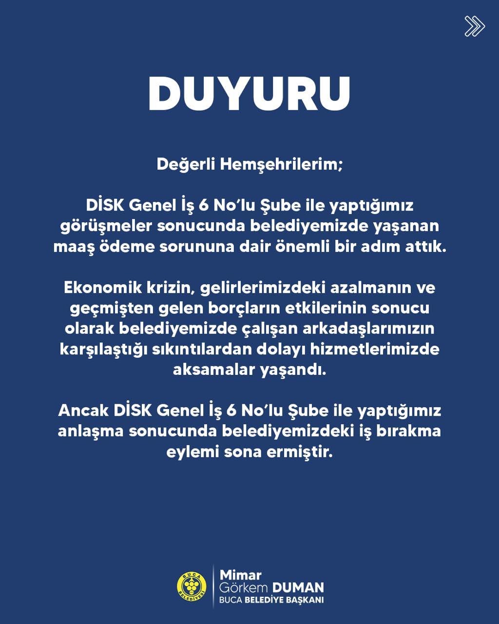“DİSK Genel İş 6 No’lu Şube ile yaptığımız görüşmeler sonucunda belediyemizde yaşanan maaş ödeme sorununa dair önemli bir adım attık.
