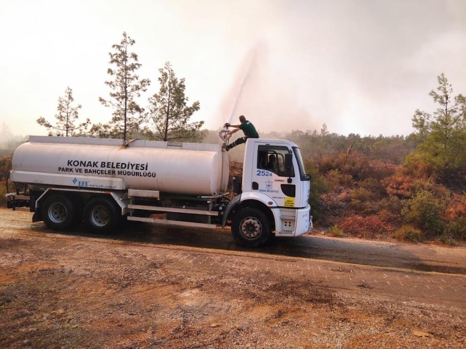 Konak Belediye Başkanı Abdül Batur, Bodrum Belediyesi’nden gelen talep üzerine belediyeye ait su tankeri ve arazide kullanılabilecek araçları yangın bölgesine gönderdi.