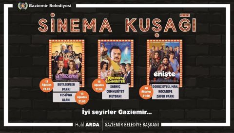 Gaziemir Belediyesi, ağustos ayında düzenleyeceği Sinema Günleri kapsamında yurttaşları açık havada sinemayla buluşturacak. Farklı mahallelerde düzenlenecek Sinema Günleri’nde, Türk sinemasının önemli filmlerinin gösterimi yapılacak. Sinema Günleri, 6 Ağustos Cuma günü, İzmir Büyükşehir Belediyesi’nin desteğiyle gösterimi yapılacak Troy’un Gizli Hazineleri filmiyle başlayacak. Aile Arasında isimli film 14 Ağustos Cumartesi günü Beyazevler Mahallesi’ndeki Beyazevler Parkı’nda ve 14 Ağustos Cuma günü Festival Alanı’nda izleyiciyle buluşturulacak. Sarnıç Cumhuriyet Meydanı’nda 18 Ağustos Çarşamba günü Kolonya Cumhuriyeti filminin gösterimi yapılacak. Aykut Enişte filmi de Dokuz Eylül Mahallesi’ndeki Kocatepe Zafer Parkı’nda 20 Ağustos Cuma günü sinemaseverlerin beğenisine sunulacak. Açık havada düzenlenecek film gösterimleri saat 21.00’de başlayacak.