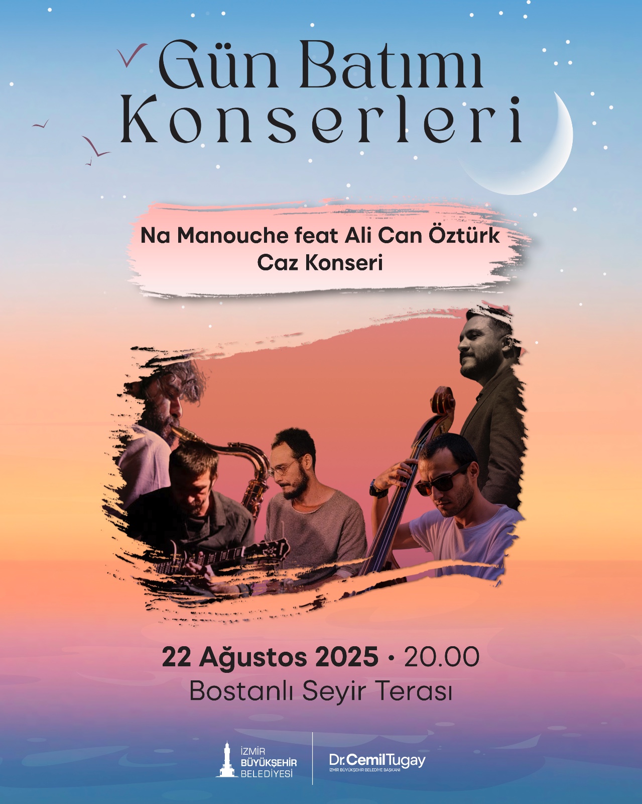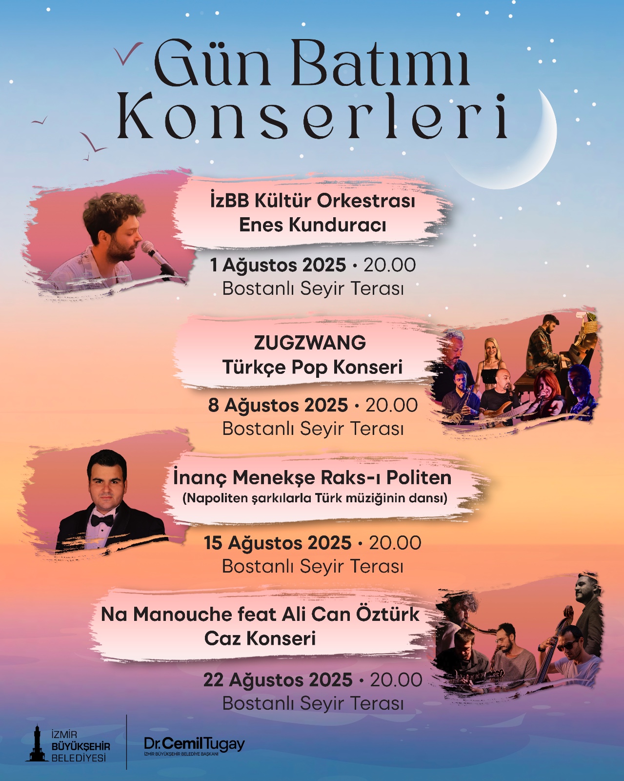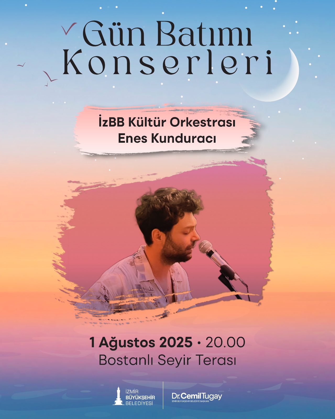 İzmir Büyükşehir Belediyesi’nin gelenek haline gelen Gün Batımı konserleri, ağustos ayında da devam ediyor. İzmir Büyükşehir Belediyesi Kültür Orkestrası’nın başarılı sanatçısı Enes Kunduracı ile Bostanlı Seyir Terası’nda başlayacak ağustos ayı konserleri, hem pop müziğin hem de cazın ritmini şehre taşıyarak yaz akşamlarına renk katacak.