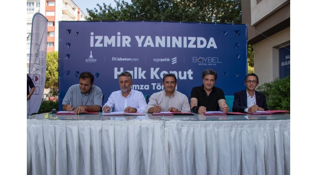 Bayraklı Manavkuyu Mahallesi’ndeki Halk Konut Bilgilendirme Ofisi’ndeki imza törenine Bayraklı Belediye Başkanı Serdar Sandal, İZBETON A.Ş. Genel Müdürü Heval Savaş Kaya, Egeşehir A.Ş. Yönetim Kurulu Başkanı Ali Onat Çetin ve Genel Müdürü Ekrem Tükenmez, BAYBEL Yönetim Kurulu Başkanı Berk Ulusal, İzmir Depremzedeleri Dayanışma Derneği (İZDEDA) Başkanı Haydar Özkan ve Halk Konut 2 Kooperatifi Başkanı Cüneyt Yılmaz ile depremzedeler katıldı.