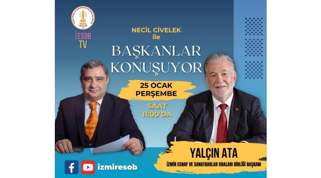 25 Ocak 2024 Perşembe günü ‘Başkanlar Konuşuyor’ programı ile yayına başlayacak olan İESOB TV, esnaf sanatkarların ve teşkilatının görüşlerini, beklentilerini, sorunlarını kamuoyuna duyurmayı hedefliyor. İESOB TV’nin ilk programının konuğu da İESOB Başkanı Yalçın Ata olacak.