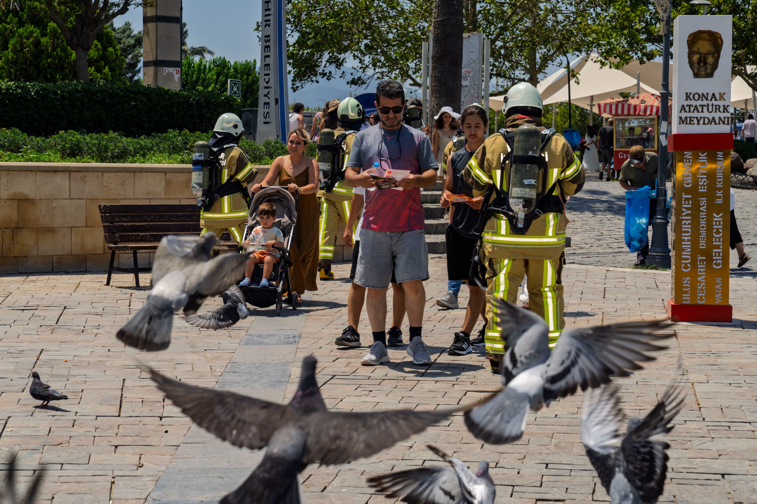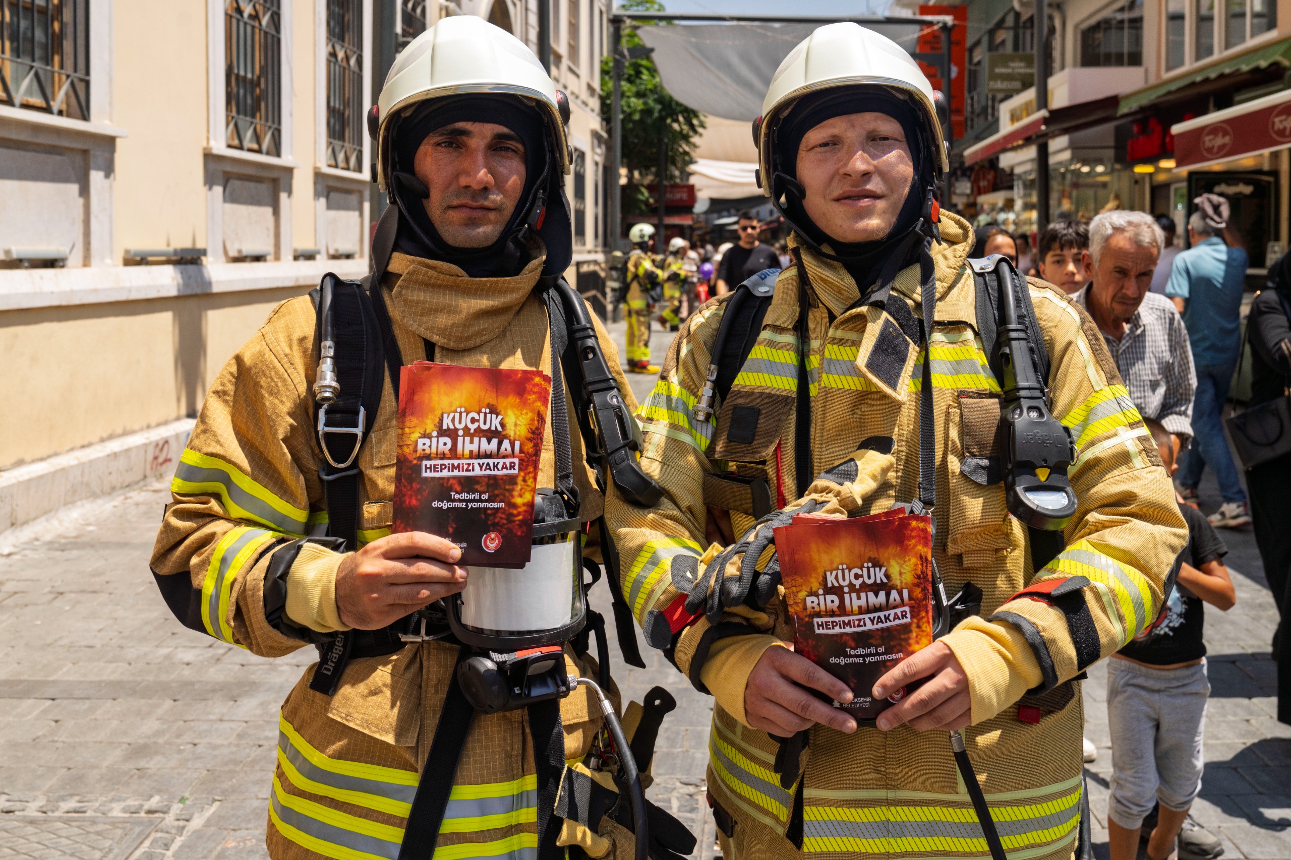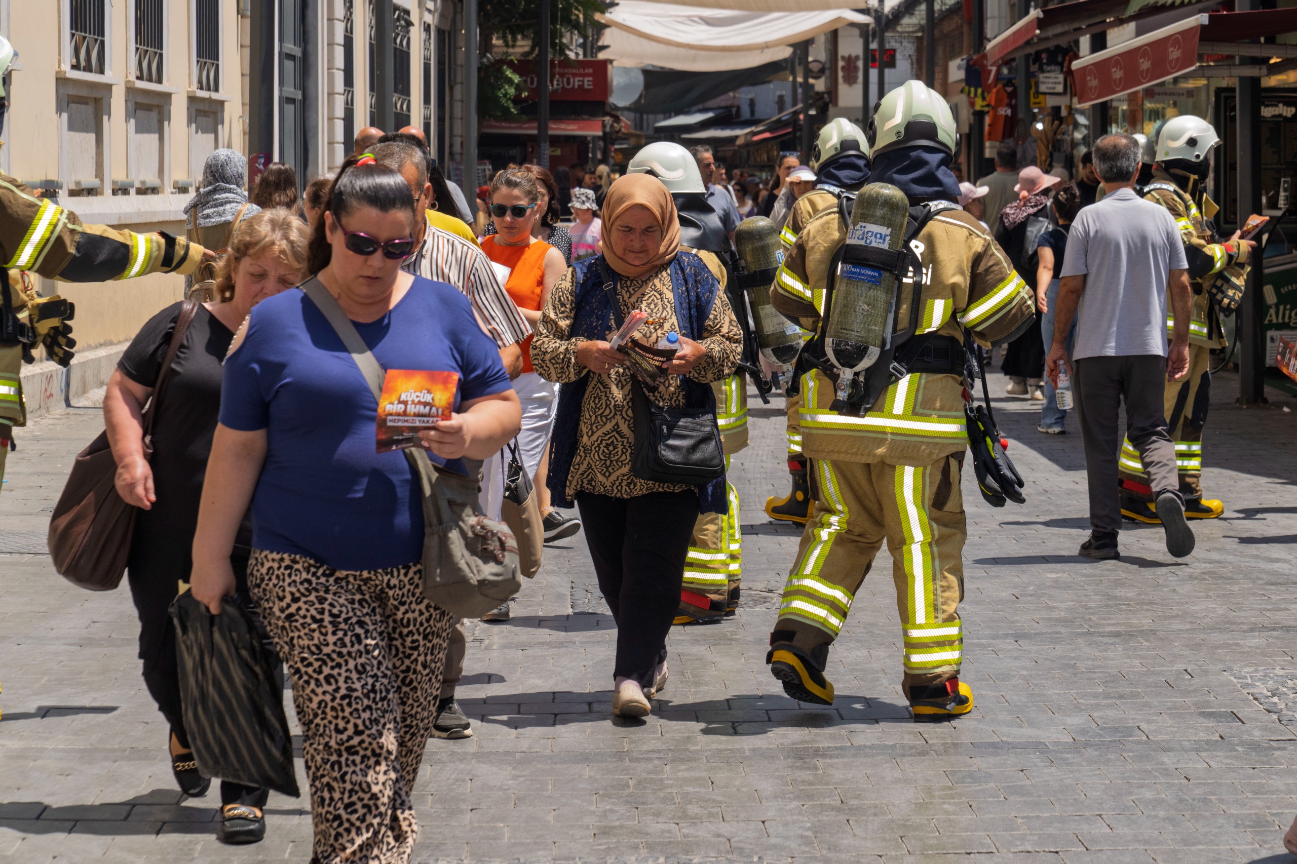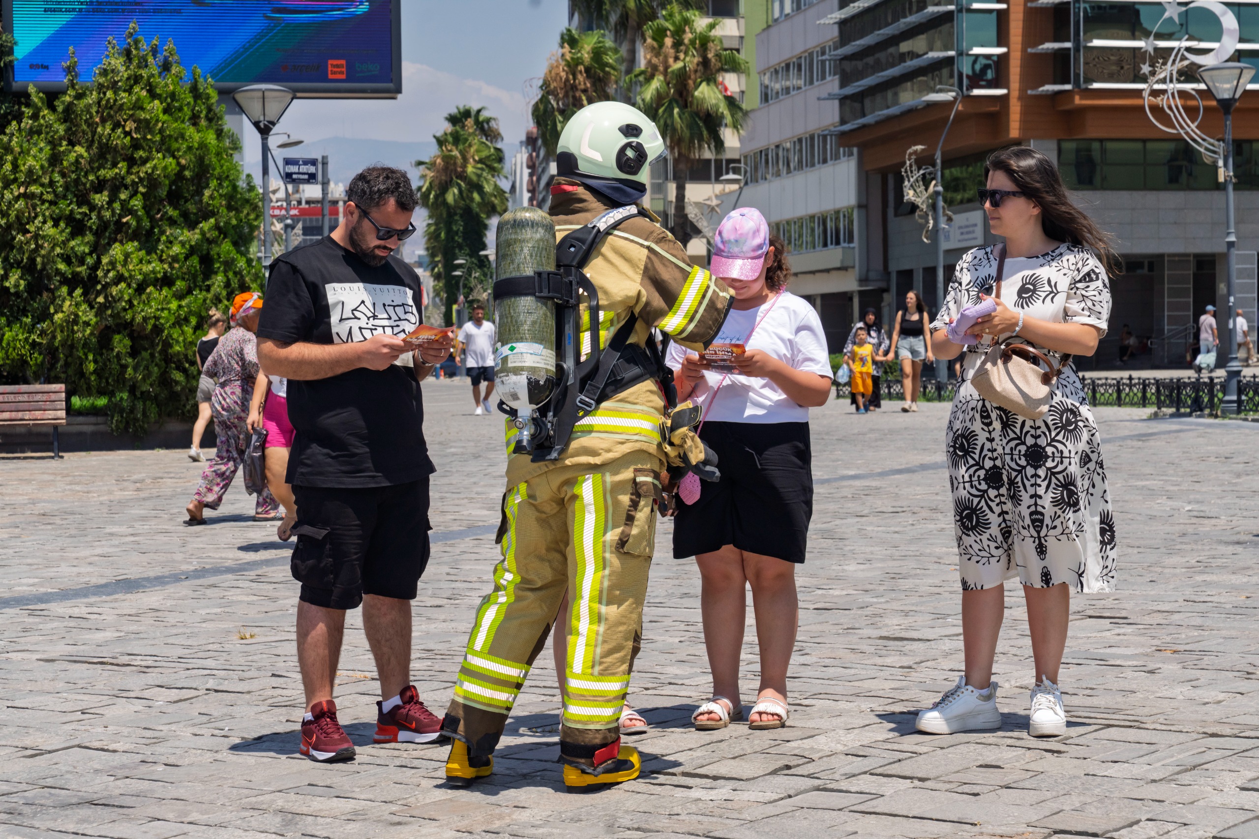 EGEMENLİK - İzmir Büyükşehir Belediyesi İtfaiye Dairesi Başkanlığı, çoğu küçük ihmaller sonucu başlayan ve geride yıkıcı bir etki bırakan orman yangınlarına karşı ilginç bir farkındalık etkinliği düzenledi. Yangınlara müdahale ederken kullandıkları ısıya ve aleve karşı koruyan özel kıyafet giyen, baret ve temiz hava solunum cihazı takan itfaiye personeli, Konak Atatürk Meydanı ile Kemeraltı Çarşısı’nda broşür dağıtarak yurttaşları bu konuda dikkatli olmaya çağırdı. 40 dereceye yaklaşan sıcak havada koruyucu kıyafetle dolaşan itfaiye personelini gören vatandaşlar şaşkınlığını gizleyemedi.