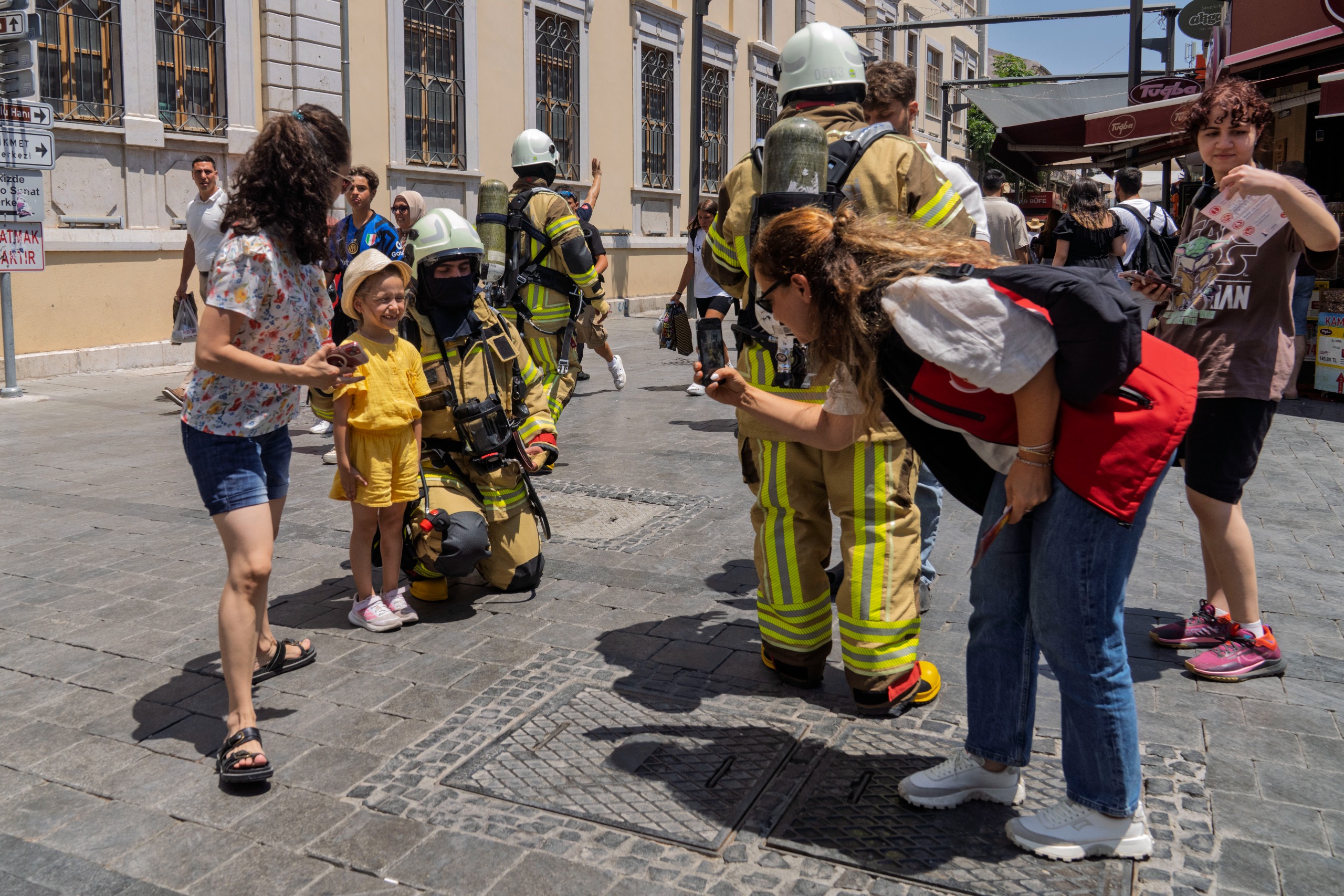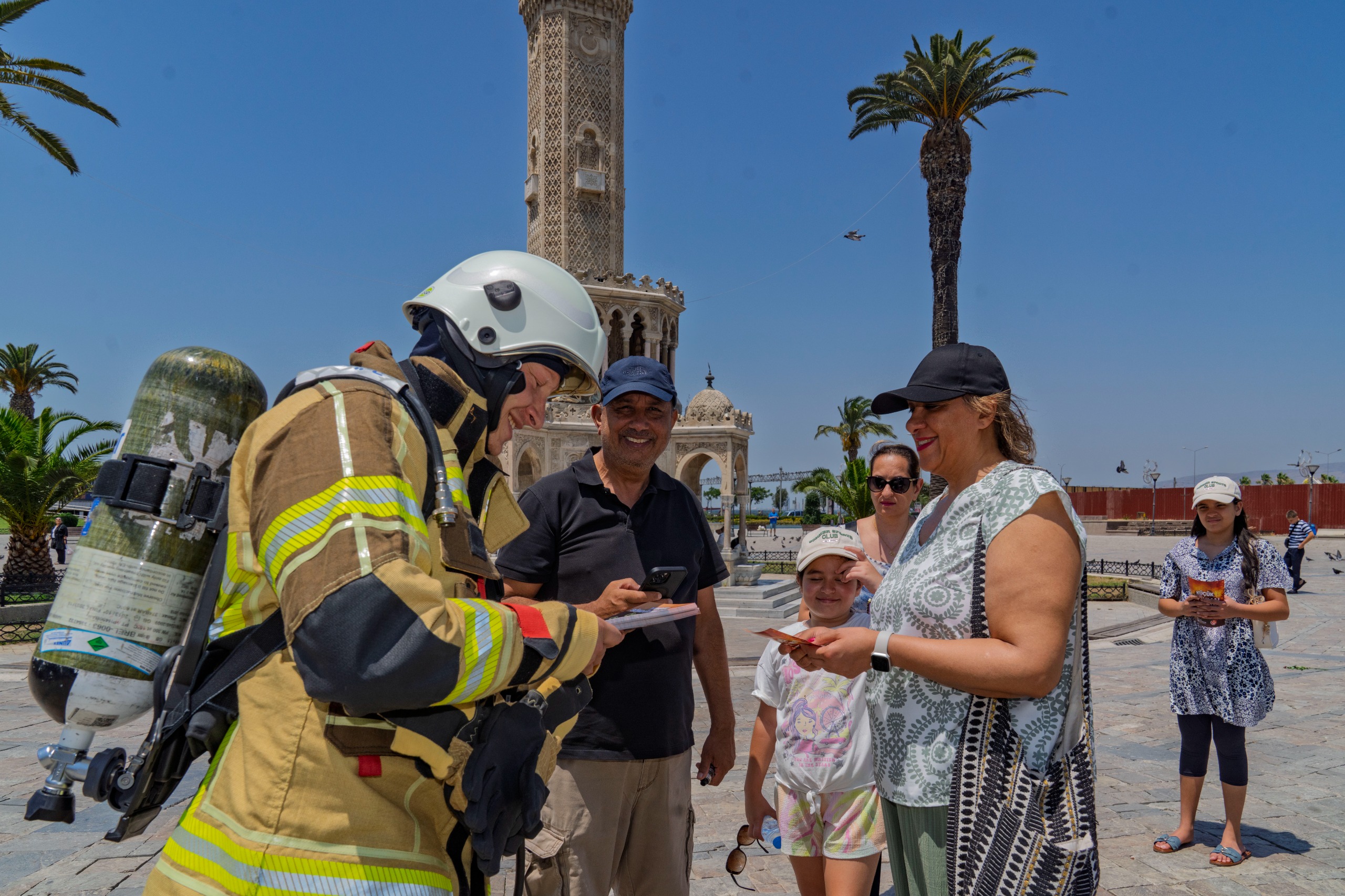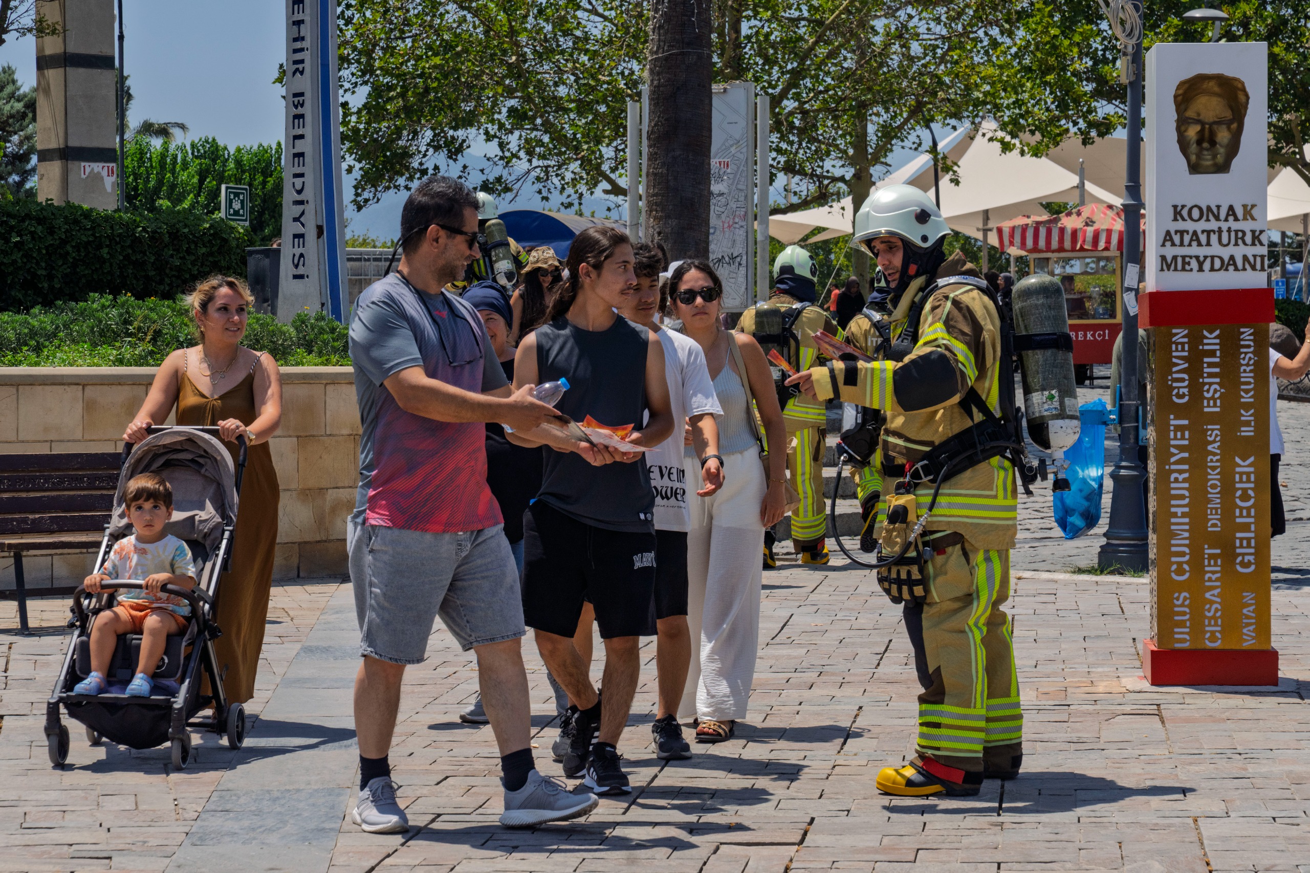 İzmir Büyükşehir Belediyesi, küresel iklim krizi ve değişen yağış rejimi nedeniyle sıcaklıkların mevsim normallerinin üzerinde olduğu İzmir’de, orman yangınlarına karşı farkındalık oluşturmak için ilginç bir etkinlik düzenledi. İtfaiye personeli ağırlığı 10 kilogramın üzerindeki kişisel koruyucu kıyafetleri ile Konak’ta yurttaşlara eğitici broşür dağıttı. Ekipler özellikle sıcak havalarda, felakete dönüşen yangınların çıkmaması için herkesin duyarlı olmasını istedi.