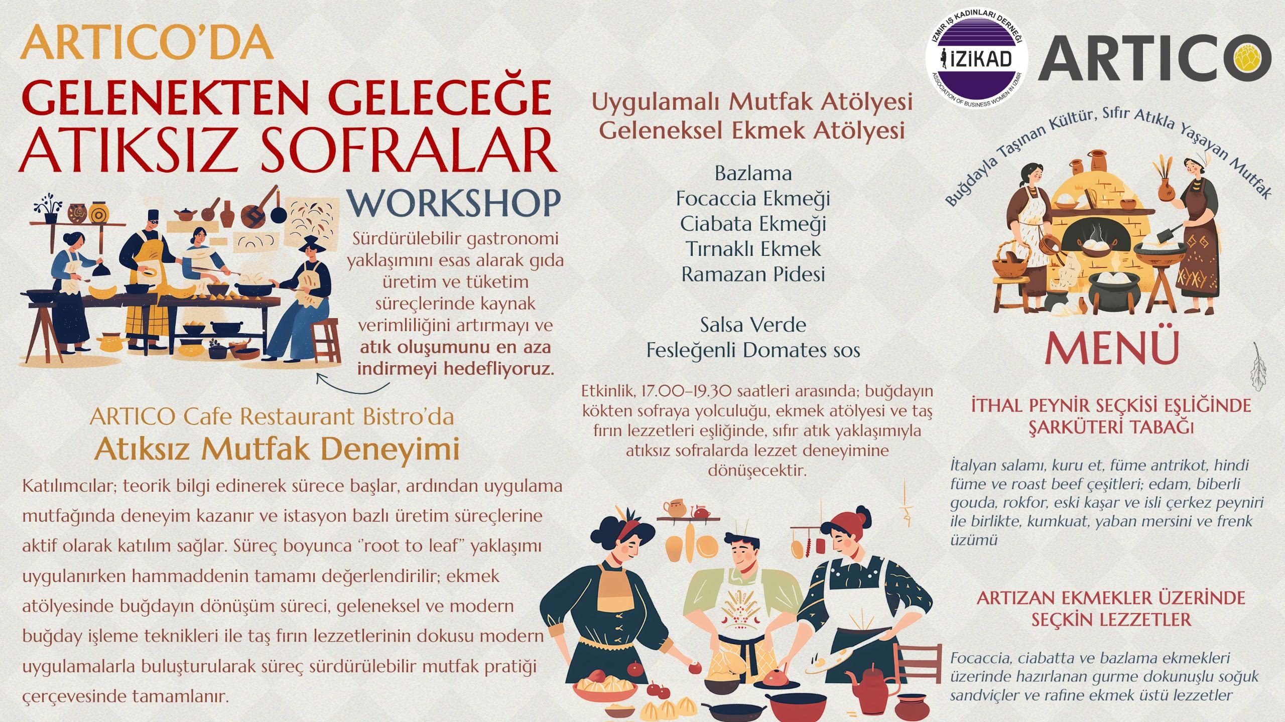 EGEMENLİK - İzmir İş Kadınları Derneği (İZİKAD), toplumsal ve ekoloji temelli sürdürülebilirlik hedefleri doğrultusunda yürüttüğü çalışmalarına bir yenisini daha ekledi. Enginar Catering desteği ile ARTICO Restoran’da hayata geçirilen Gelenekten Geleceğe Atıksız Sofralar Workshop etkinliğinde, gastronomi dünyasında giderek önem kazanan sıfır atık yaklaşımı ele alındı. Sürdürülebilir gastronomi yaklaşımıyla kurgulanan atölyede, geleneksel üretim tekniklerinin modern mutfak disiplinleriyle nasıl harmanlanabileceği teorik ve uygulamalı olarak aktarıldı. Katılımcıların üretim süreçlerine dahil olduğu etkinlikte, geleneksel ekmek atölyesi de yapıldı.