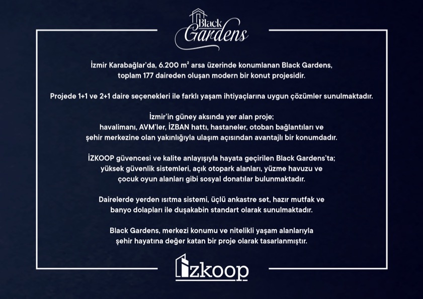 EGEMENLİK - Kooperatif modeliyle hayata geçirdiği projelerle dikkat çeken İZKOOP, yeni konut projesi Black Gardens’ı kamuoyuna tanıttı. İzmir’in Karabağlar ilçesinde konumlanan proje, modern mimarisi ve merkezi lokasyonuyla öne çıkıyor.6.200 metrekarelik arsa üzerinde inşa edilen Black Gardens, toplam 177 adet 1+1 ve 2+1 daireden oluşuyor. Proje, fonksiyonel daire planları ve çağdaş yaşam ihtiyaçlarına uygun tasarımıyla kent yaşamına yeni bir alternatif sunmayı hedefliyor.İzmir’in güney aksında yer alan proje; Adnan Menderes Havalimanı, alışveriş merkezleri, İZBAN hattı, hastaneler, otoban bağlantıları ve şehir merkezine yakınlığı sayesinde ulaşım açısından avantajlı bir konumda bulunuyor.İZKOOP güvencesiyle hayata geçirilen Black Gardens’ta; yüksek güvenlik sistemleri, açık otopark alanları, yüzme havuzu ve çocuk oyun alanları gibi sosyal donatılar yer alıyor. Dairelerde ise yerden ısıtma sistemi, üçlü ankastre set, hazır mutfak ve banyo dolapları ile duşakabin standart olarak sunuluyor.Merkezi konumu ve sunduğu yaşam olanaklarıyla dikkat çeken Black Gardens, İzmir’de nitelikli konut arayışına cevap vermeyi amaçlayan projeler arasında yerini aldı.