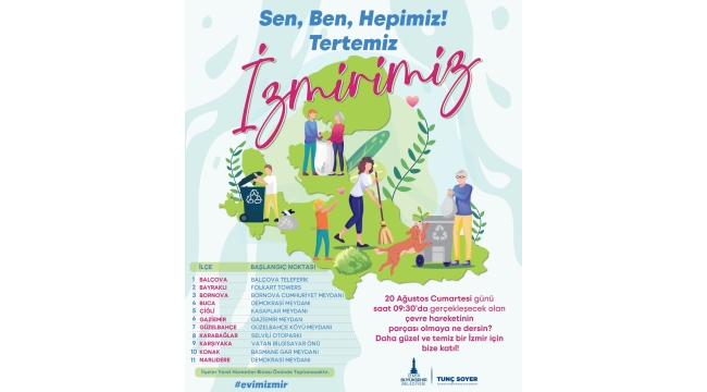 Yetki ve sorumluluğu altındaki ana arter ve bulvarlarda temizlik hizmeti sunan İzmir Büyükşehir Belediyesi, kentte kirliliği önlemenin en kalıcı yönteminin kirletmemek olduğunu ve kamusal alanların temizliğine özen gösterilmesi gerektiğini hatırlatmak amacıyla toplu temizlik hareketi başlatıyor. Büyükşehir Belediyesi “Sen, Ben, Hepimiz! Tertemiz İzmirimiz” diyerek 20 Ağustos 2022 Cumartesi 09.30'da 30 ilçede sivil toplum kuruluşlarının üyeleri ve kamu kurumlarındaki çalışanlar da dahil olmak üzere İzmirlileri eşzamanlı temizlik hareketine çağırıyor.