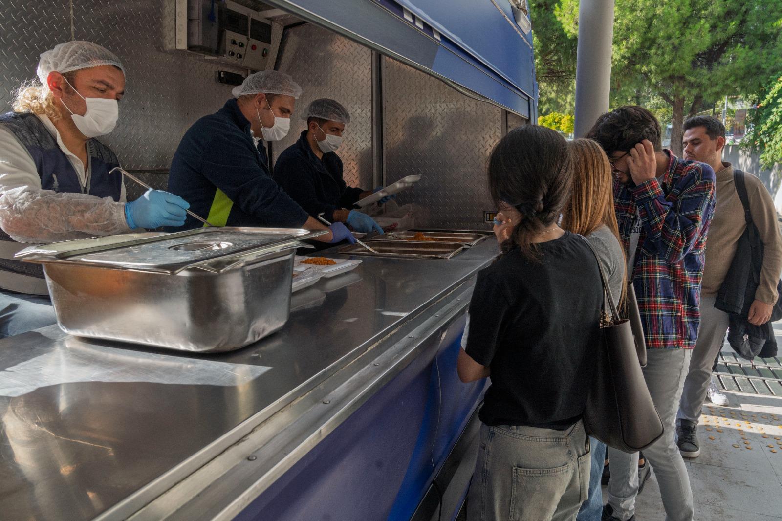 EGEMENLİK - İzmir Büyükşehir Belediyesi artan enflasyon nedeniyle başta yeme-içme olmak üzere günlük ihtiyaçlarını karşılarken bile zorlanan üniversite öğrencilere desteğe devam ediyor. İzmir Büyükşehir Belediyesi hem kentte ikamet eden hem de başka şehirlerden gelerek ailelerinden uzakta yaşayan öğrenciler için Ege Üniversitesi içi metro durağı, Katip Çelebi Üniversitesi içi kız yurdu yakını, Bakırçay Üniversitesi içi, Demokrasi Üniversitesi önü, Dokuz Eylül Üniversitesi Tarık Akan Gençlik Merkezi önü ve İzmir Yüksek Teknoloji Enstitüsü (İYTE) içindeki kütüphane önünde oluşturulan noktalarda her gün 16.00-18.00 saatleri arasında ücretsiz olarak ortalama 4 bin kişilik yemek dağıtıyor.