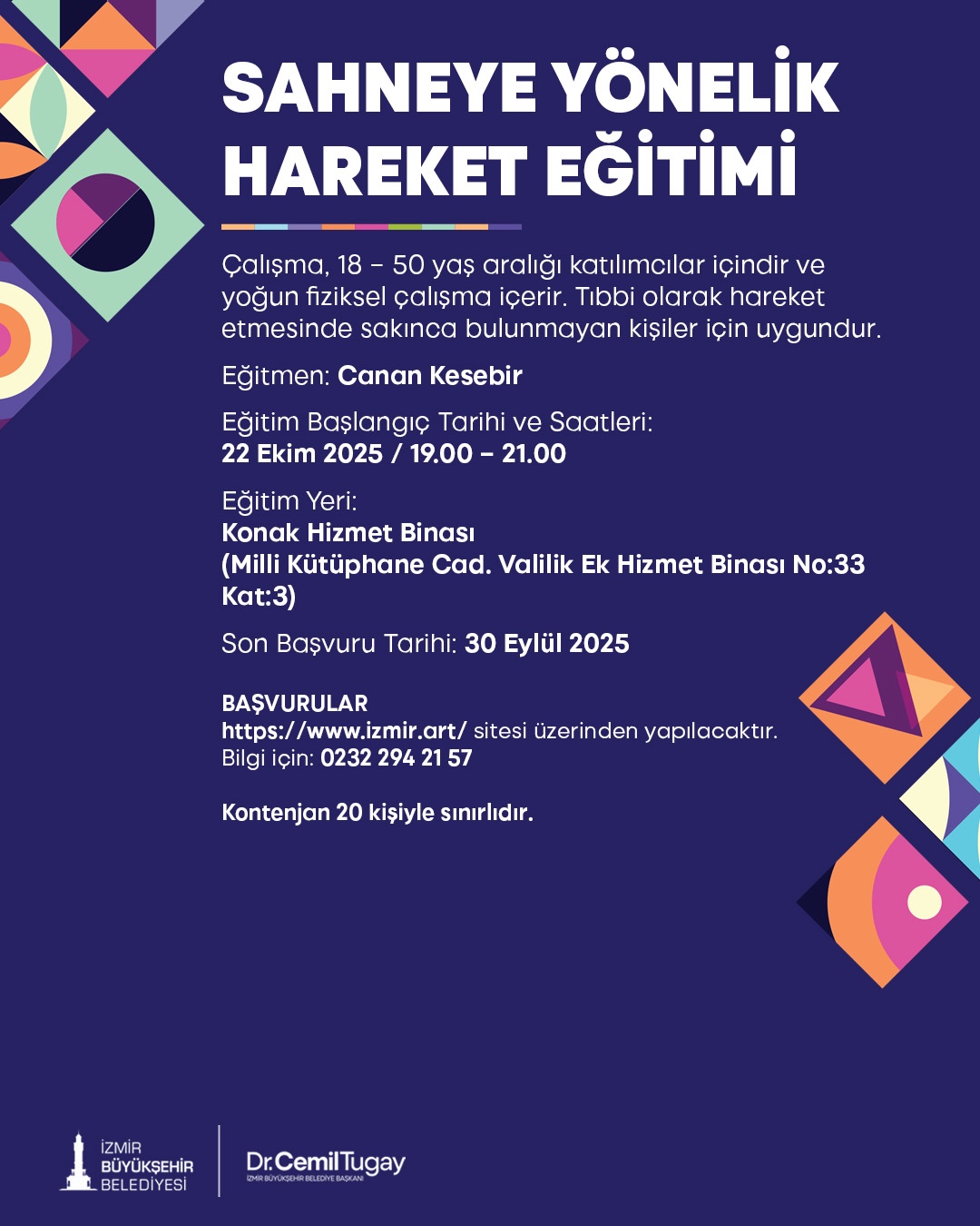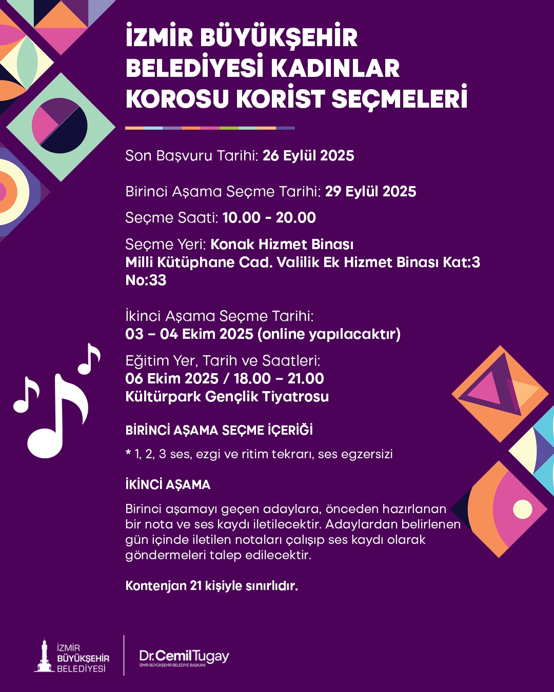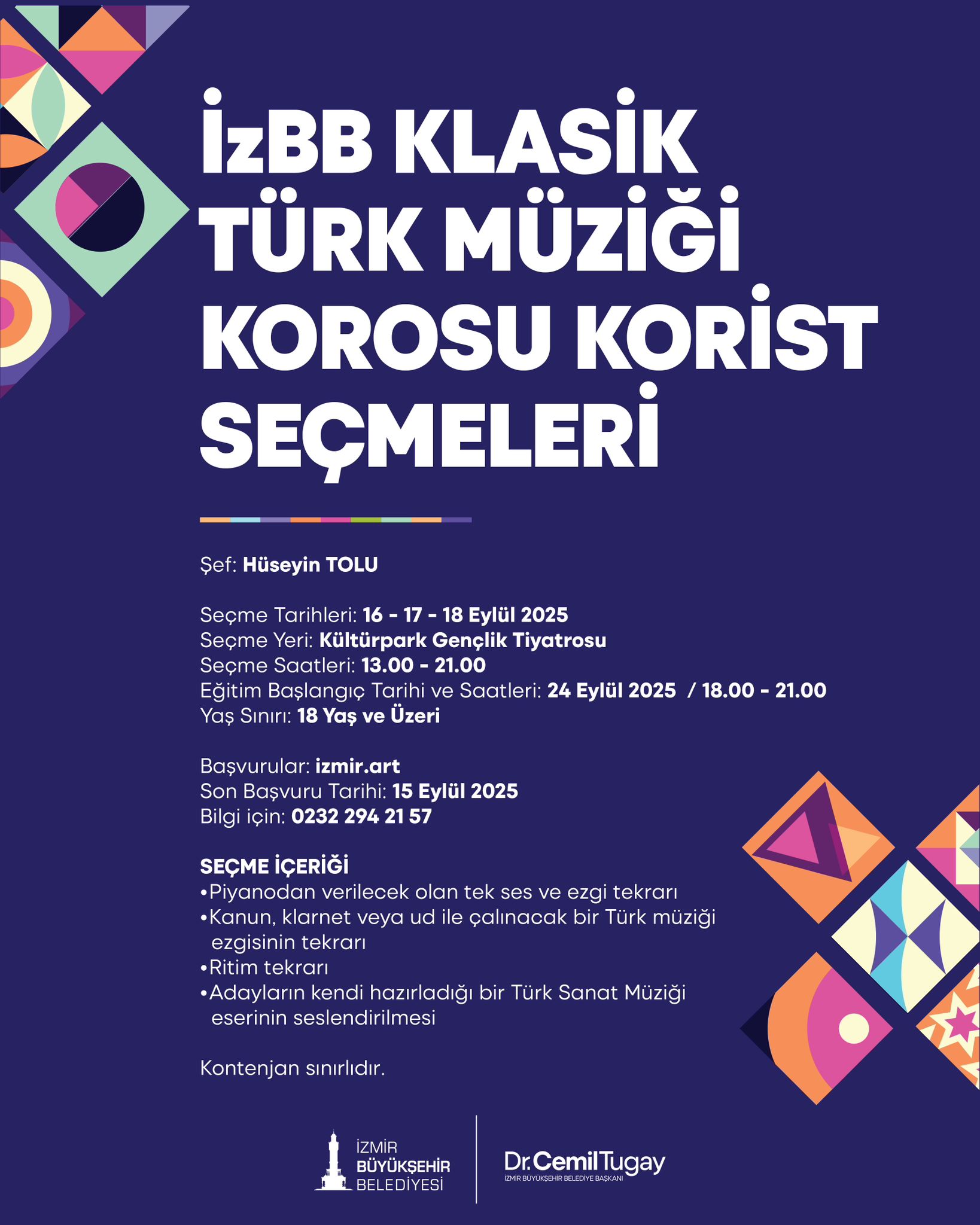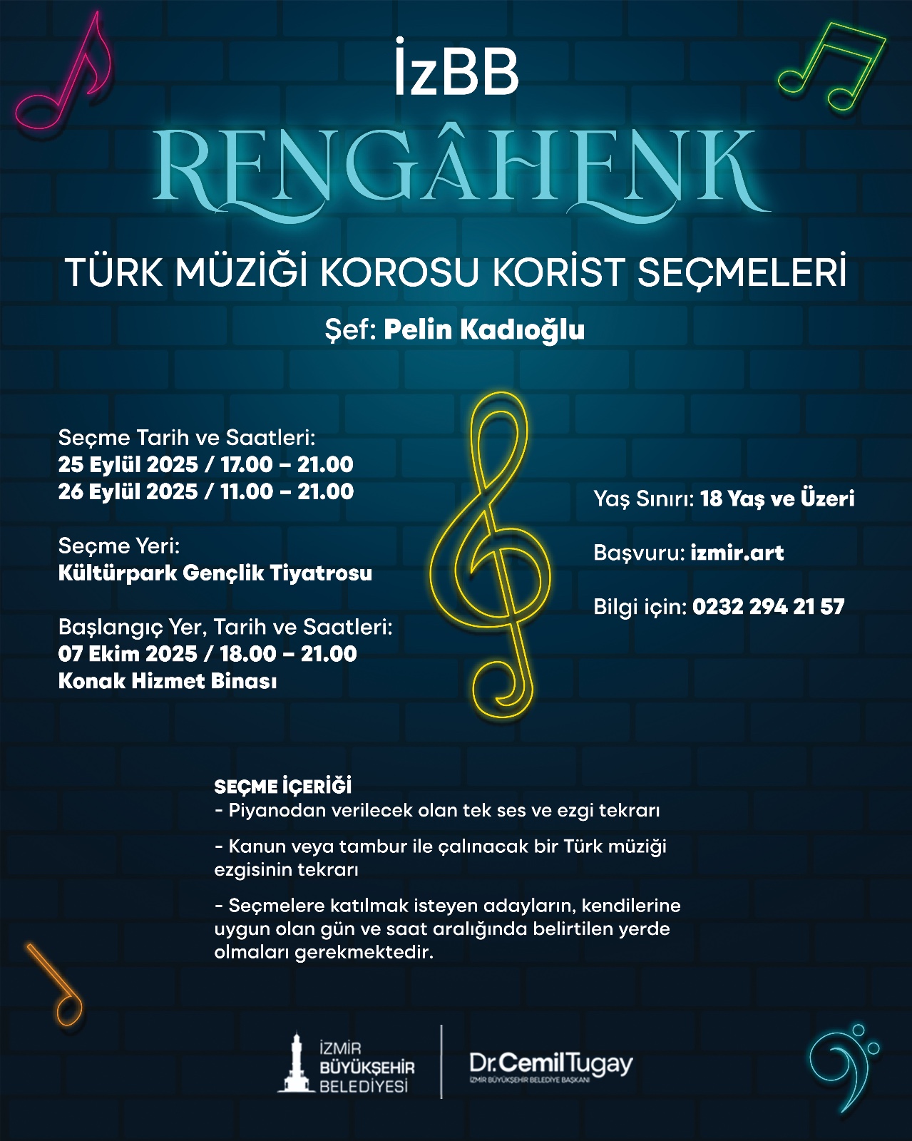 İzmir Büyükşehir Belediyesi, 2025-2026 sanat eğitimi dönemini başlatıyor. Dans, müzik, oyunculuk gibi eğitimlerin yanı sıra koro çalışmaları için de eğitim ve seçme tarihleri ile başvuru koşulları belli oldu.