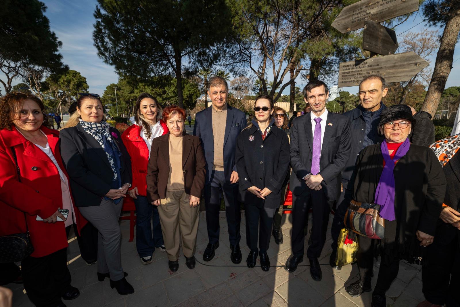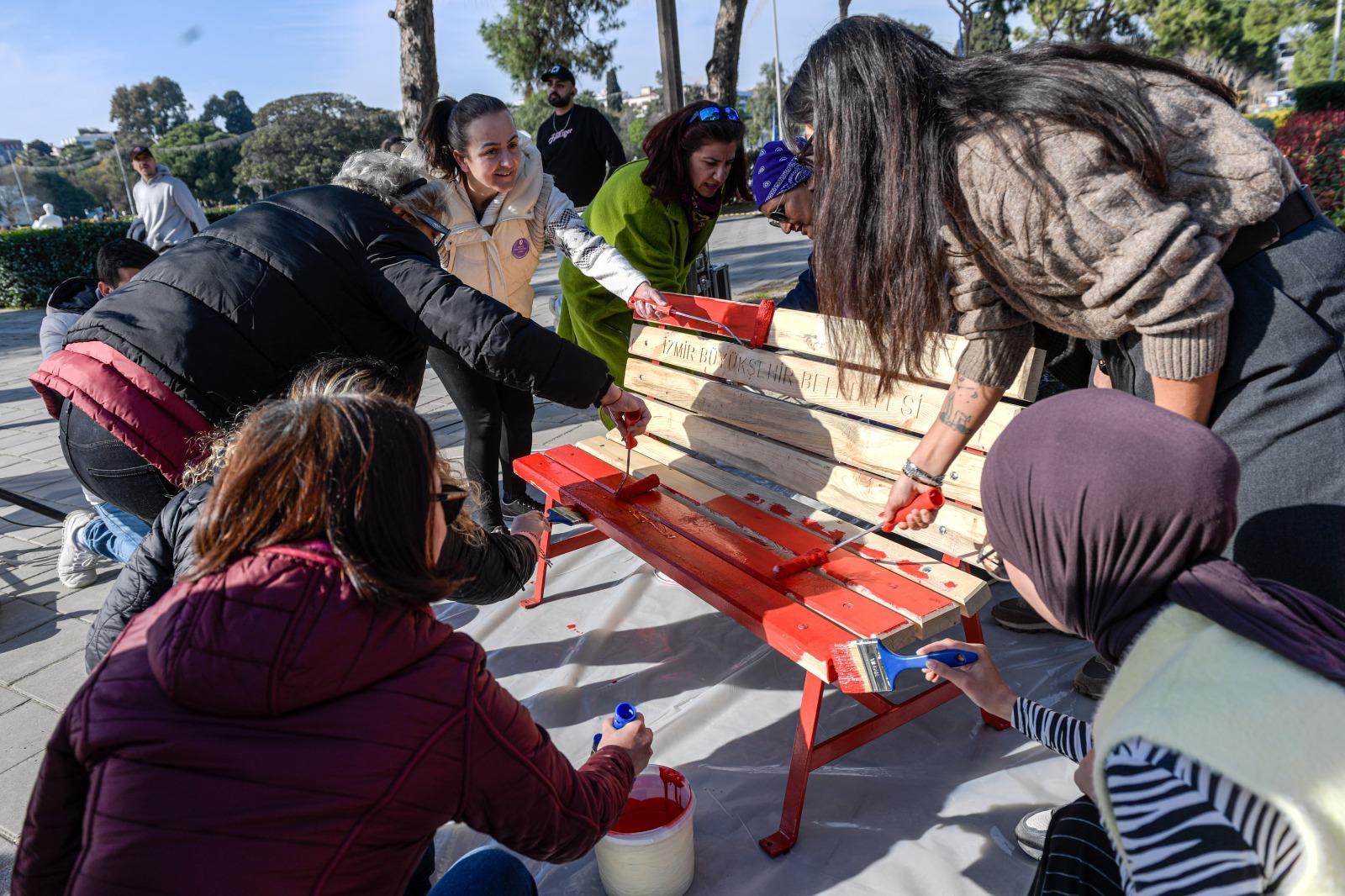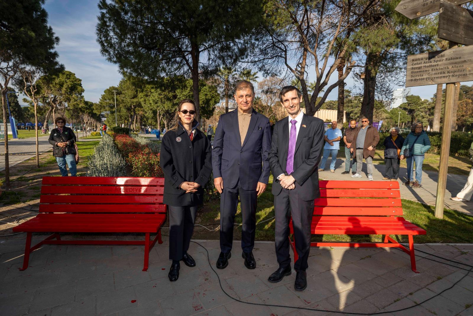 Banklar kırmızıya boyandıKonuşmaların ardından Başkan Tugay, eşi Öznur Tugay ve Daniele Bianchi bankı kırmızıya boyadı. Etkinlikte İzmirli kadınlar da farkındalık çalışmasına katılarak kadına yönelik şiddete karşı mesaj verdi. Başkan Tugay ve eşi Öznur Tugay, programın sonunda kadınlarla sohbet ederek hatıra fotoğrafı çektirdi. Alana yerleştirilen iki kırmızı bankın yanında ayrıca bir QR kod bulunuyor. Koda tıklandığında, “Kırmızı bank, cinayete kurban giden bir kadının toplumda bıraktığı boşluğun sembolüdür. Kadınlara yönelik şiddete hayır. İzmir İtalya Konsolosluğu ve İzmir Büyükşehir Belediyesi iş birliğiyle, 8 Mart Dünya Kadınlar Günü anısına kadınlar tarafından boyanmıştır” mesajı yer alıyor.