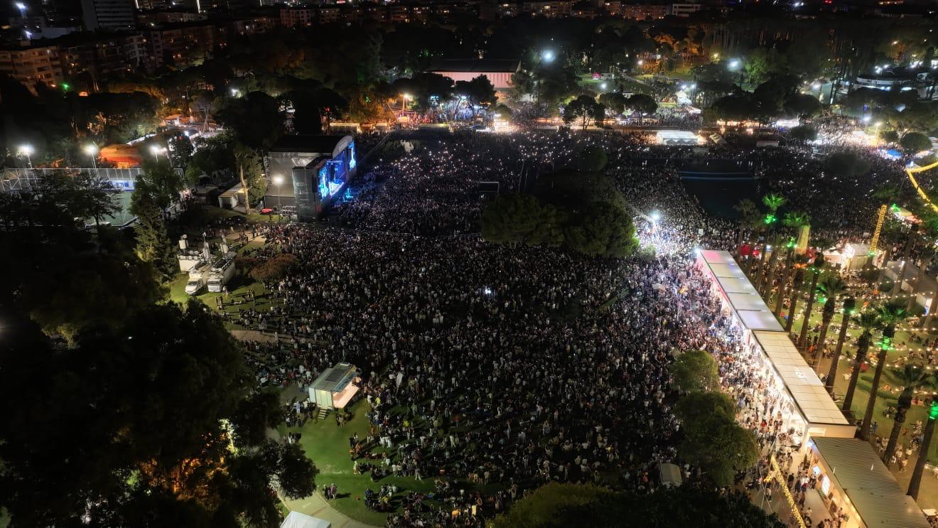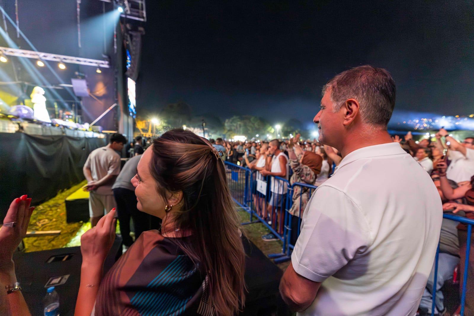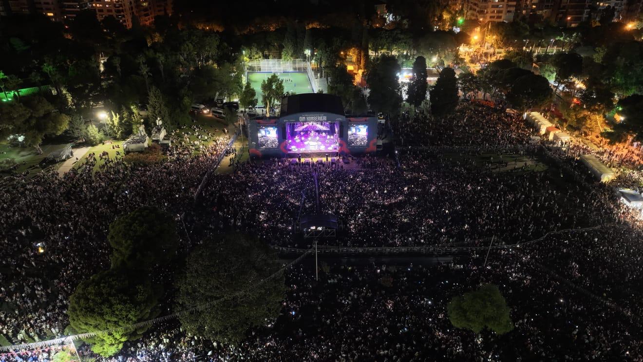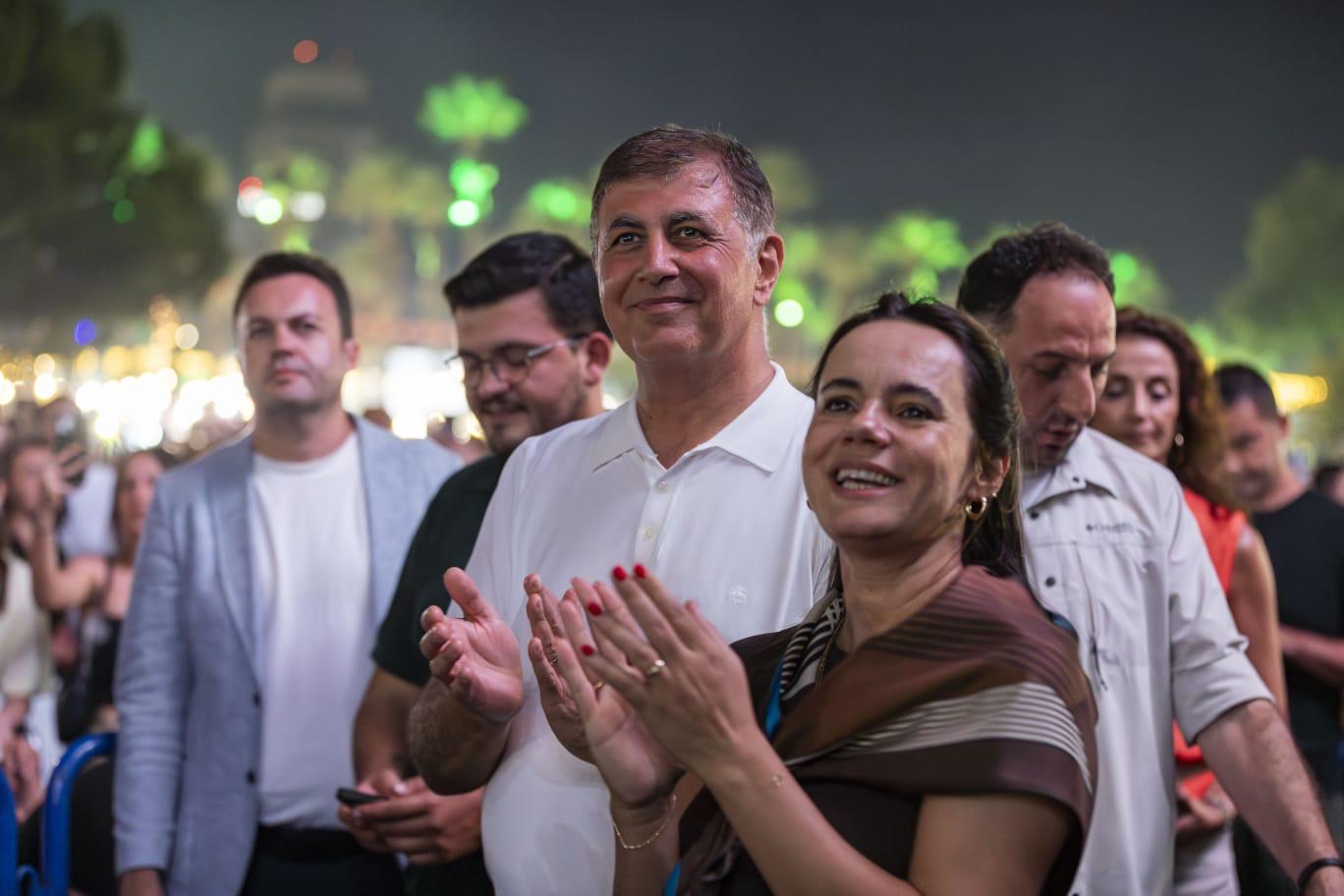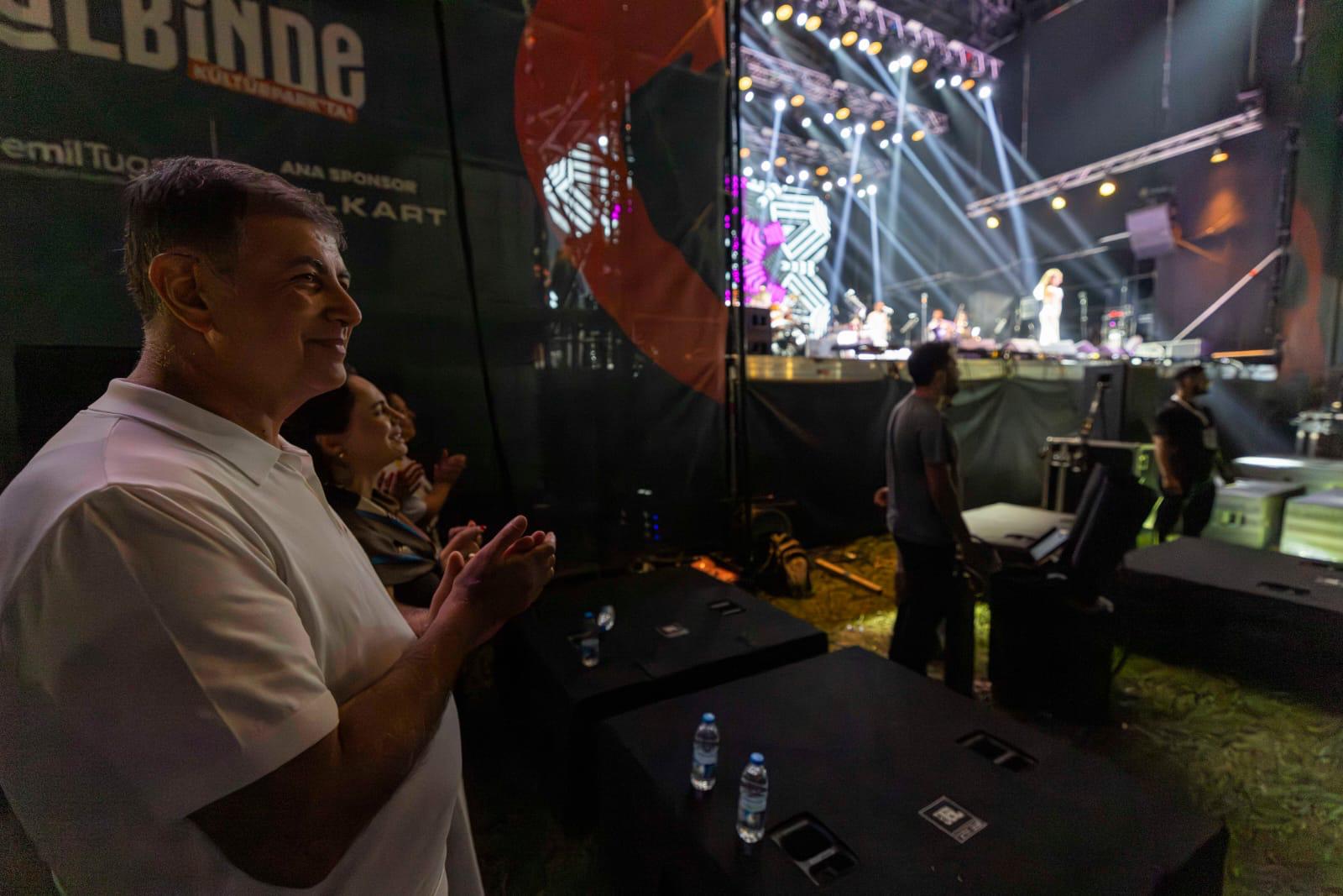 EGEMENLİK - İzmir Büyükşehir Belediye Başkanı Dr. Cemil Tugay, eşi Öznur Tugay ile 94’üncü İEF kapsamında, çim konserlerinde sahne alan ünlü sanatçı Yıldız Tilbe’yi dinledi. Binlerce İzmirlinin akın ettiği fuarda konsere de büyük ilgi vardı. Tugay çifti Yıldız Tilbe’nin sevilen şarkılarına eşlik etti. Konsere katılanlar da cep telefonları ile çekim yaparak o anları ölümsüzleştirdi. Yıldız Tilbe hayranları, dansıyla göz dolduran sanatçıya hep bir ağızdan eşik etti. Daha çok dans etmek istediğini ancak yaşlandığını söyleyen Tilbe, “Ne güzel görünüyorsunuz. Maşallah size. Ben nasıl görünüyorum? Güzel görünüyor muyum? Hepinize çok teşekkür ediyorum. Canım İzmir. İzmir’i çok seviyorum. Aslan memleketim. Gönlümün yâri İzmir” dedi. Dillerden düşmeyen parçalarını İzmirliler için seslendiren Tilbe’nin konseri unutulmaz anlar yaşattı.