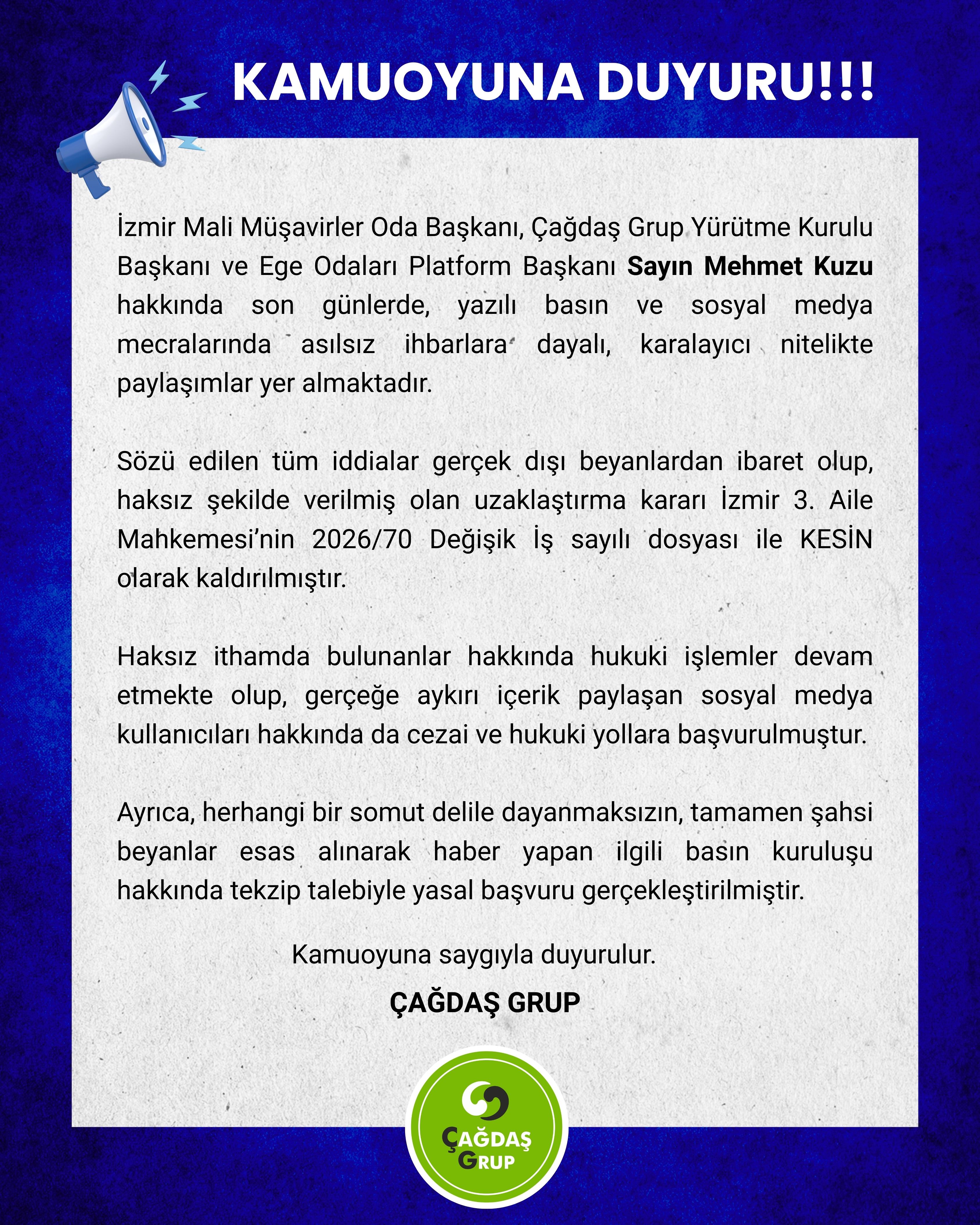 HABER: LEVENT HAMURCUOĞLUEGEMENLİK - Son günlerde İzmir Mali Müşavirler Odası Başkanı, Çağdaş Muhasebeci Mali Müşavirler Grup Yürütme Kurulu Başkanı ve Ege Odaları Platform Başkanı Sayın Mehmet Kuzu hakkında yazılı basın ve sosyal medya mecralarında yer alan asılsız iddialara dayalı, karalayıcı içerikli paylaşımlar dikkat çekmektedir. Bu tür iddialar, hem kişisel itibarı zedelemekte hem de kamuoyunu yanıltmaktadır.Gerçek Dışı İddialara CevapAsılsız ithamda bulunanlar hakkında hukuki işlemler başlatılmış olup, gerçeğe aykırı içerik paylaşan sosyal medya kullanıcıları hakkında da cezai ve hukuki yollara başvurulmuştur. Bu bağlamda, adaletin yerini bulması ve Sayın Mehmet Kuzu’nun itibarının korunması amacıyla gerekli tüm yasal adımlar atılmaktadır.Söz konusu iddiaların tamamı, gerçeğe dayanmayan ve sadece kötü niyetle kaleme alınmış beyanlardan ibarettir. Kamuoyunu aydınlatmak amacıyla belirtmek isteriz ki, İzmir 3. Aile Mahkemesi’nin 2026/70 Değişik İş sayılı dosyası ile haksız yere verilmiş olan uzaklaştırma kararı, KESİN olarak kaldırılmıştır. Bu durum, Sayın Mehmet Kuzu'nun hukuksal durumunu net bir şekilde ortaya koymaktadır.Hukuki Süreç BaşlatıldıAyrıca, herhangi bir somut delile dayanmaksızın, tamamen şahsi beyanlar esas alınarak haber yapan ilgili basın kuruluşları hakkında da tekzip talebiyle yasal başvuru gerçekleştirilmiştir. Bu tür etik dışı davranışların önüne geçmek ve doğru bilgilendirme yapılmasını sağlamak için medyayı duyarlı olmaya çağırıyoruz.Kamuoyuna DuyurulurSayın Mehmet Kuzu, İzmir mali müşavirler camiasında saygın bir yer edinmiş, meslektaşları ve kamuoyu nezdinde güvenilirliği ile tanınan bir kişiliktir. Yürütmekte olduğu görevler gereği sürekli olarak meslektaşlarının haklarını savunmakta ve sektörün gelişimi için çaba harcamaktadır.Kamuoyunun, bu tür asılsız ve karalayıcı iddialara itibar etmemesini önemle vurgulamak isteriz.