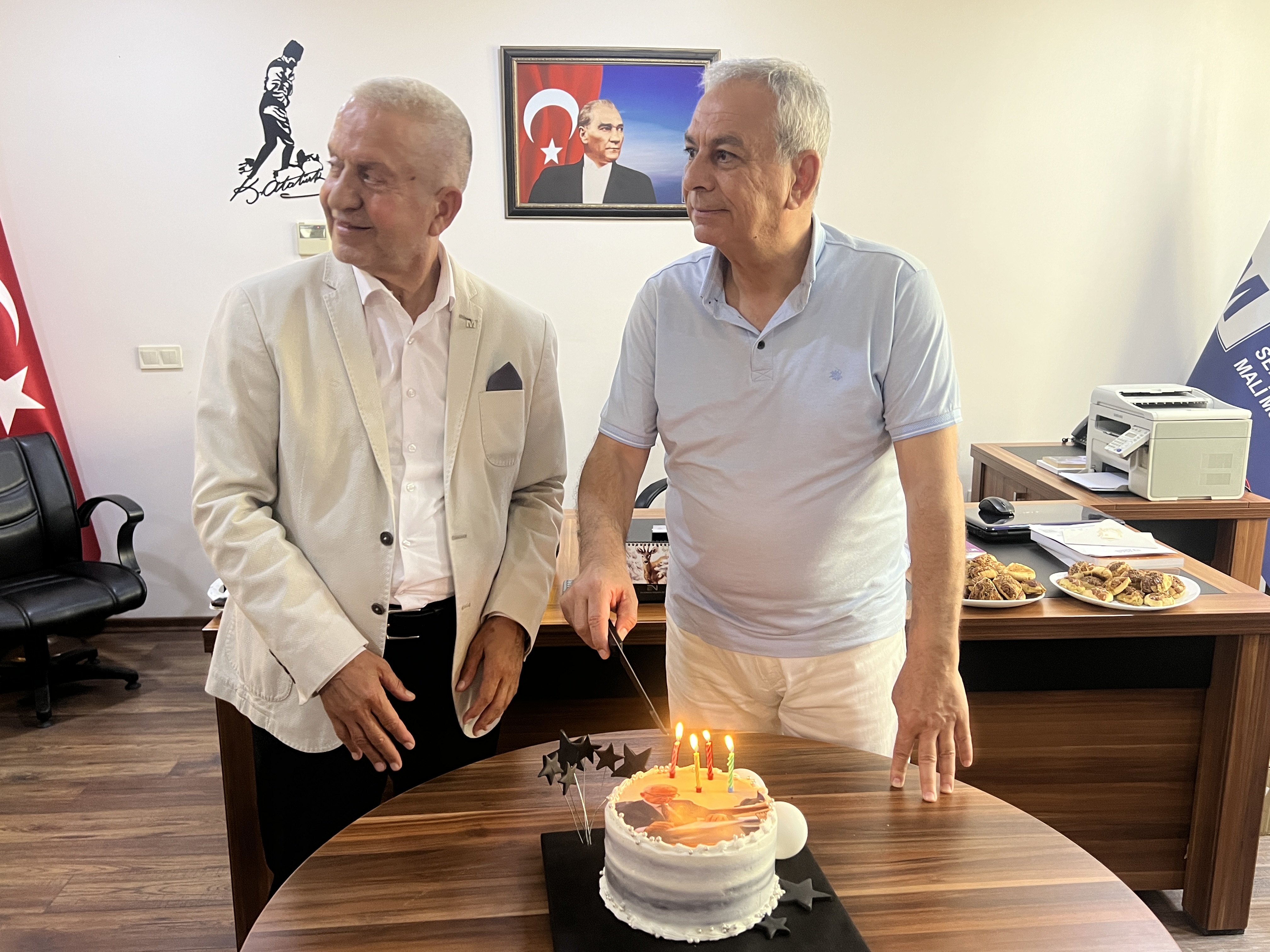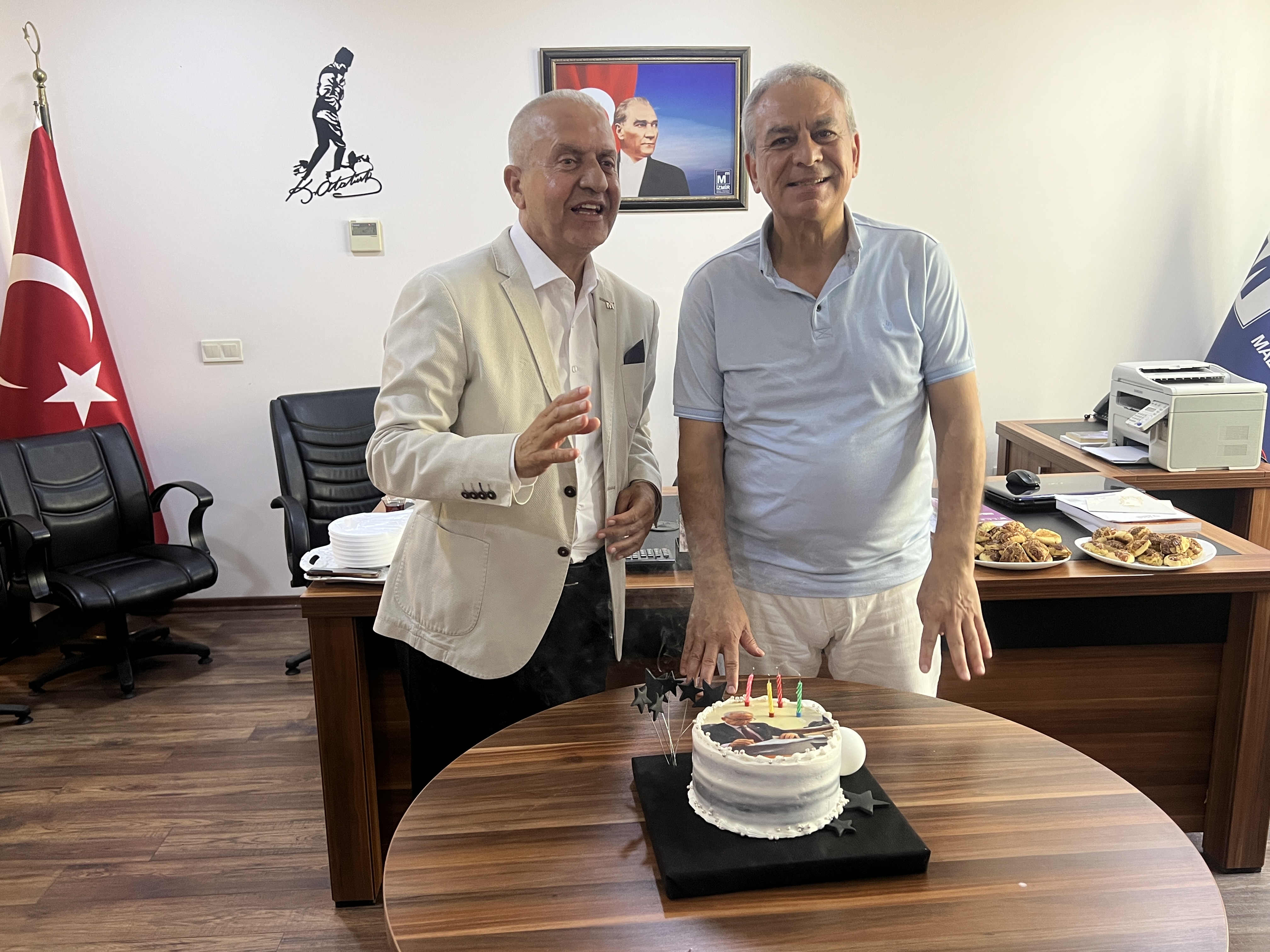 HABER: LEVENT HAMURCUOĞLUEGEMENLİK - İzmir Serbest Muhasebeci Mali Müşavirler Odası (İZSMMMO) Sekreteri ve Değişim Grubu Lideri Ali Yenidoğan’ın 62. yaş günü, İZSMMMO Yönetim Kurulu Başkanı Mehmet Kuzu’nun da katılımıyla İZSMMMO’da kutlandı.İZSMMM Oda Sekreteri Ali Yenidoğan’ın doğum gününü kutlayan İZSMMMO Başkanı Mehmet Kuzu, yeni yaşında sağlık ve mutluluk diledi. İzmir’in simge pastanelerinden Reyhan Pastanesi’nde özel olarak kendisi için hazırlanan resimli doğum günü pastasını kesen İZSMMMO Sekreteri Ali Yenidoğan’ın doğum gününe İZSMMMO Disiplin Kurulu Başkan Yardımcısı Pervil Koç, Değişim Grubu Üyeleri ile birlikte çok sayıda mali müşavir katıldı.İzmir Serbest Muhasebeci Mali Müşavirler Odası Yönetim Kurulu Başkanı Mehmet Kuzu, “İZSMMMO ailesi olarak, Oda Sekreterimiz Ali Yenidoğan’ın yeni yaşını tekrar kutluyor; mutluluk ve başarılar diliyoruz” ifadelerini kullandı.Sürpriz doğum günü ziyaretinden duyduğu memnuniyeti dile getiren Ali Yenidoğan da, “Bu nazik ziyaretleriyle bizleri onurlandıran ve doğum günümü kutlayan birbirinden kıymetli değerli arkadaşlarıma teşekkür ediyorum. Sevdamız olan İzmir Mali Müşavirler Odası için onlarla birlikte çalışmayı sürdürmeye devam edeceğiz” açıklamasında bulundu.