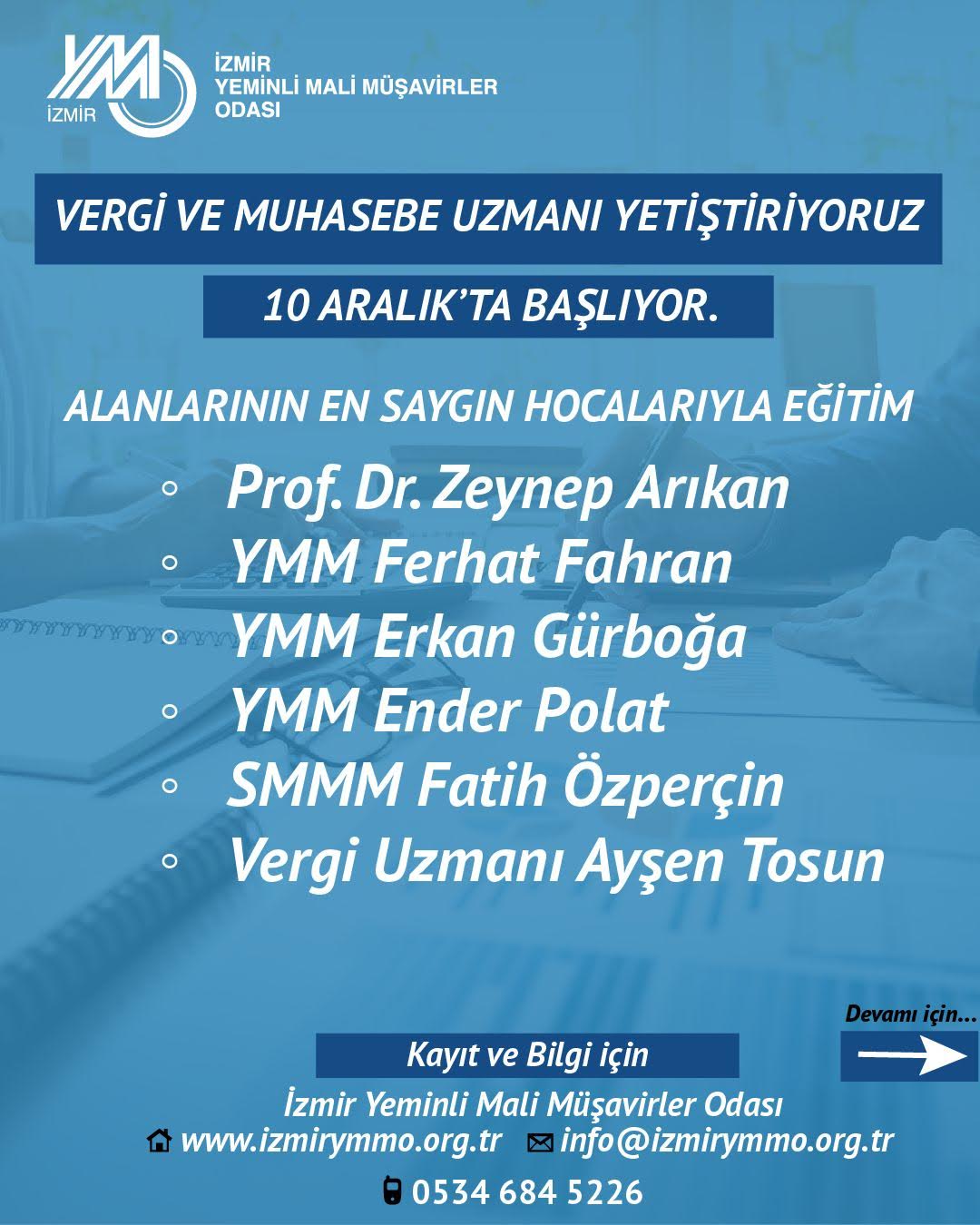 Şirketlerde çalışan muhasebe personeli, vergi sorumluları, mali işler çalışanları ve kariyerine güçlü bir başlangıç yapmak isteyen genç profesyonellerin hedeflendiği program için kayıt ve detaylı bilgi İzmir Yeminli Mali Müşavirler Odası’nın internet sitesinde bulunuyor.