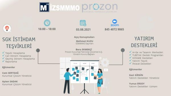 “Sosyal Güvenlik Kurumu (SGK) İstihdam Teşvikleri ile Yatırım Destekleri” kapsamında İzmir Serbest Muhasebeci ve Mali Müşavirler Odası (İZSMMMO) ile Prozon Kurumsal Teknoloji Çözümleri A.Ş.'nin ortaklaşa düzenlediği ve zoom üzerinden yapılan online toplantıya çok sayıda mali müşavir katıldı. Oda üyelerine "Sosyal Güvenlik Kurumu tarafından verilen teşvikler nelerdir?, Teşviklerden Kimler Faydalanabilir?, Ne kadar teşvik alabilirim?" konuları hakkında ayrıntılı bir bilgilendirme toplantısı düzenlendi.