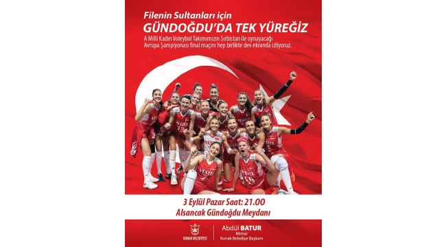 A Milli Kadın Voleybol Takımı ve Sırbistan ile oynayacağı final maçı 3 Eylül Pazar (bugün) tarihinde 21.00’de başlayacak. İzmirliler final maçını Konak Belediyesi’nin Alsancak Gündoğdu Meydanı’nda kurduğu dev ekranda hep birlikte izleyecek, şampiyonluk için tek yürek olacak.