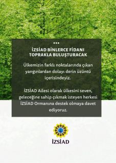 İzmir Sanayici ve İş insanları Derneği (İZSİAD), son günlerde ciğerlerimizi yakan, geleceğimizi yok eden orman yangınlarına karşı binlerce fidan dikme kararı aldı. Türkiye’nin farklı illerinde günlerdir yanan ormanlar için bütün üyelerini göreve çağıran İZSİAD binlerce fidanı toprakla buluşturacak.