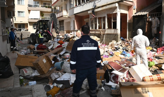 Çöp evde yürütülen temizlik çalışmalarına Karabağlar Belediyesi ekipleri yoğun bir şekilde katılmıştır. Çalışmalarda 35 personel, 2 kamyon ve 1 kepçe görev alırken, Karabağlar Belediyesi Arama Kurtarma Ekibi KAR-KUT’tan bir personel de çalışmalara destek vermiştir.