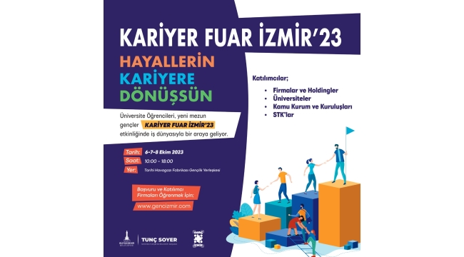 İzmir Büyükşehir Belediyesi Sosyal Projeler Dairesi Başkanlığı Gençlik Çalışmaları ve Sosyal Projeler Şube Müdürlüğü koordinasyonunda 6-8 Ekim 2023 tarihlerinde Alsancak Tarihi Havagazı Fabrikası Gençlik Yerleşkesi’nde “Kariyer Fuar İzmir’23” etkinliği yapılacak. “Hayallerin Kariyere Dönüşsün” sloganıyla nitelikli işgücü ile iş dünyasını buluşturacak Kariyer Fuarı, İzmir’de yaşayan 18-35 yaş arası üniversite öğrencisi ve mezunu genç grubuna sesleniyor. Fuar 10.00 – 18.00 saatleri arasında ücretsiz ziyaret edilebilecek. Başvuru ve katılımcı firmaları görmek için gencizmir.com adresi ziyaret edilebilir. Nitelikli işgücü ile buluşma fırsatı