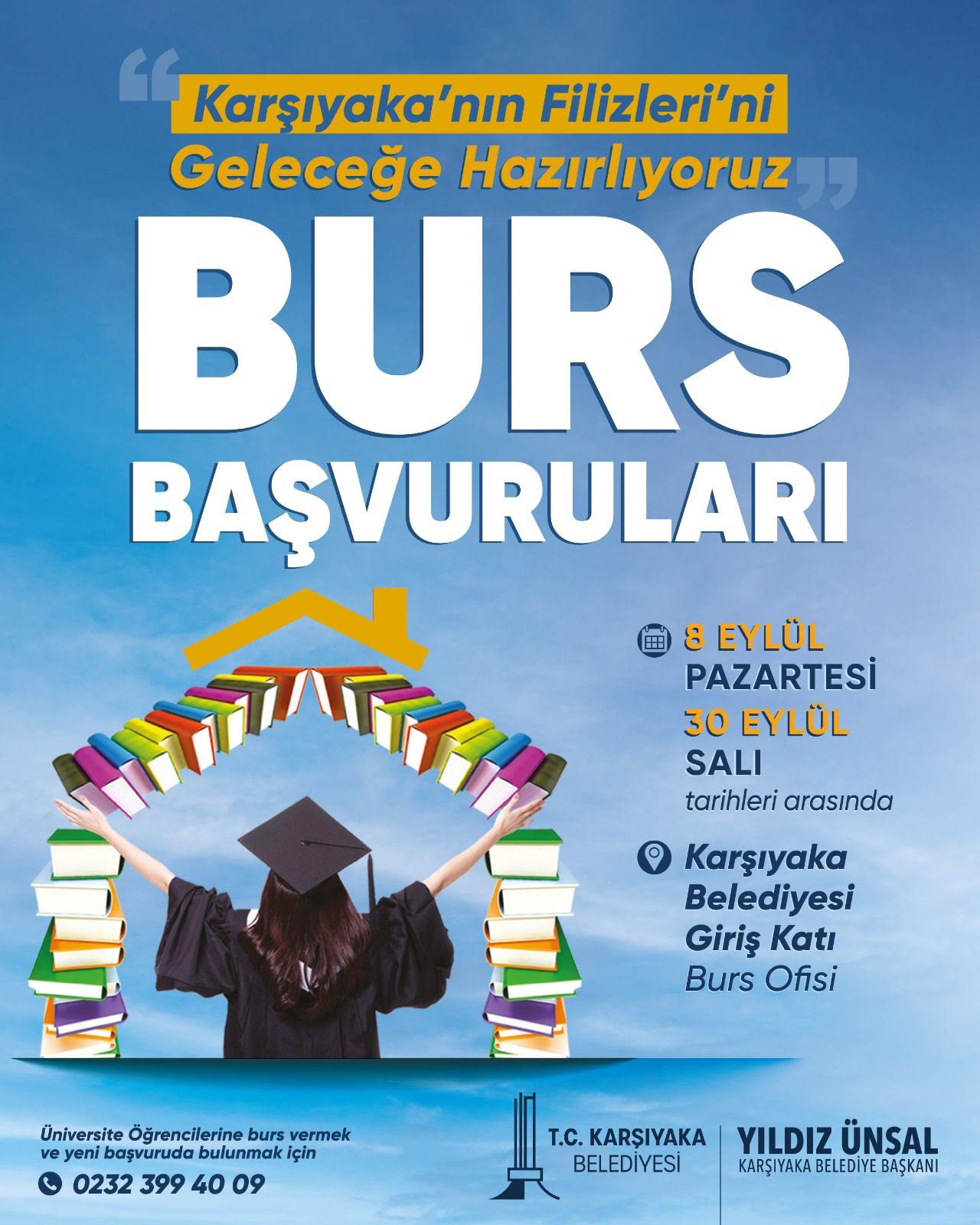 YENİ DÖNEM BAŞVURULARI BAŞLADIÖte yandan Karşıyaka’nın Filizleri projesi kapsamında, 2025-2026 akademik yılı için bursiyer başvuruları 8 Eylül itibarıyla başladı. Karşıyaka’da ikamet eden ve burs almak isteyen öğrenciler, 30 Eylül Salı gününe kadar Karşıyaka Belediyesi giriş katında bulunan proje ofisinden başvuruda bulunabilecek. Başvuruların ardından belediye personelleri tarafından öğrencilerin ve ailelerinin ekonomik durumuna ilişkin değerlendirme yapılacak. Uygun görülen öğrenciler, aylık 2.000 TL burs desteği alacak. Projeye katkı sunmak isteyen vatandaşlar da yıl boyunca belediyeye başvurarak Karşıyaka’nın Filizleri Projesi’nin destekçisi olabiliyor. Destek veren apartman ve iş yerlerine teşekkür plaketi takdim ediliyor. Detaylı bilgi almak isteyenler, 0232 399 40 09 numaralı telefondan Karşıyaka Belediyesi’ne ulaşabiliyor.