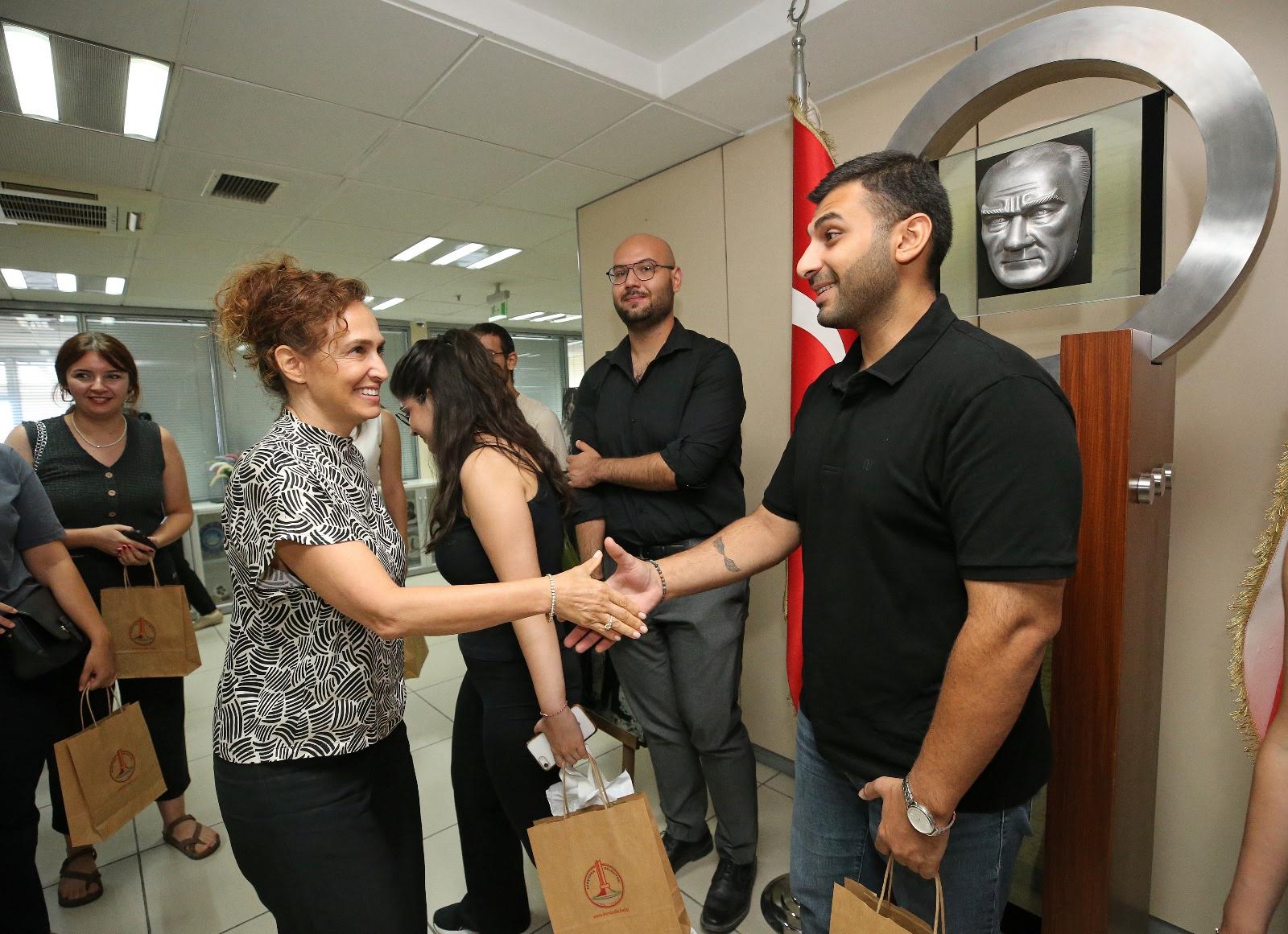 EGEMENLİK - Karşıyaka Belediyesi’nin örnek sosyal sorumluluk projesi ‘Karşıyaka’nın Filizleri’, üniversite öğrencilerinin eğitim yaşamına ışık olmaya devam ediyor. Proje kapsamında hayırseverlerin verdiği burs desteğiyle eğitimlerini tamamlayan 79 genç, Karşıyaka Belediye Başkanı Yıldız Ünsal’ı ziyaret etti. Mezuniyetleri için konuklarını kutlayan ve Nutuk hediye eden Başkan Ünsal, kendi eğitim ve iş yaşamına dair anılarını paylaşarak gençlere ilham verdi.