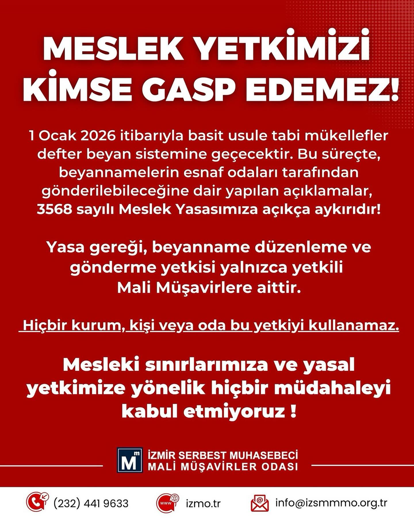 İzmir Serbest Muhasebeci Mali Müşavirler Odası olarak, mesleğimizin sınırlarına, yasal yetkilerimize ve meslek onurumuza yönelik hiçbir müdahaleyi kabul etmiyoruz.