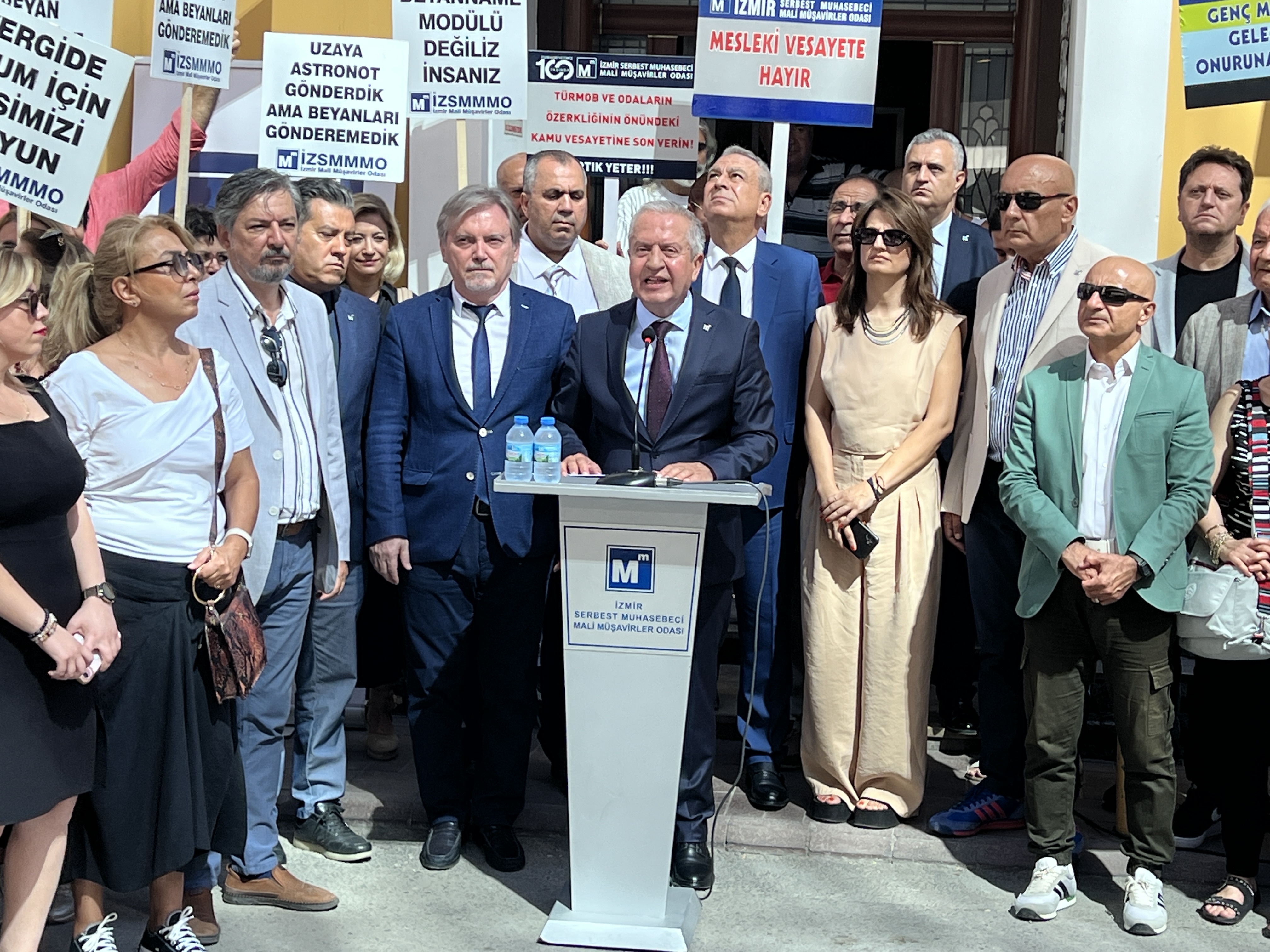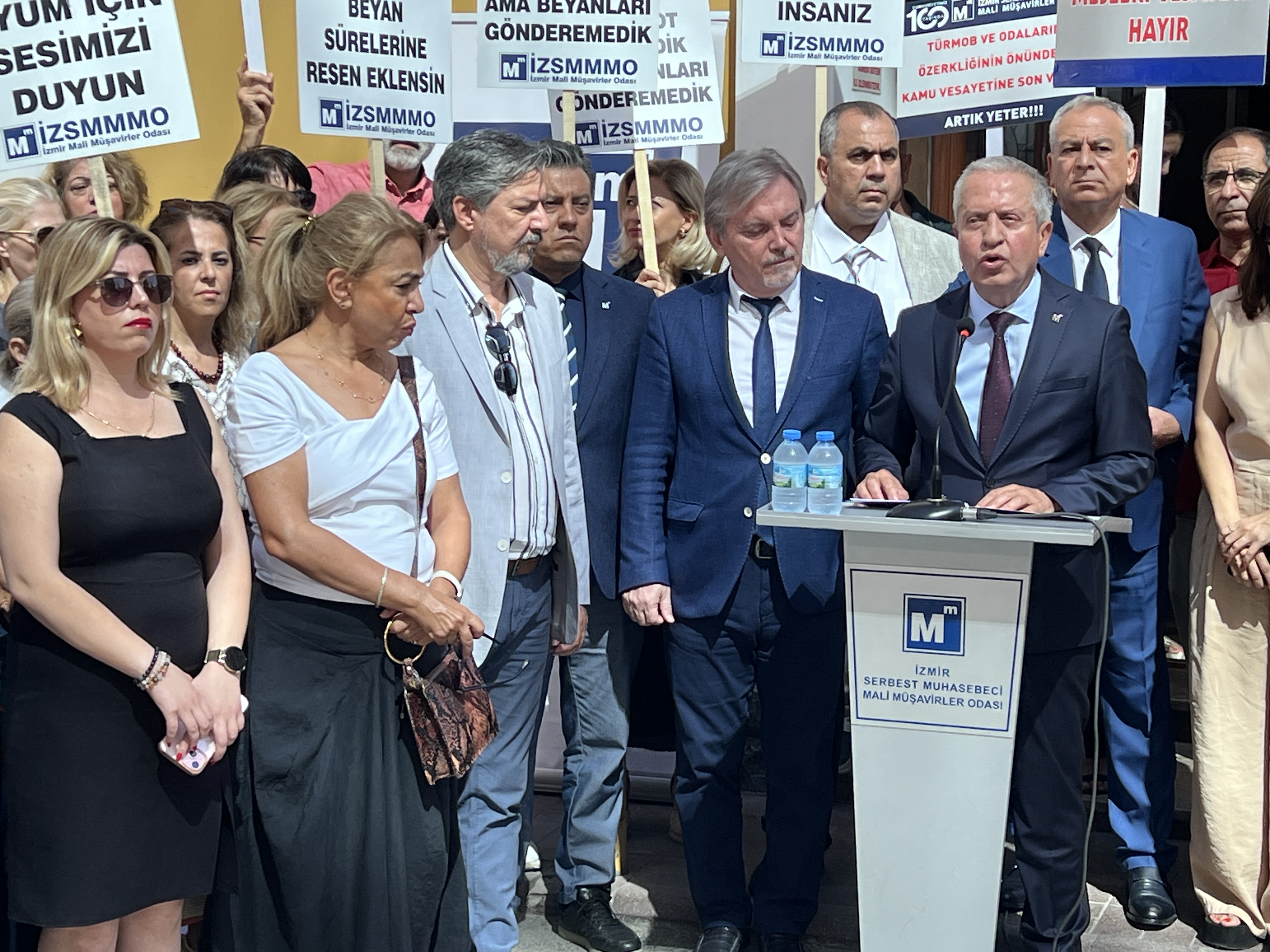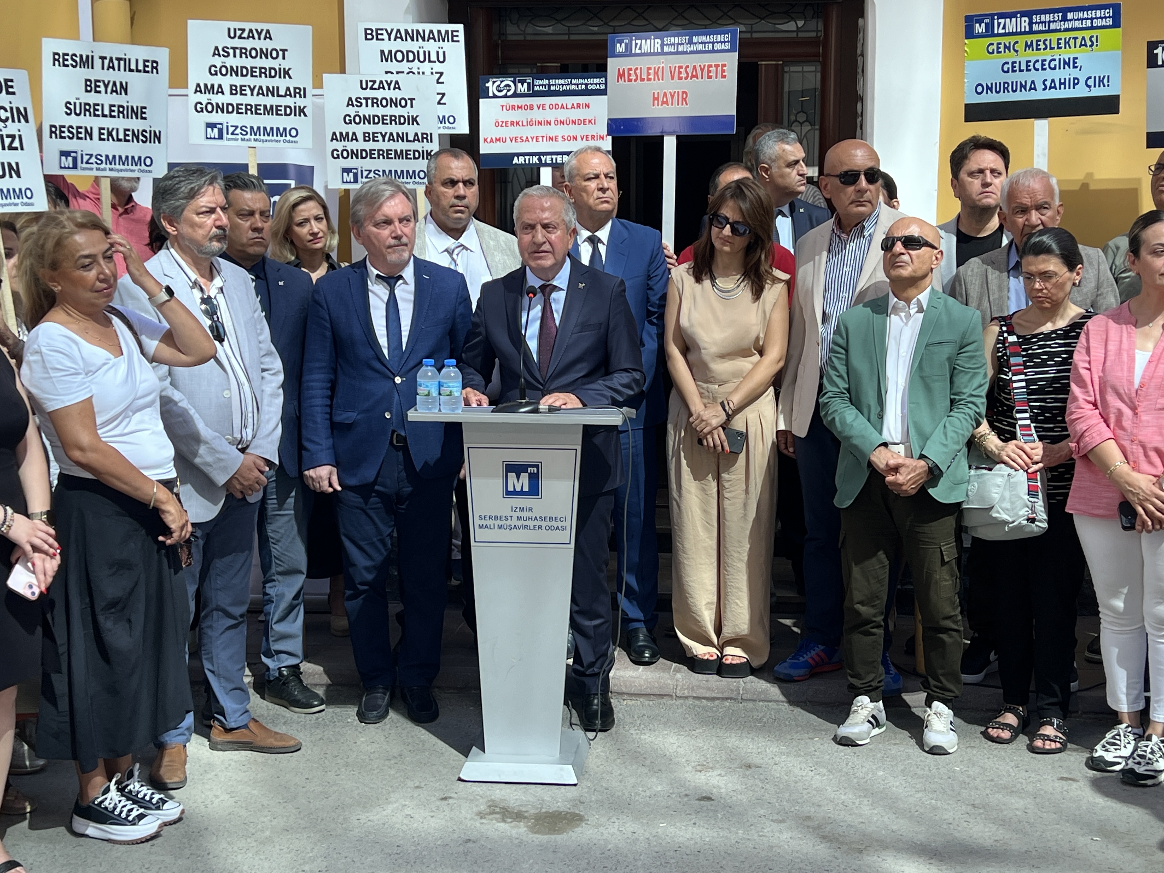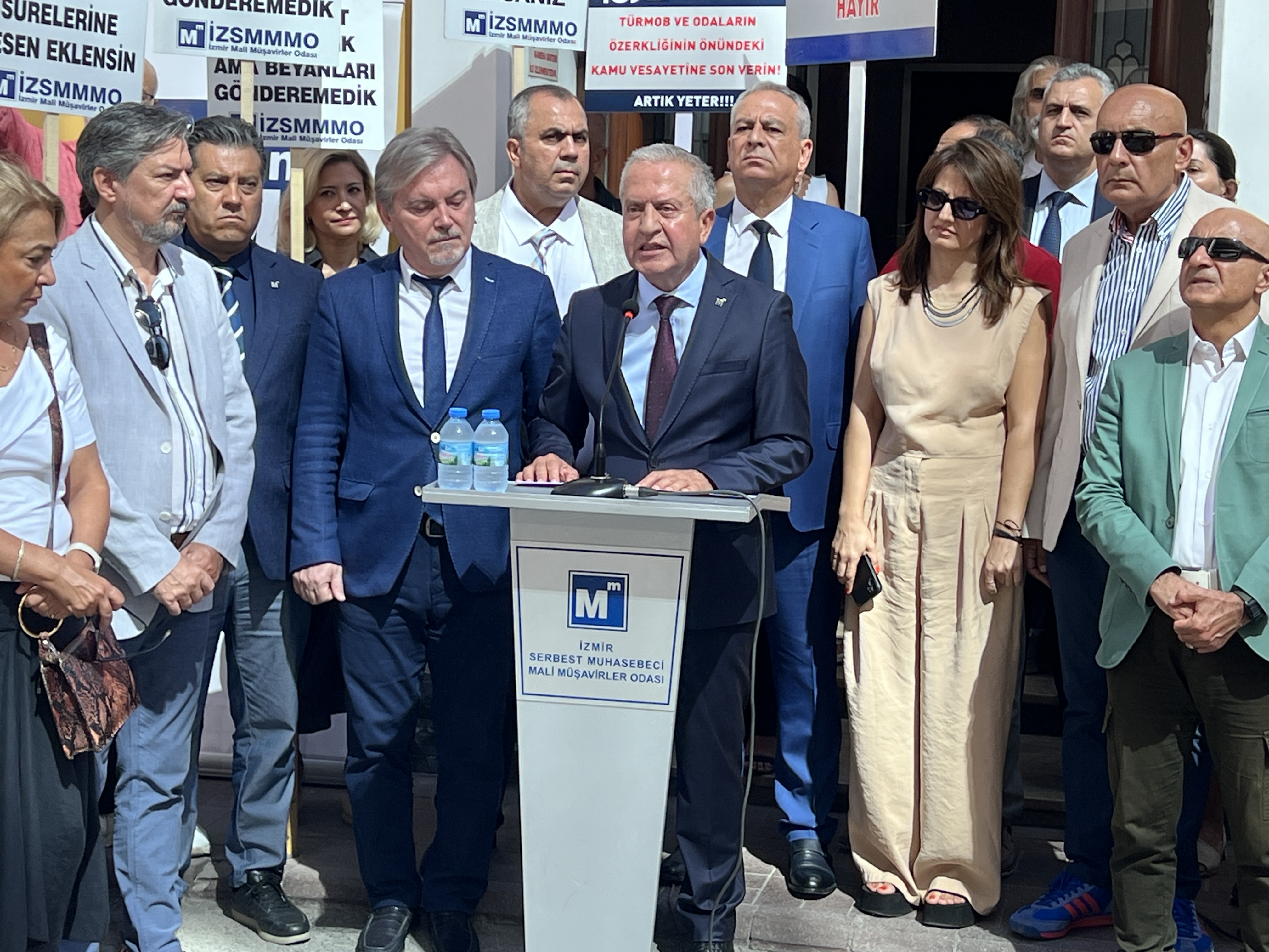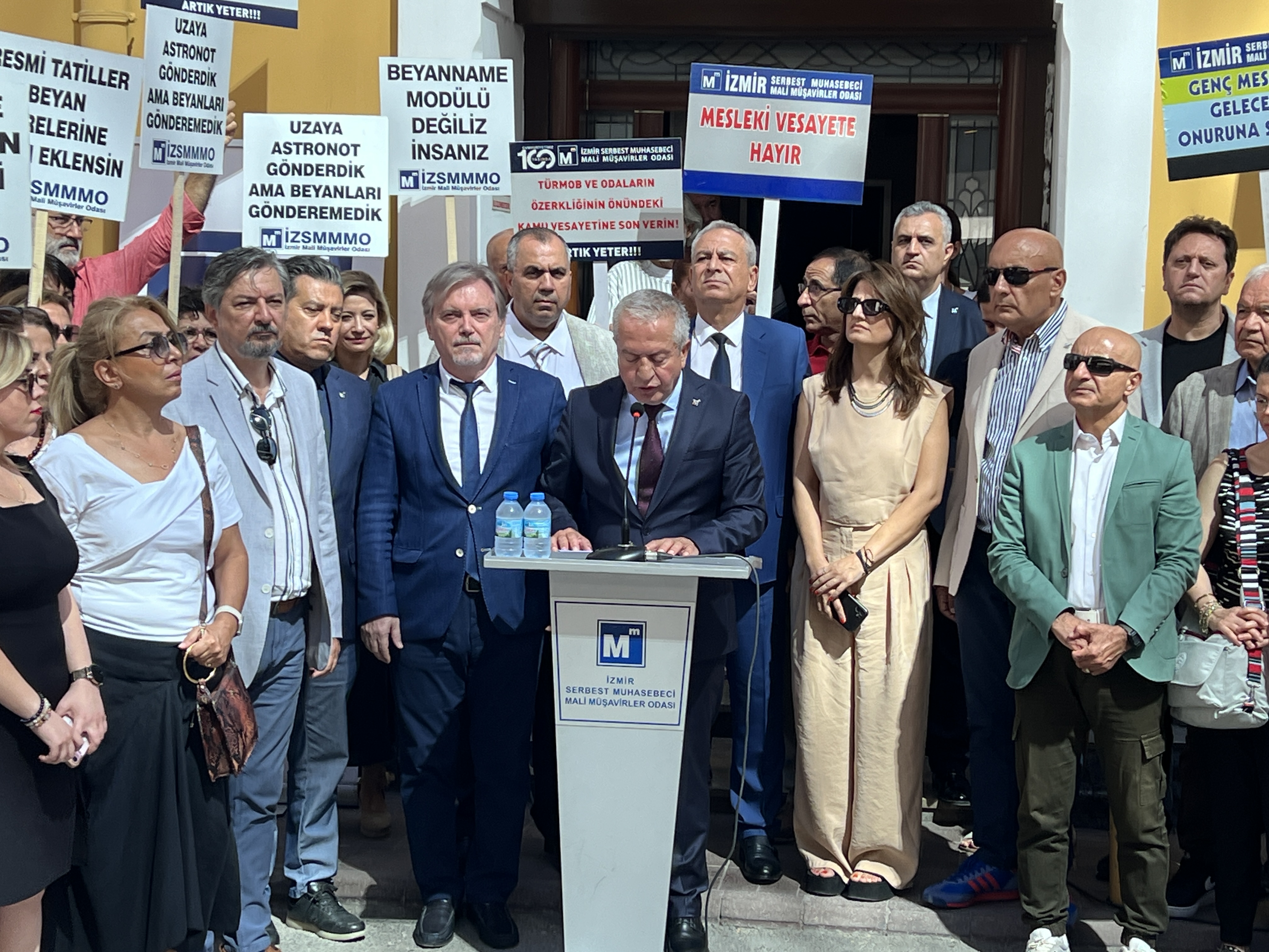 İzmir Serbest Muhasebeci Mali Müşavirler Odası (İZSMMMO) Yönetim Kurulu Başkanı Mehmet Kuzu, e-Defter uygulamasına ilişkin süreçlerdeki cezai yaptırımların ölçülü, adil ve hakkaniyetli şekilde düzenlenmesi yönündeki talepleri için basın açıklaması yaptı. İZSMMMO önünde yapılan basın açıklamasına çok sayıda mali müşavir katıldı. İZSMMMO Başkanı Kuzu, yaptığı basın açıklamasında şu görüşlere yer verdi: