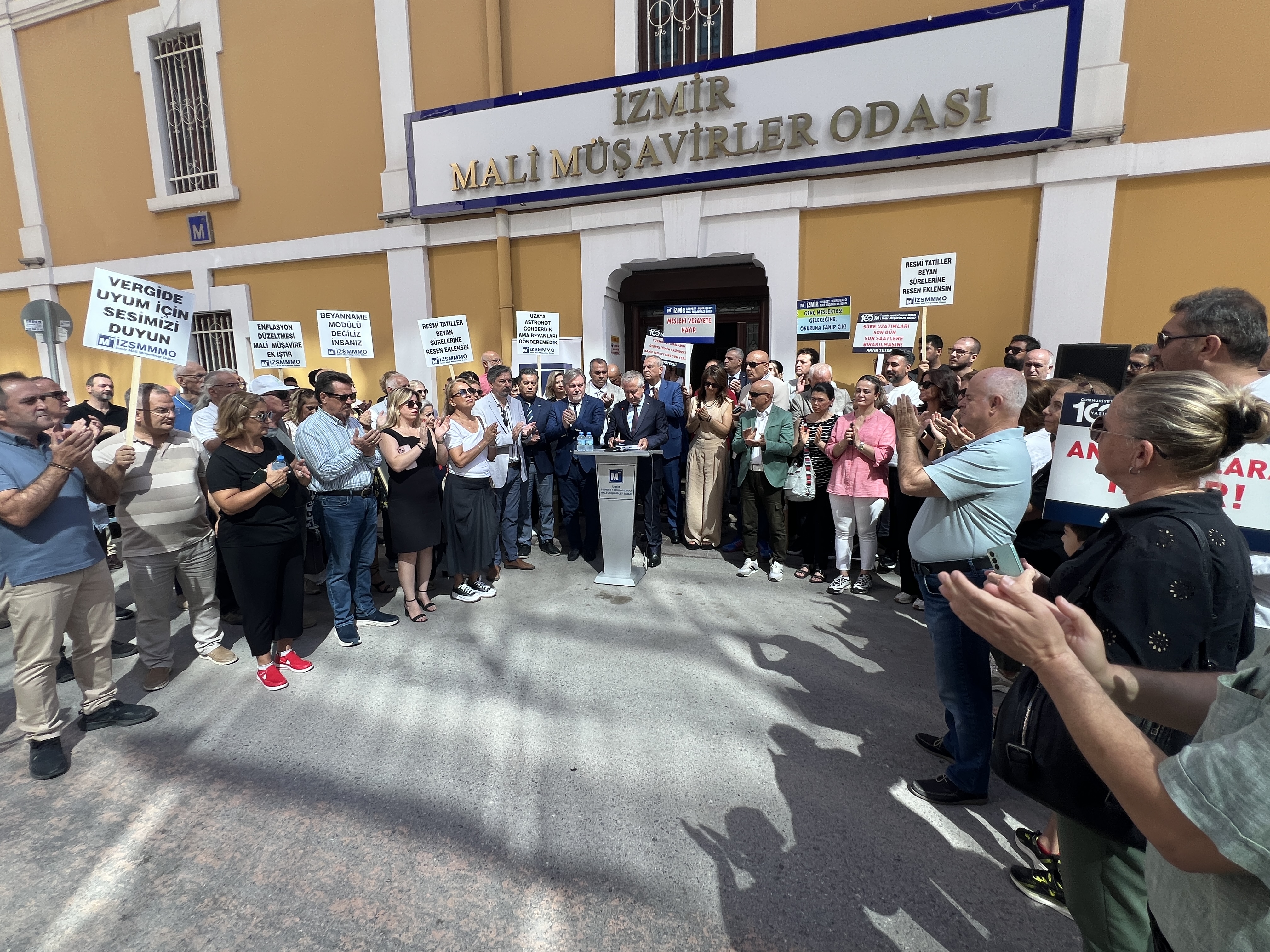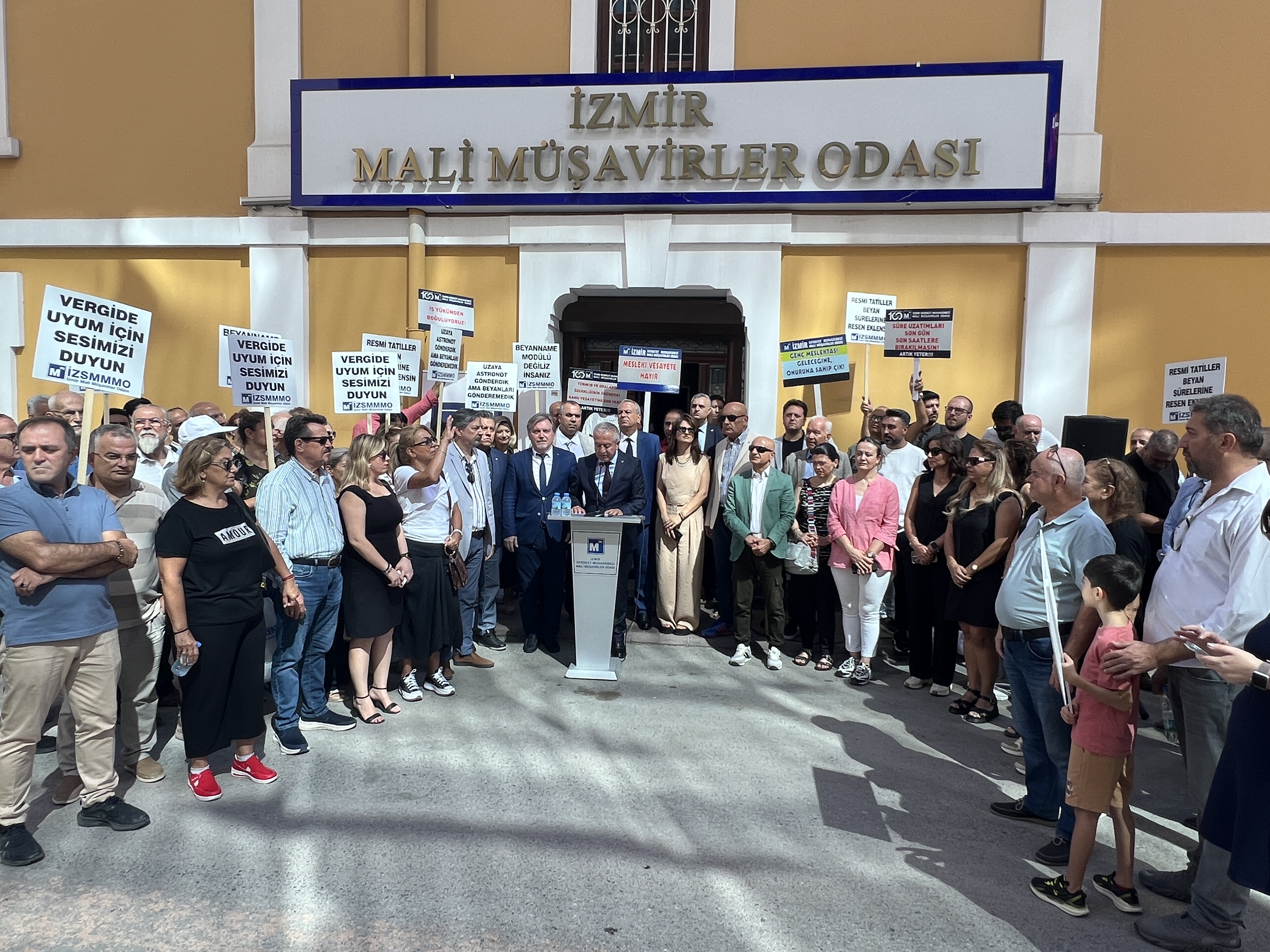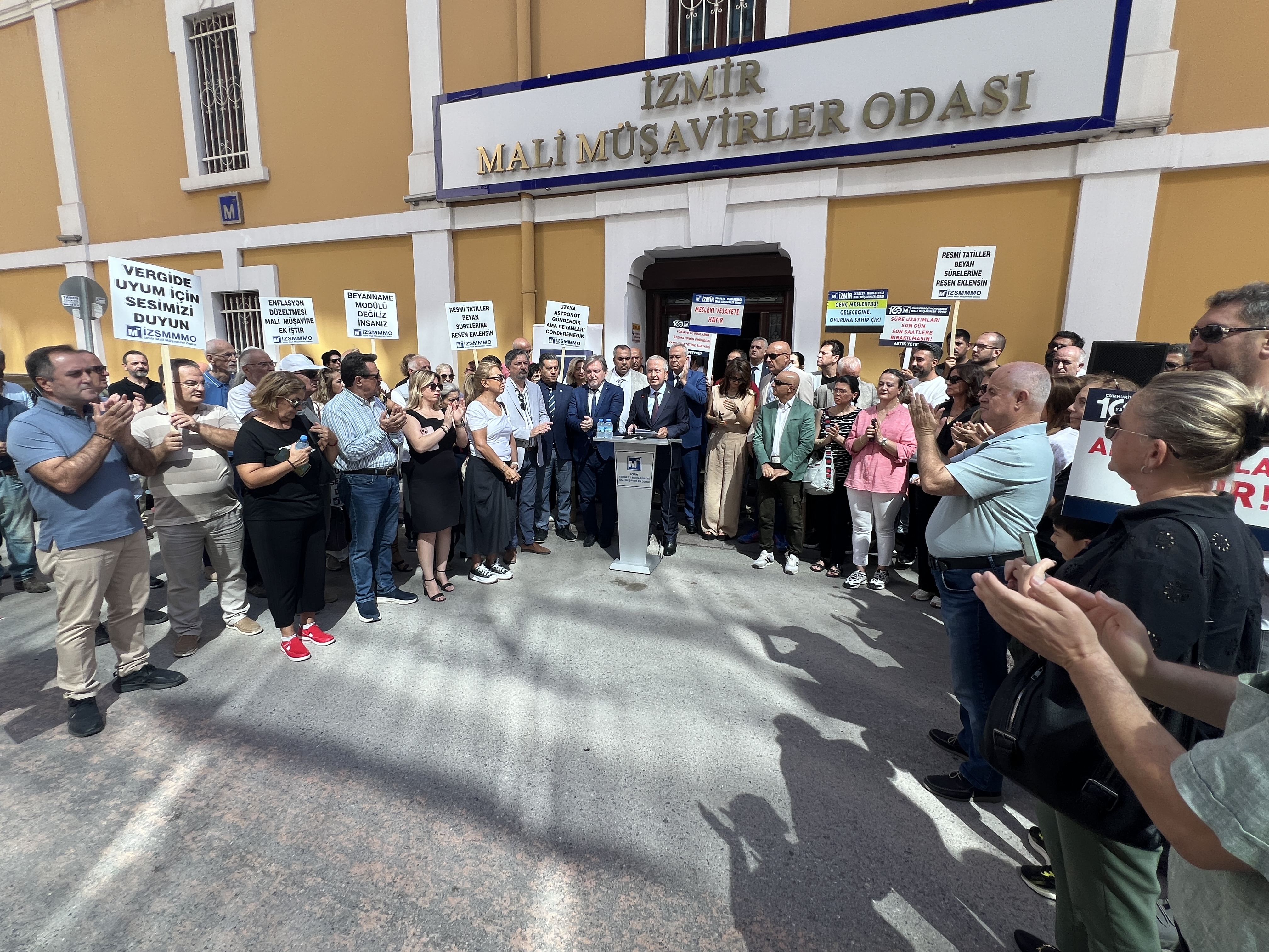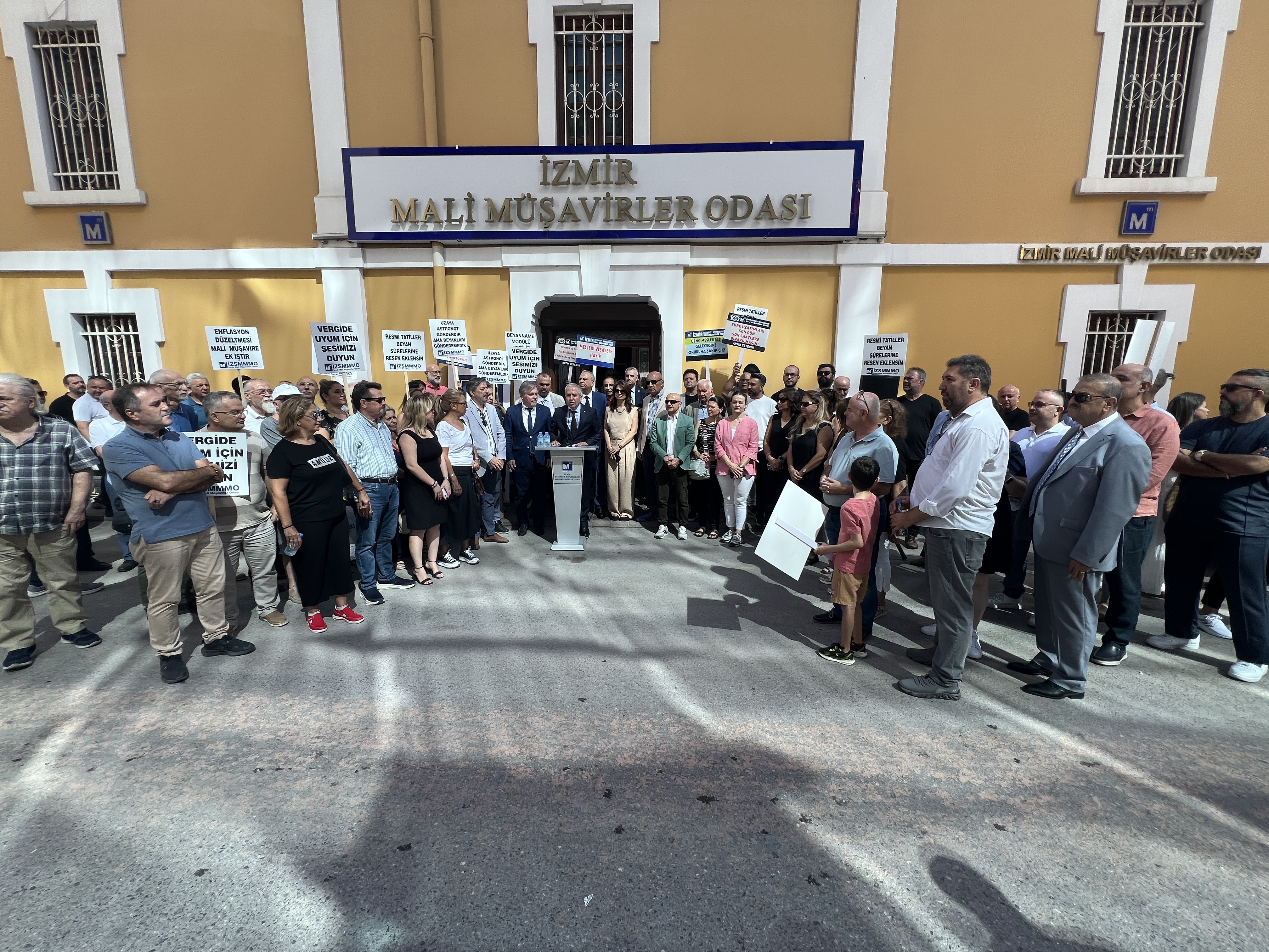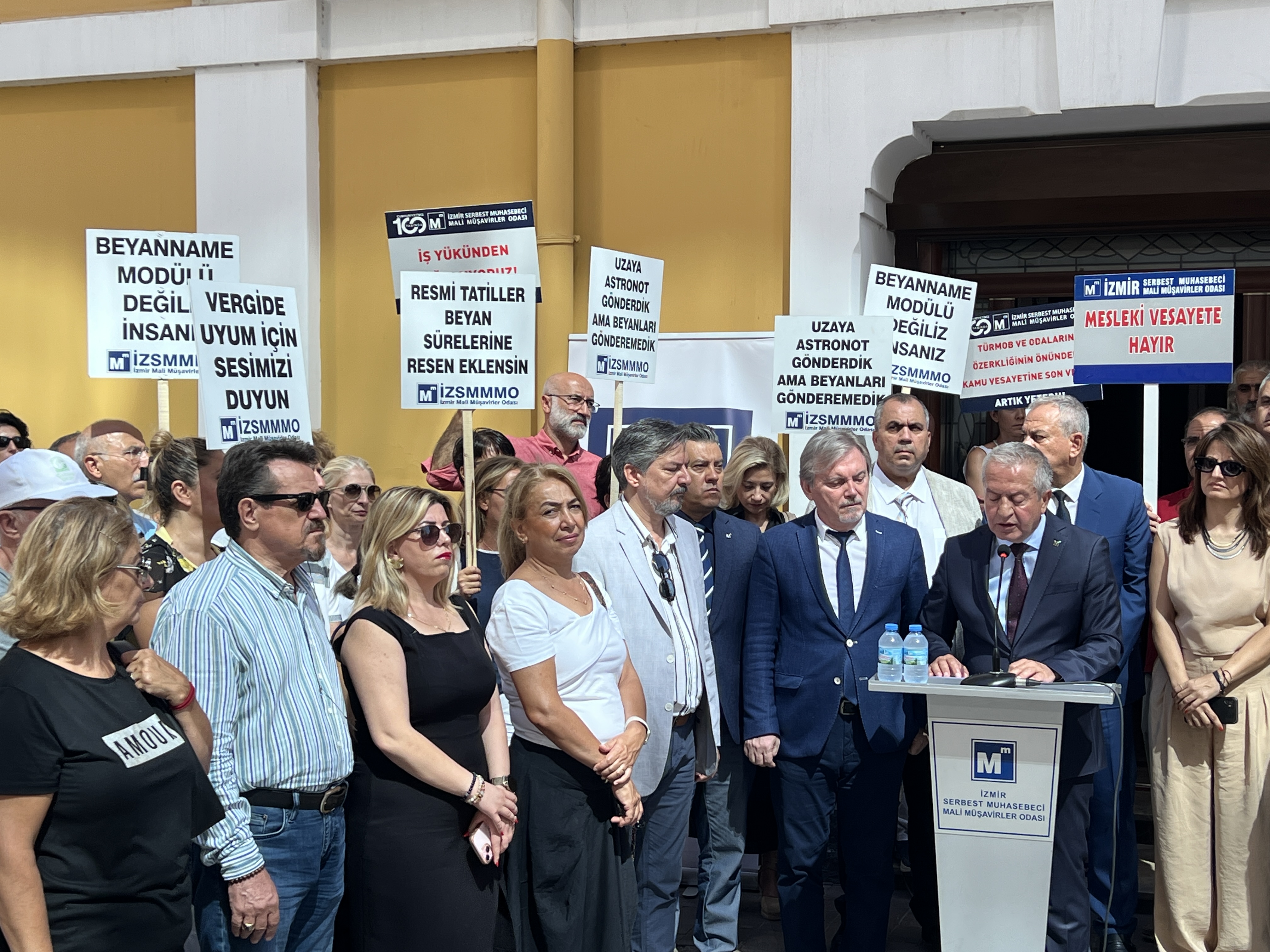İzmir Serbest Muhasebeci Mali Müşavirler Odası (İZSMMMO) Yönetim Kurulu Başkanı Mehmet Kuzu, e-Defter uygulamasına ilişkin süreçlerdeki cezai yaptırımların ölçülü, adil ve hakkaniyetli şekilde düzenlenmesi yönündeki talepleri için basın açıklaması yaptı. İZSMMMO önünde yapılan basın açıklamasına çok sayıda mali müşavir katıldı. İZSMMMO Başkanı Kuzu, yaptığı basın açıklamasında şu görüşlere yer verdi: