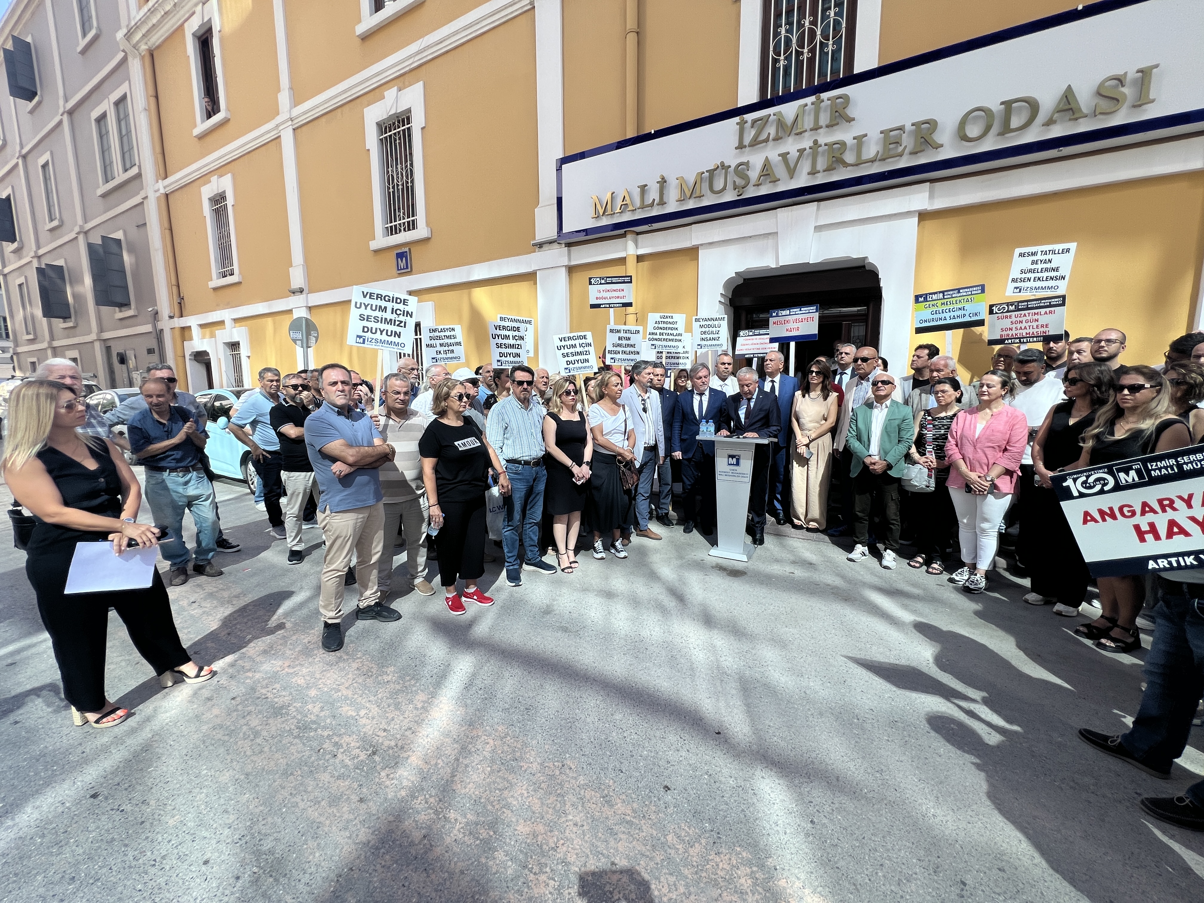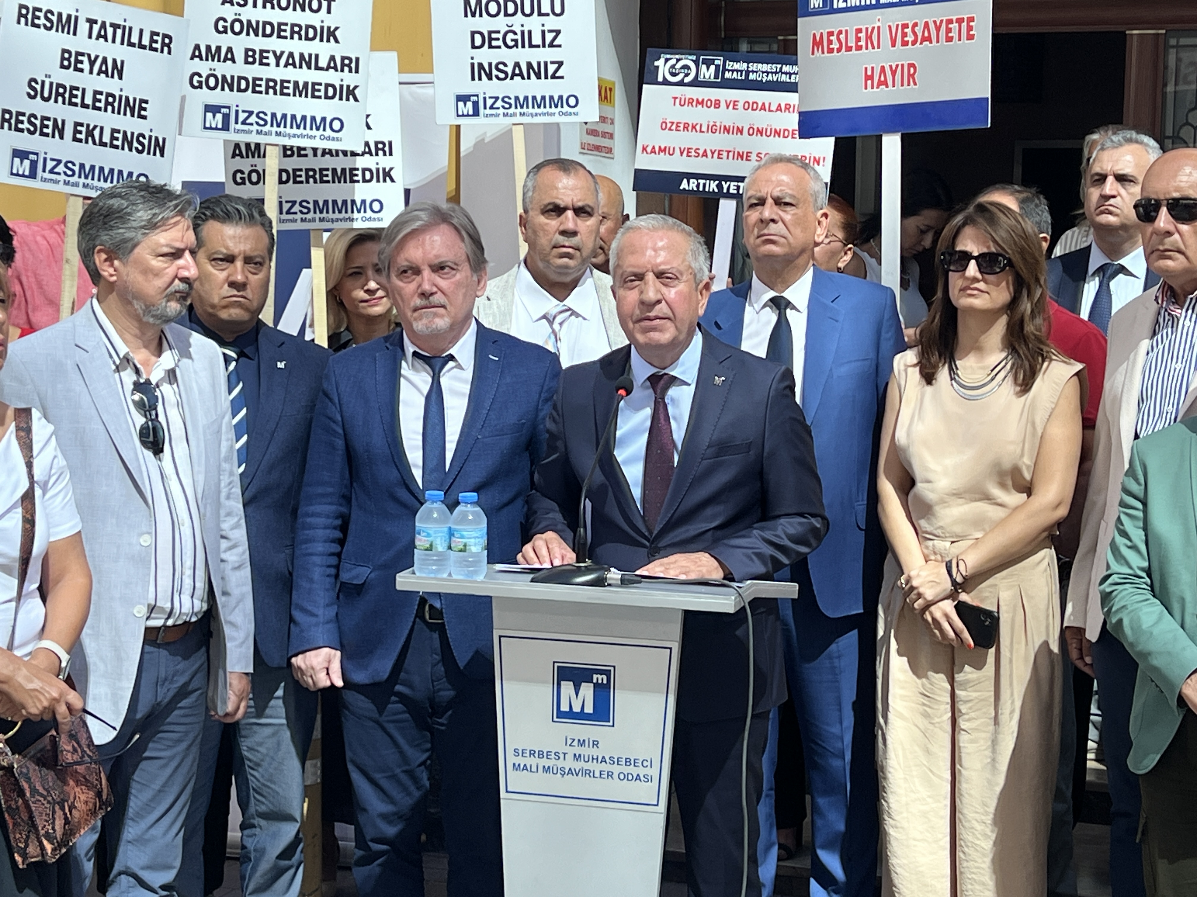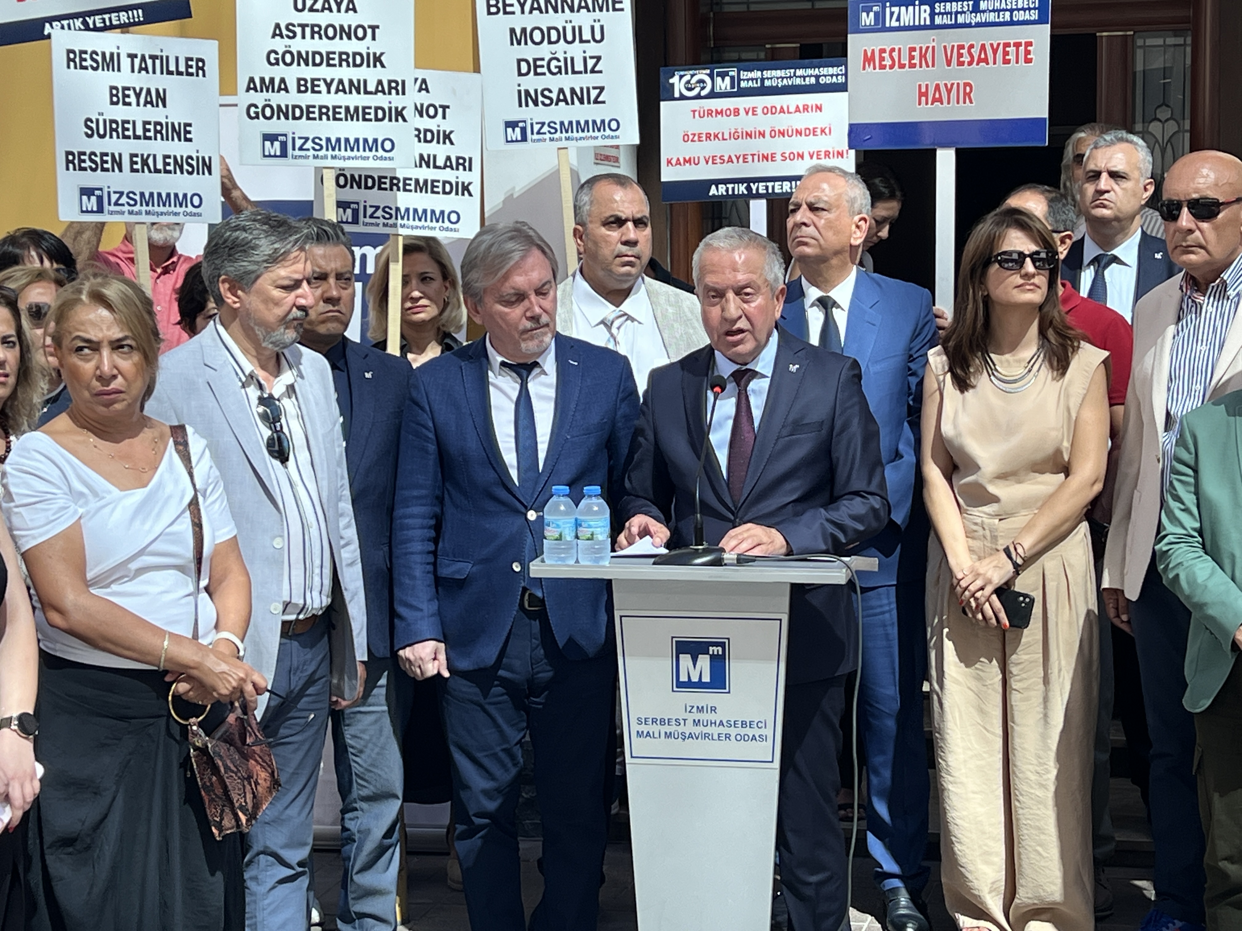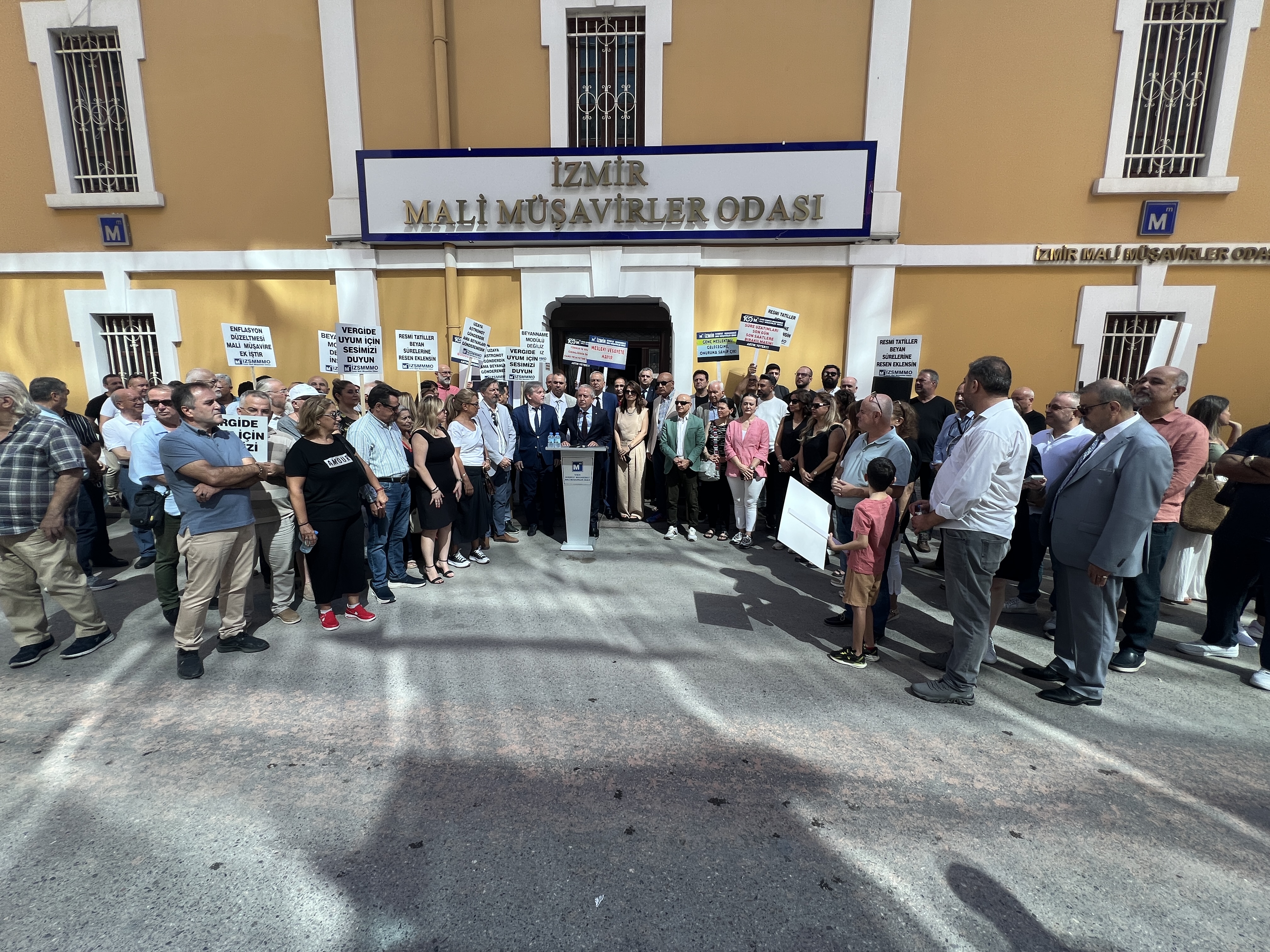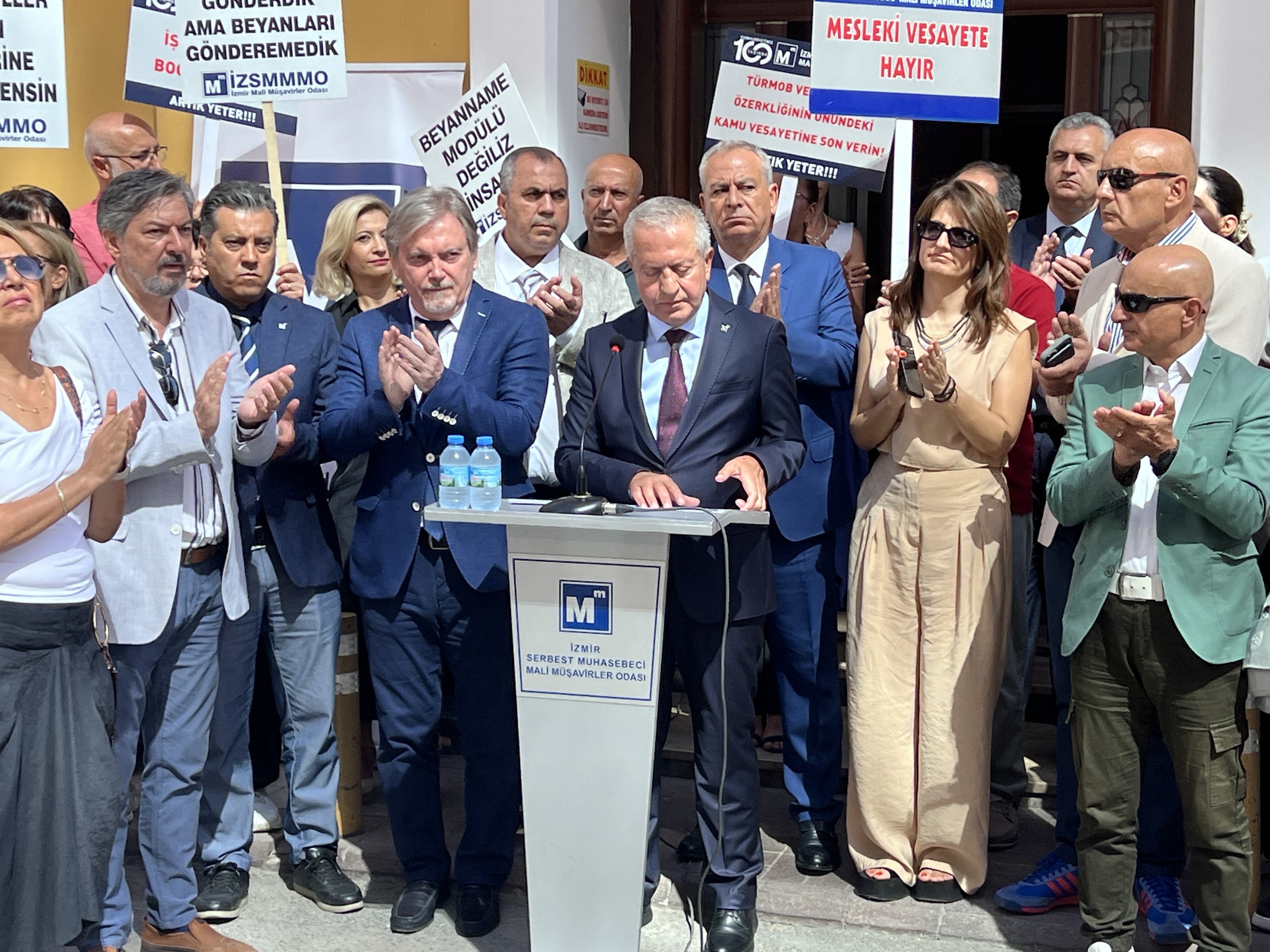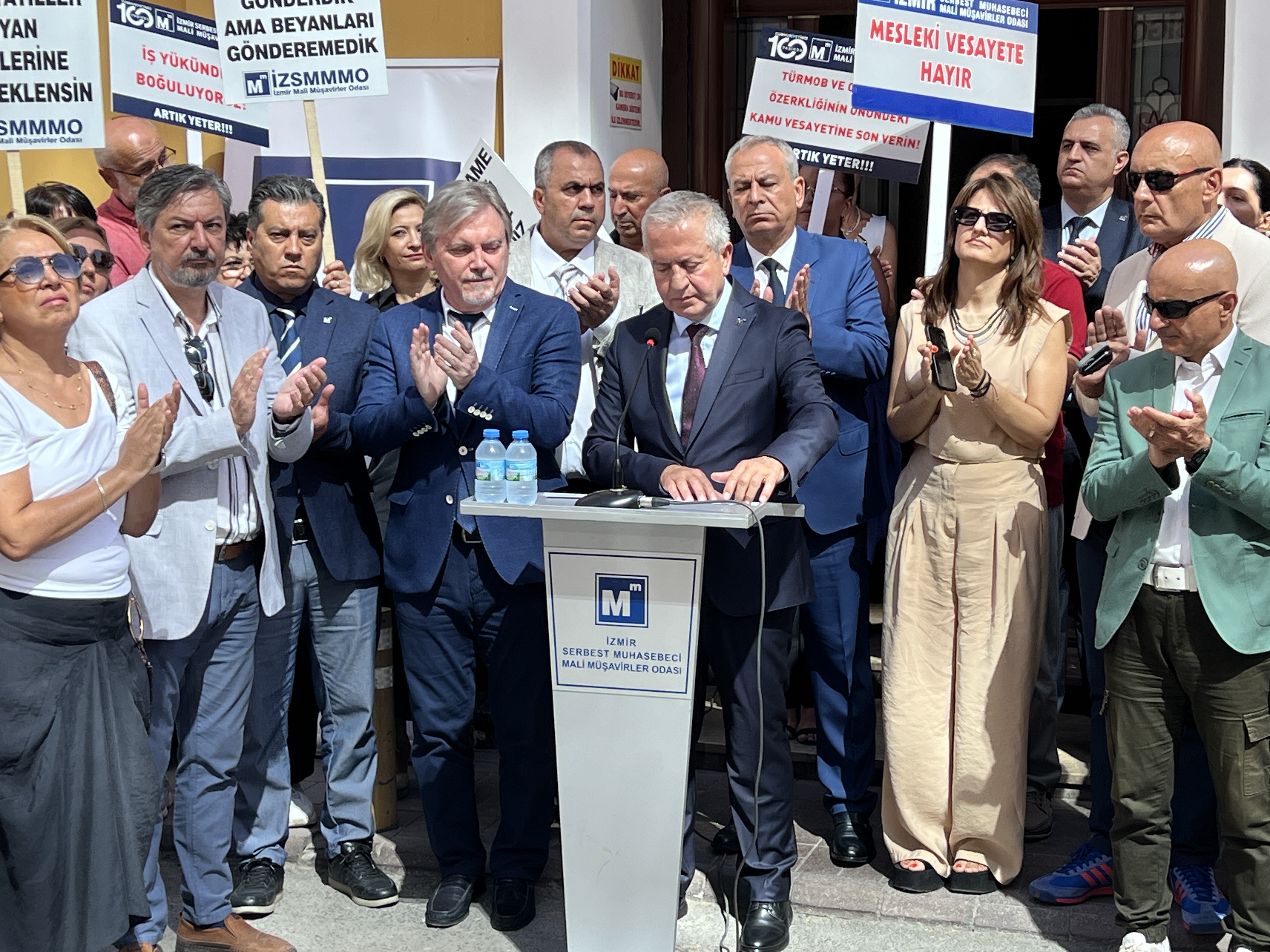 İzmir Serbest Muhasebeci Mali Müşavirler Odası (İZSMMMO) Yönetim Kurulu Başkanı Mehmet Kuzu, e-Defter uygulamasına ilişkin süreçlerdeki cezai yaptırımların ölçülü, adil ve hakkaniyetli şekilde düzenlenmesi yönündeki talepleri için basın açıklaması yaptı. İZSMMMO önünde yapılan basın açıklamasına çok sayıda mali müşavir katıldı. İZSMMMO Başkanı Kuzu, yaptığı basın açıklamasında şu görüşlere yer verdi: